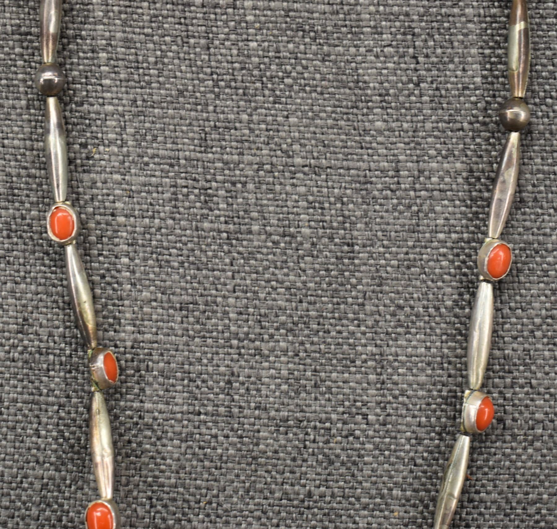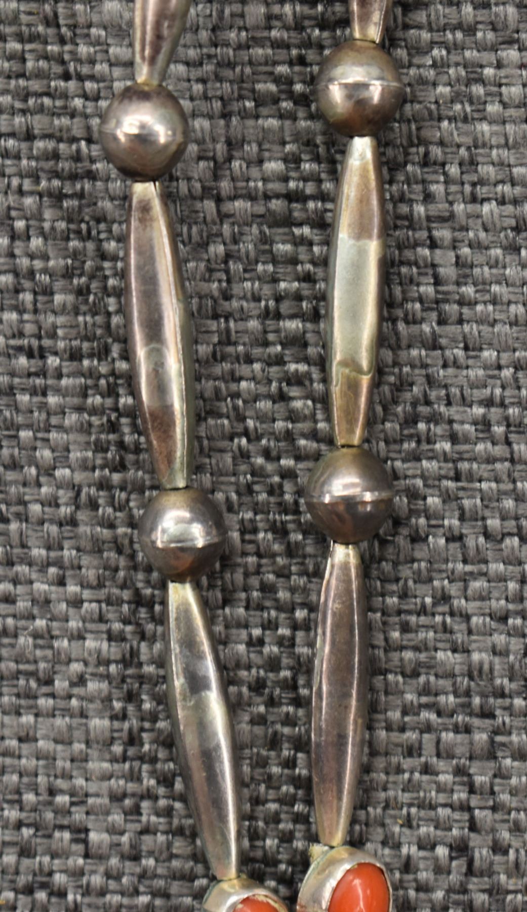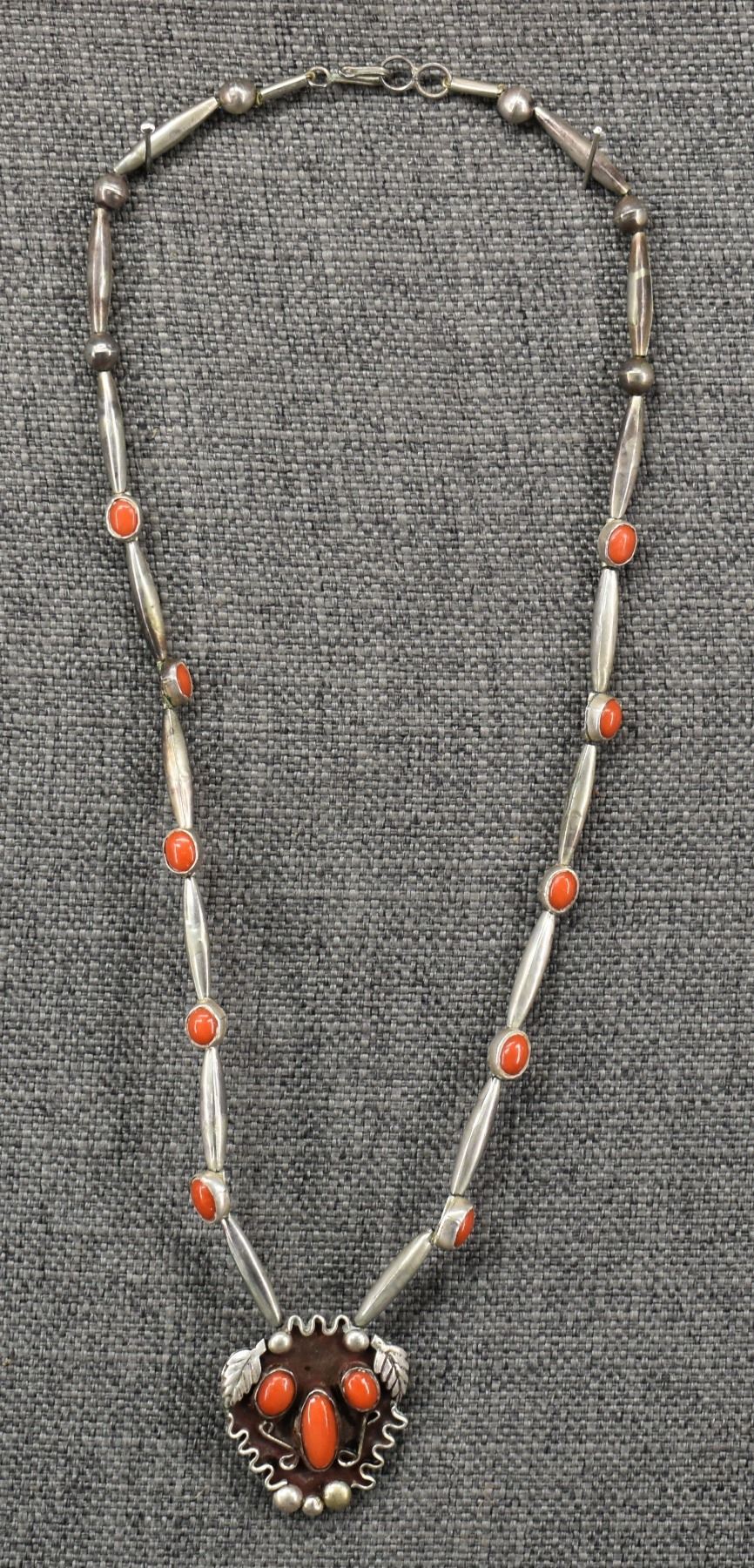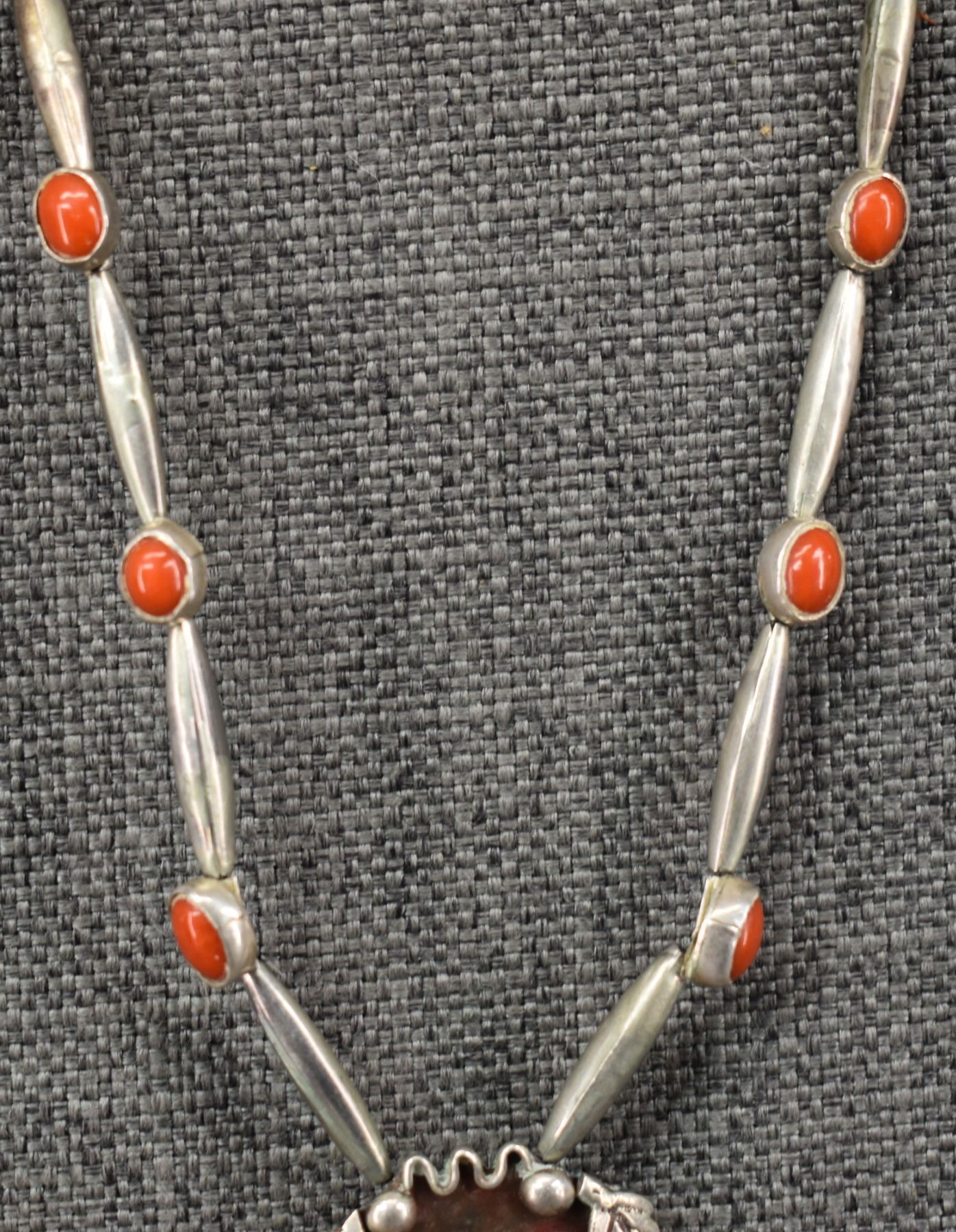 1970's Navajo, single strand of Sterling silver and coral beads 23" long with pendant 1.75" x 1.5". Total weight 43 grams