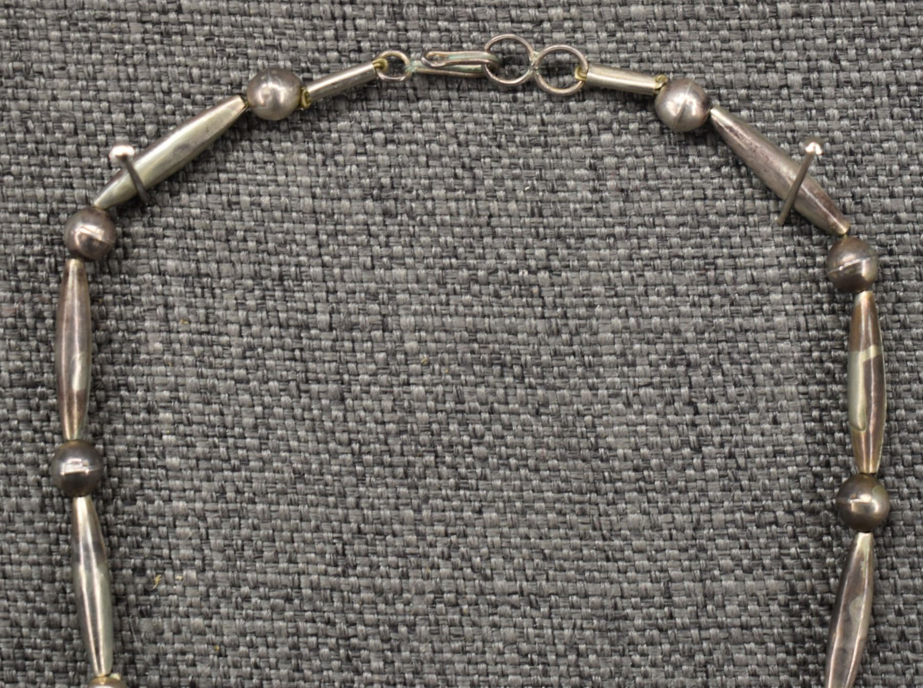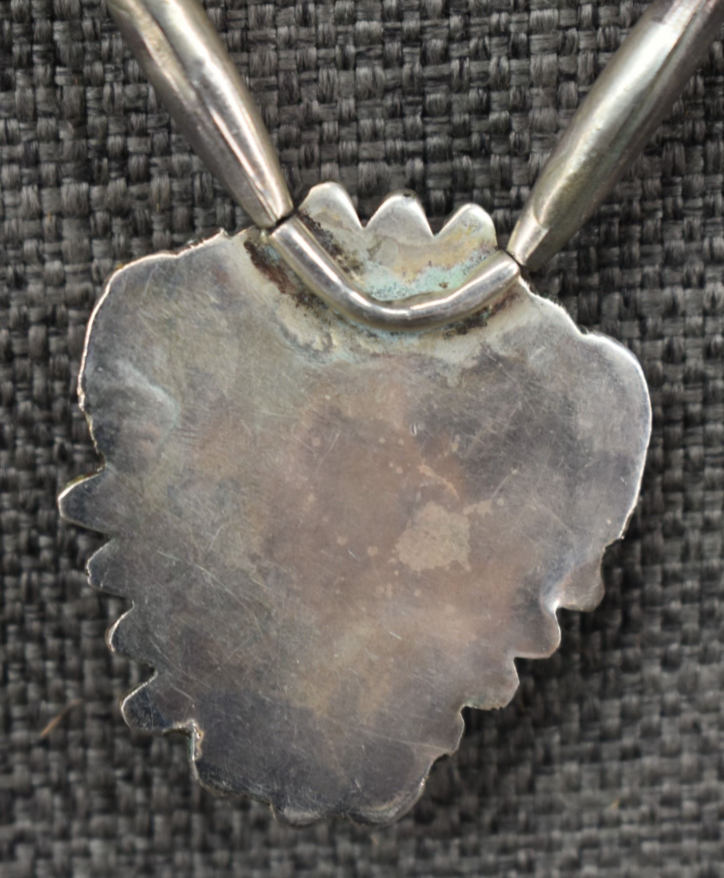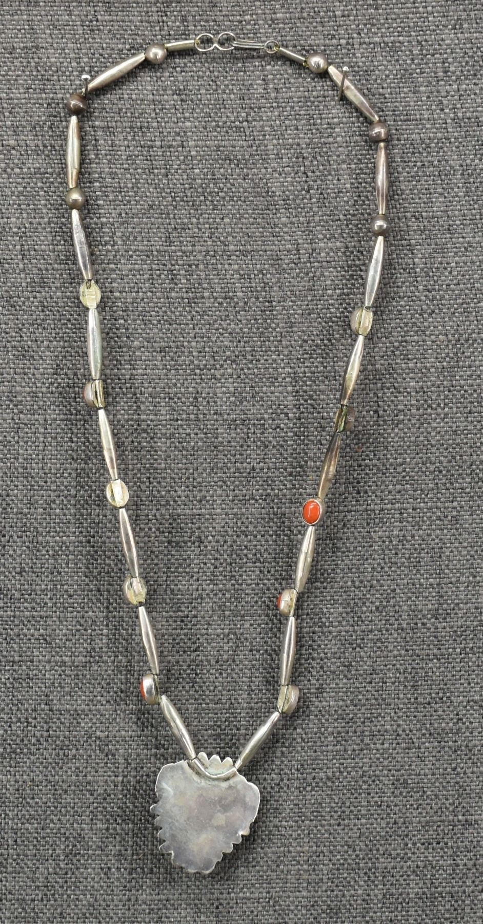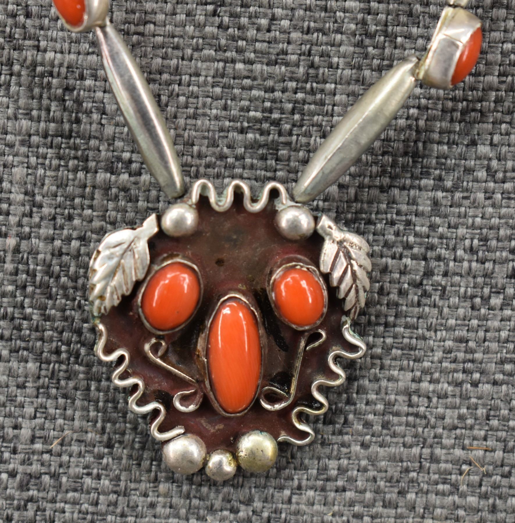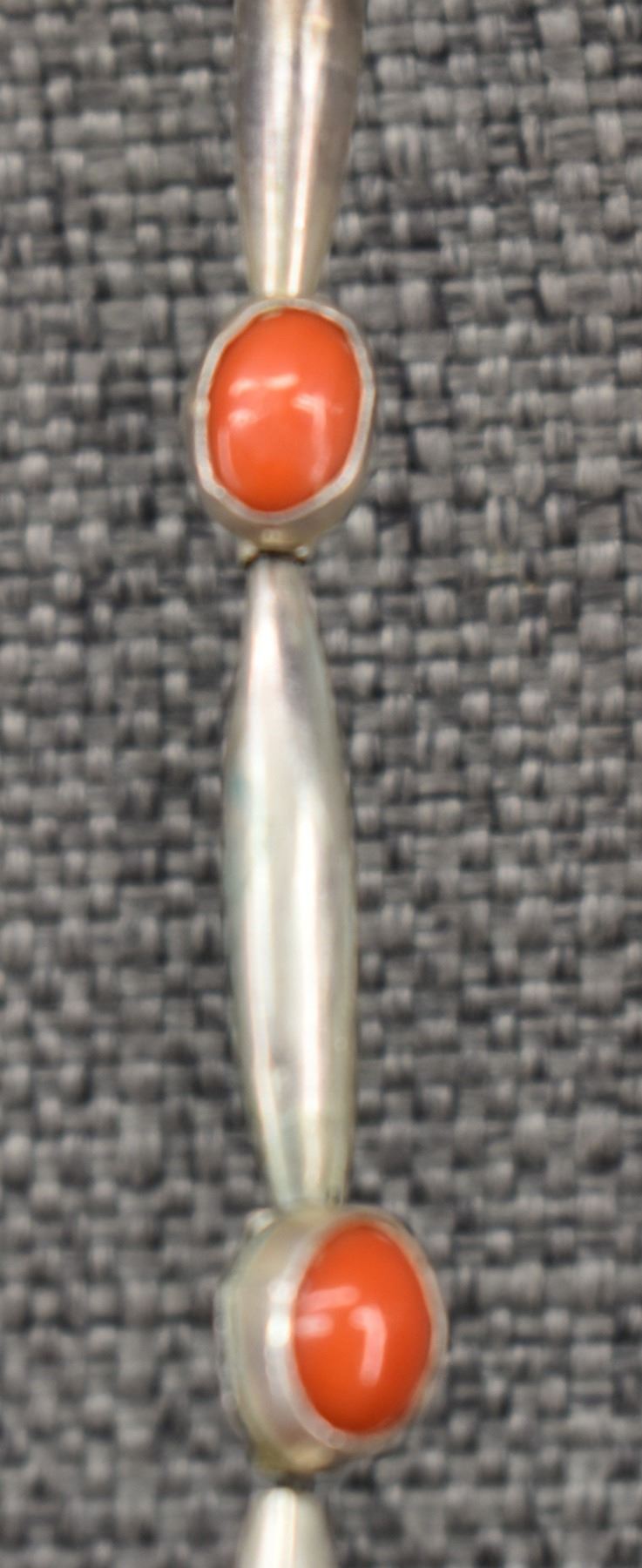 1970's Navajo, single strand of Sterling silver and coral beads 23" long with pendant 1.75" x 1.5". Total weight 43 grams