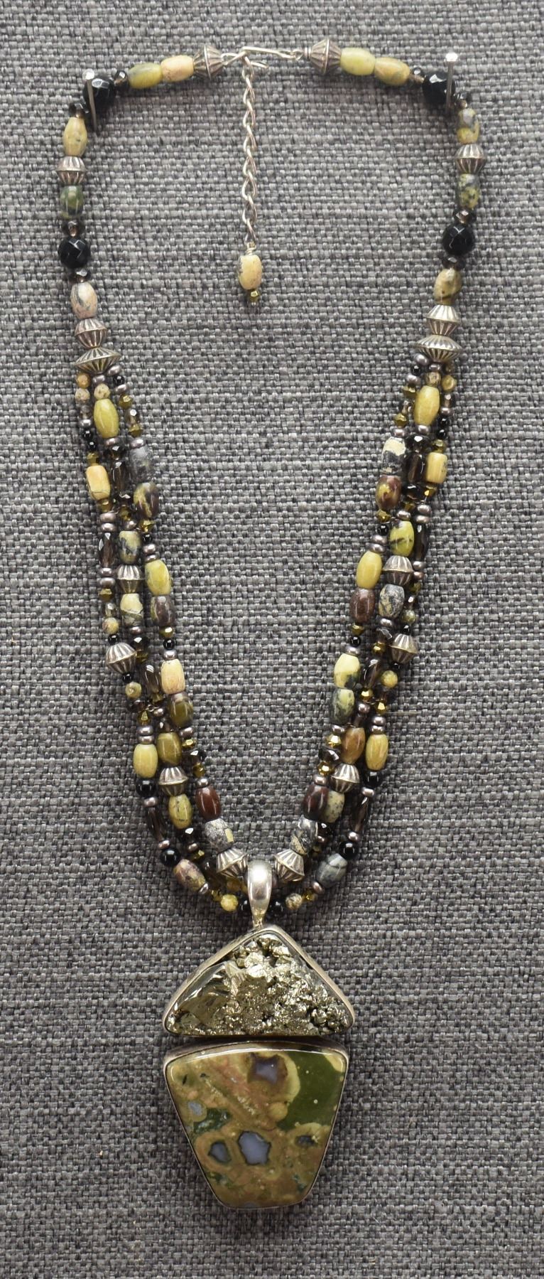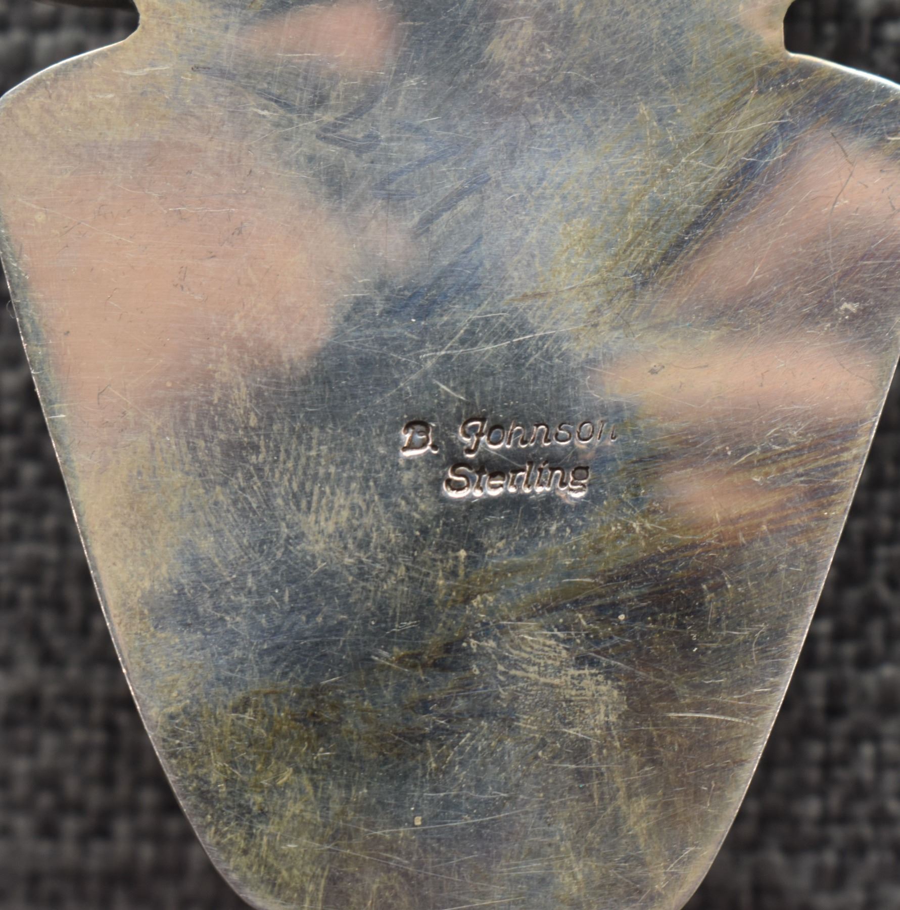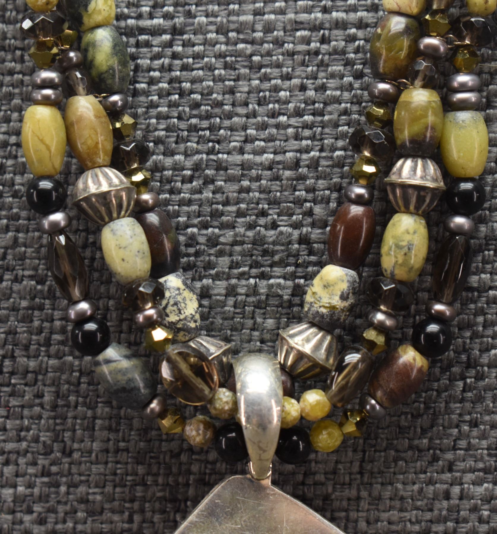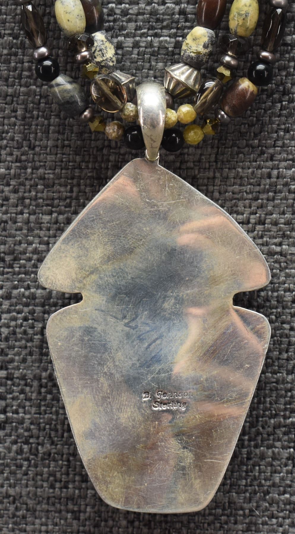 2000. Navajo. Silver and stone bead necklace 18'' long. Stone set in sterling silver pendant 3'' x 1.75'' signed B. Johnson