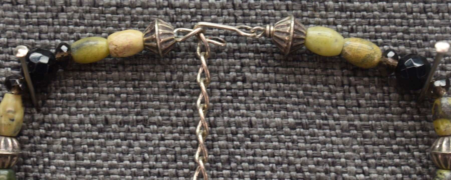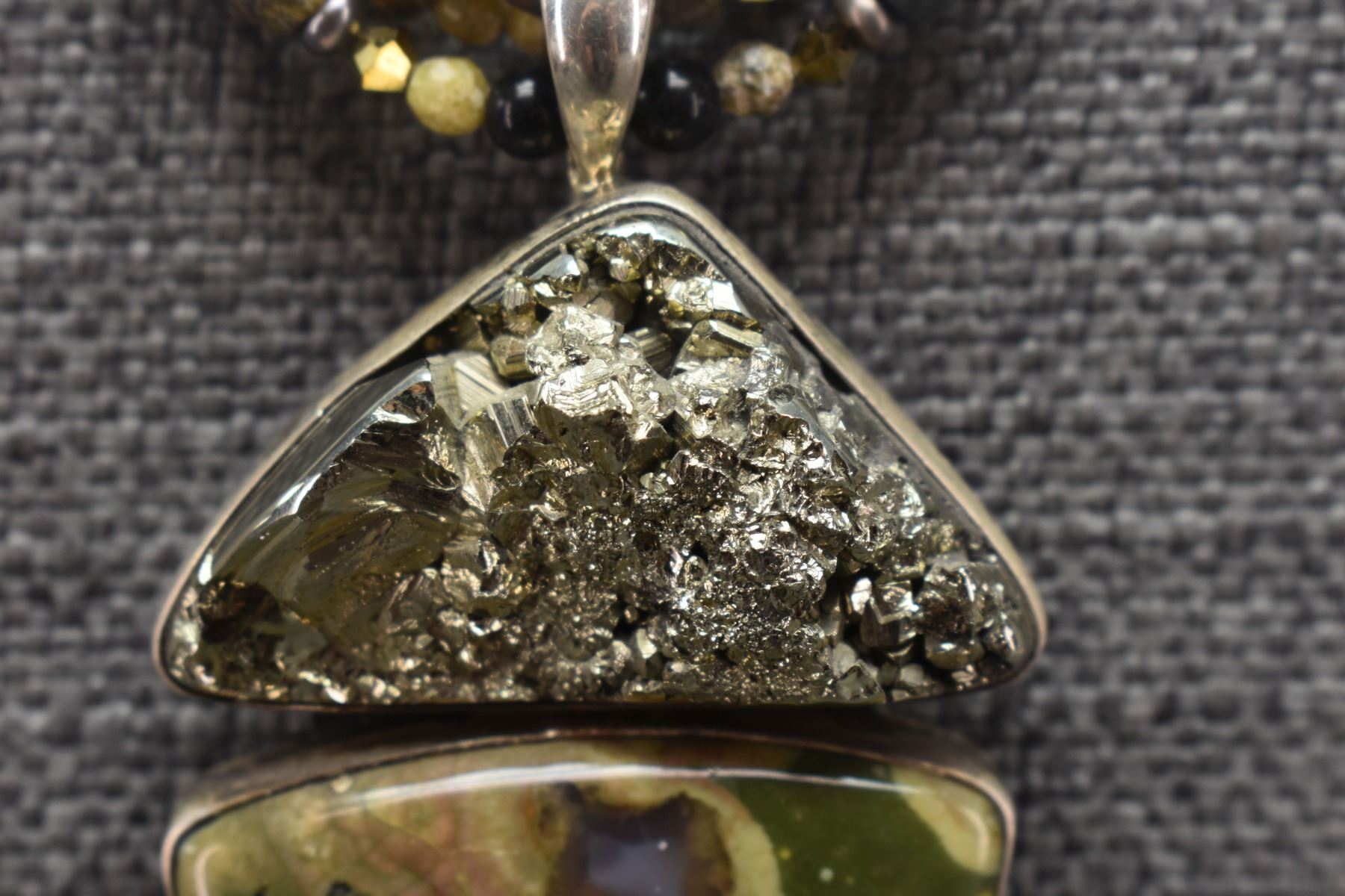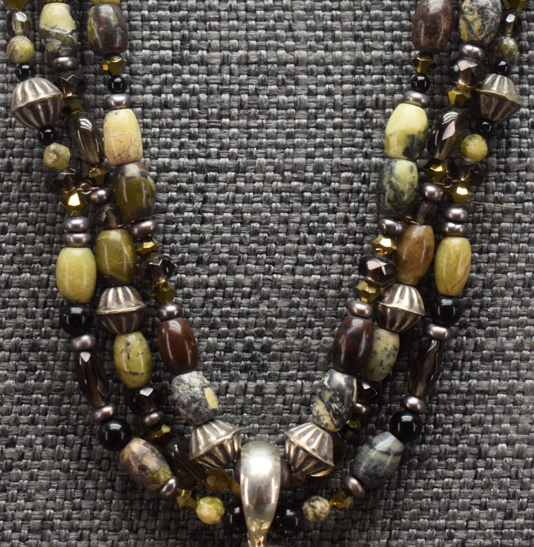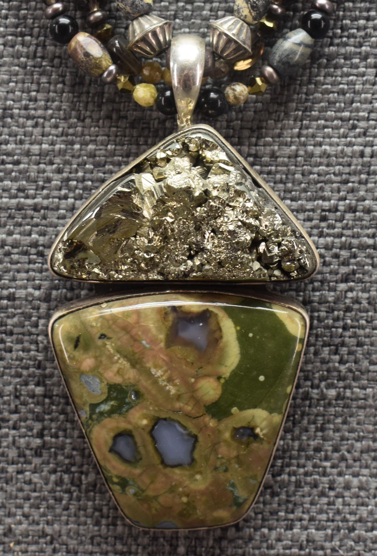 2000. Navajo. Silver and stone bead necklace 18'' long. Stone set in sterling silver pendant 3'' x 1.75'' signed B. Johnson