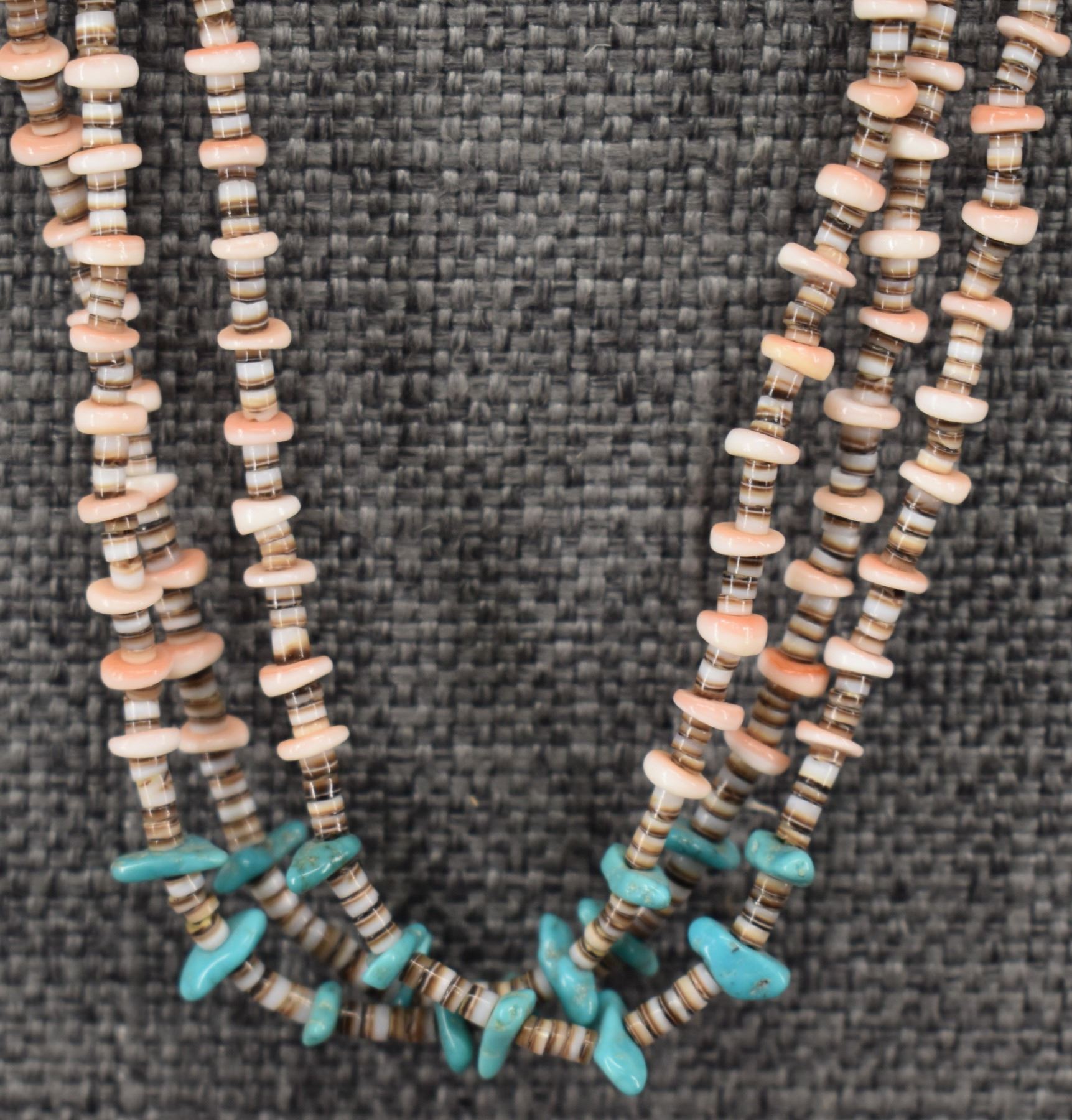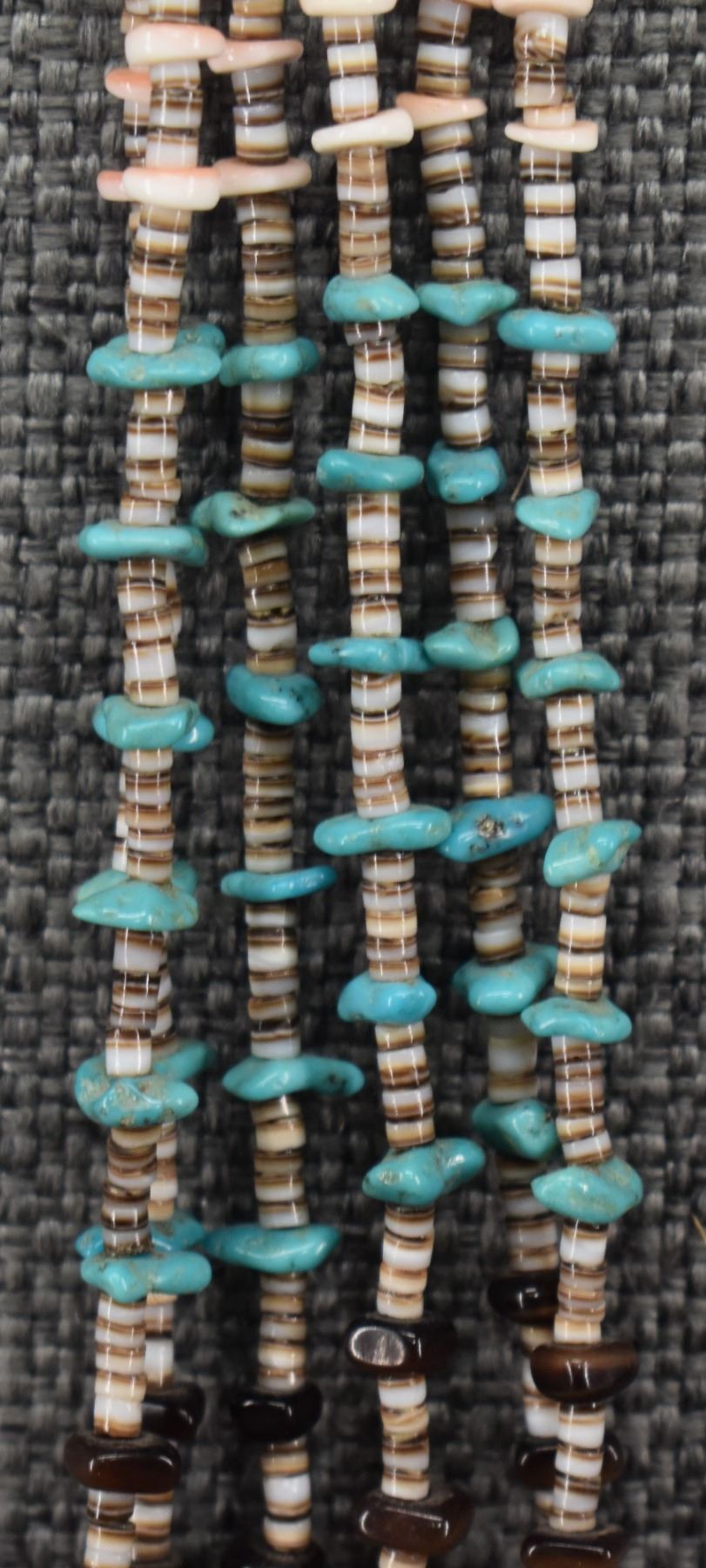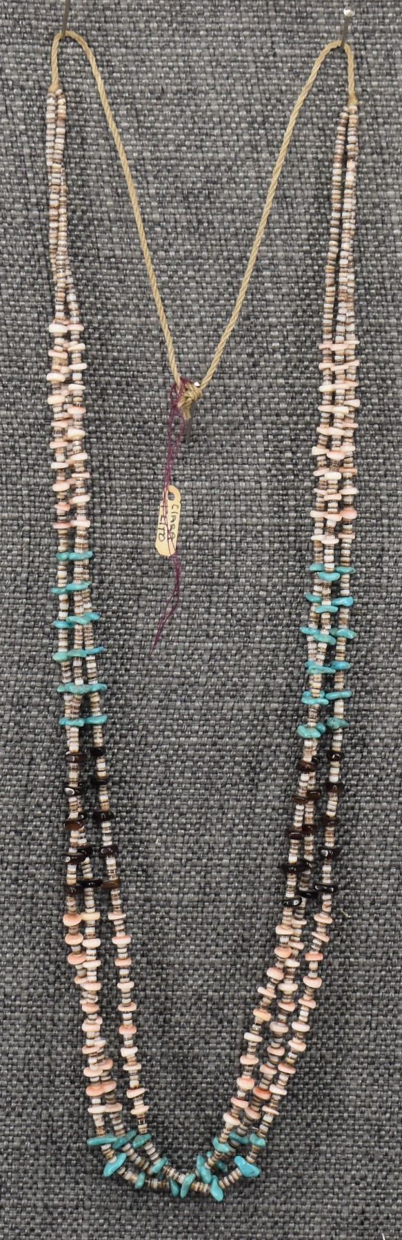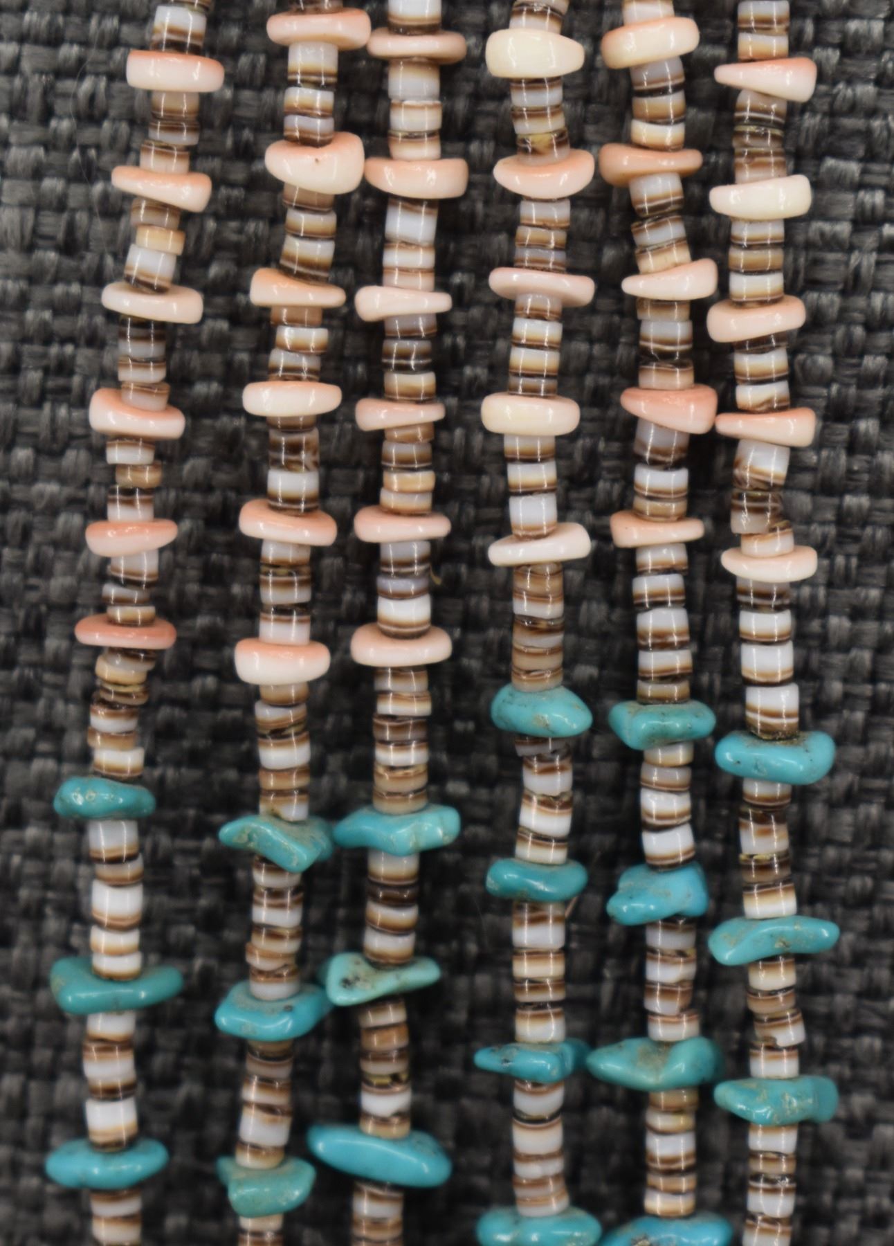 1980-90's Navajo, multiple strand of shell heishi with turquoise and shell 32" long attributed to Clara Tlito
