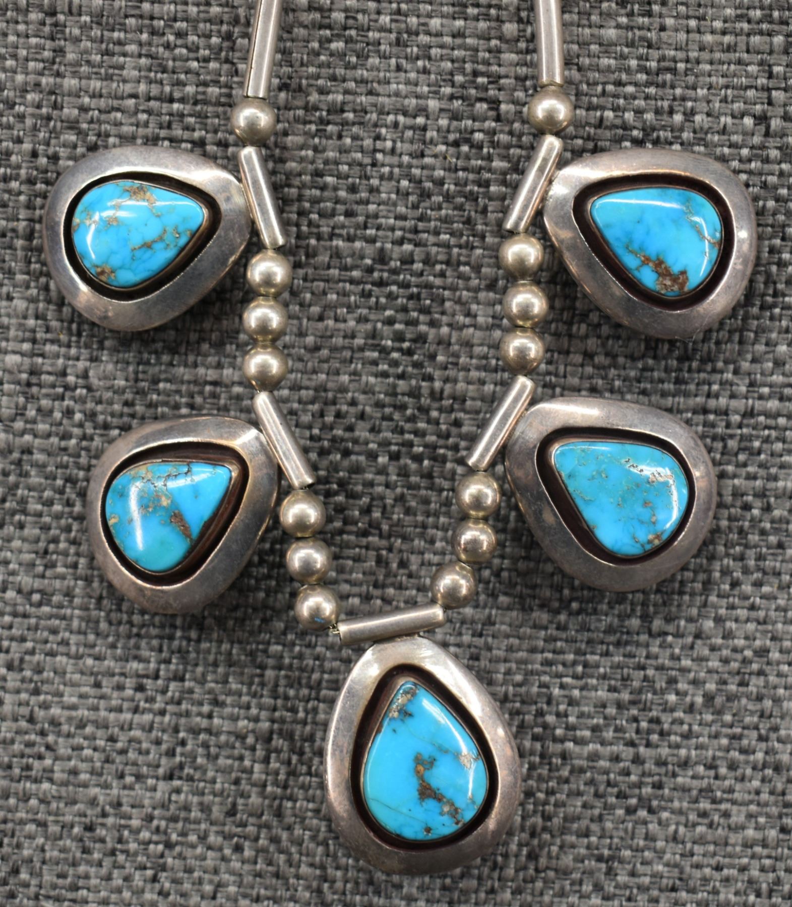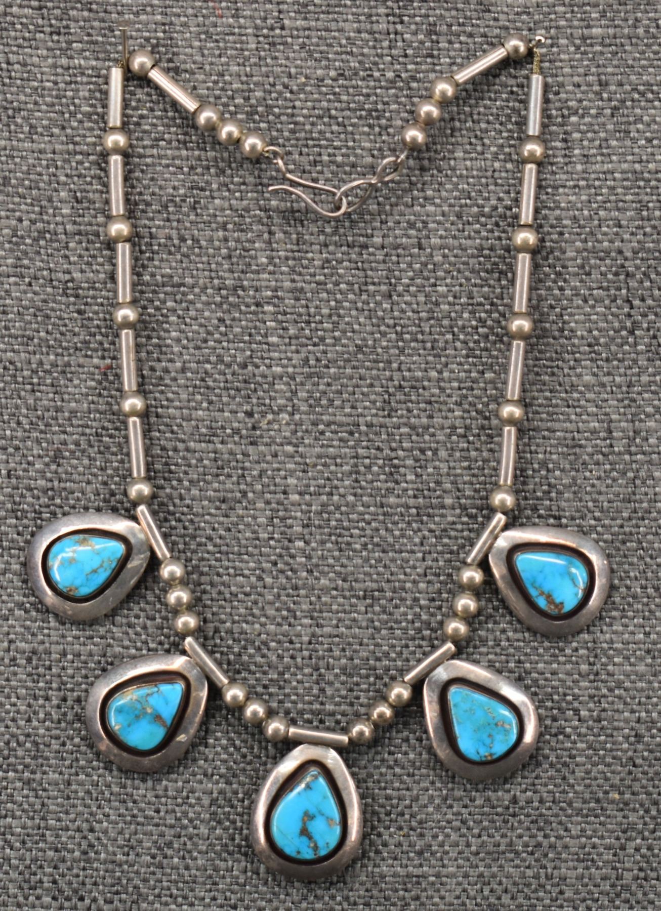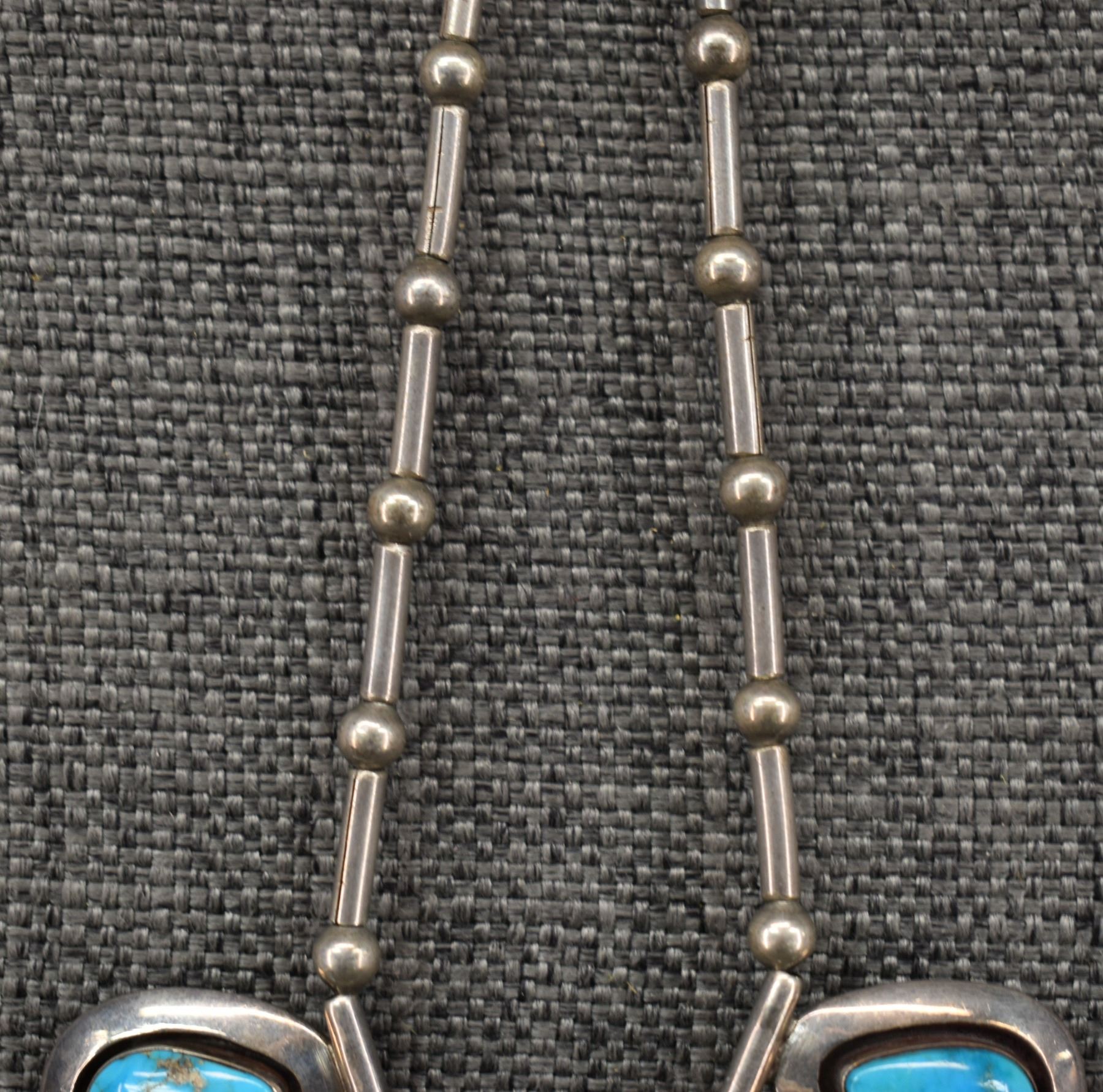 1980's Navajo, sterling silver and turquoise signed. 16" long, tabs and pendant 1.25" x 1". Total weight 51 grams