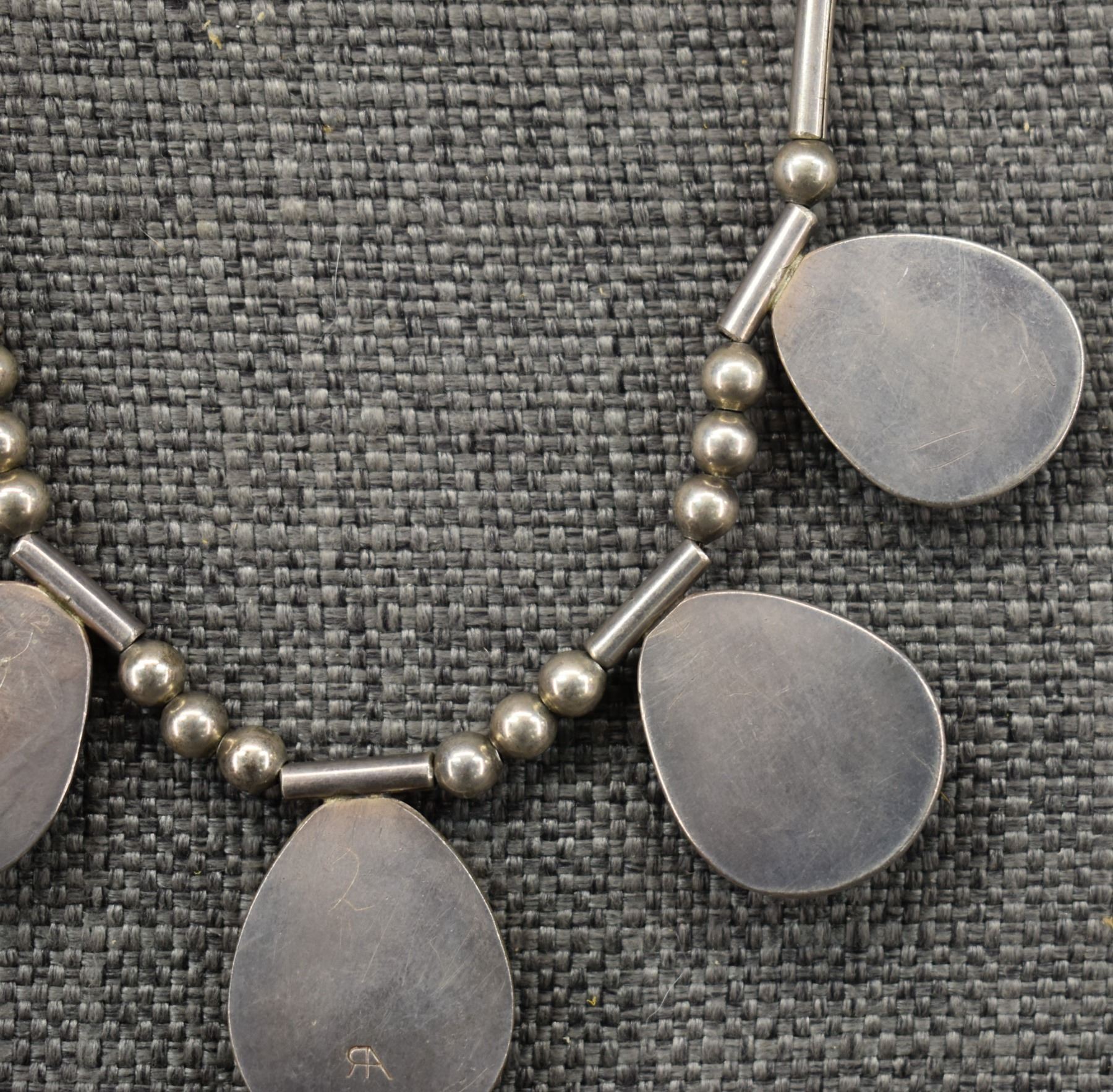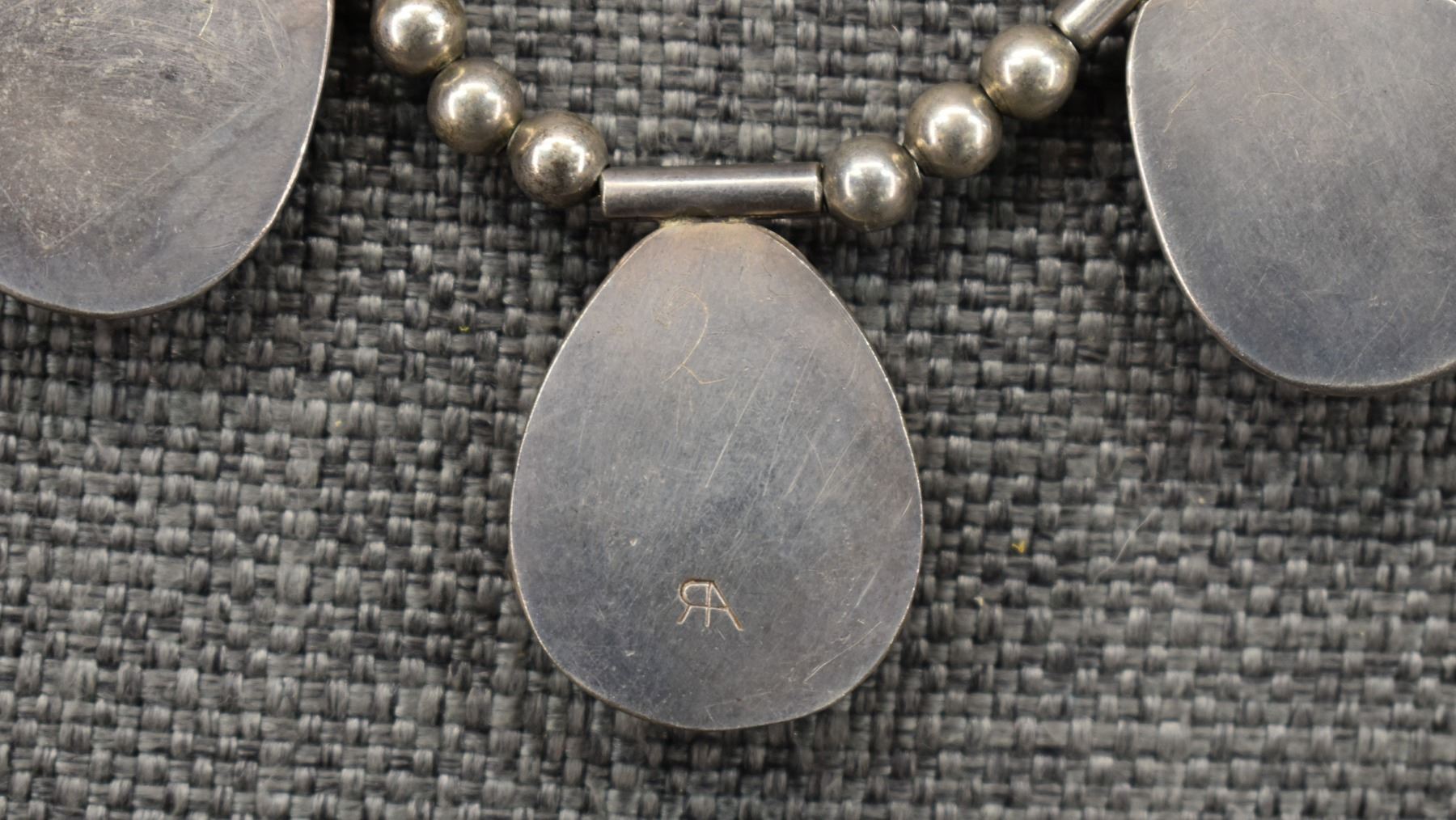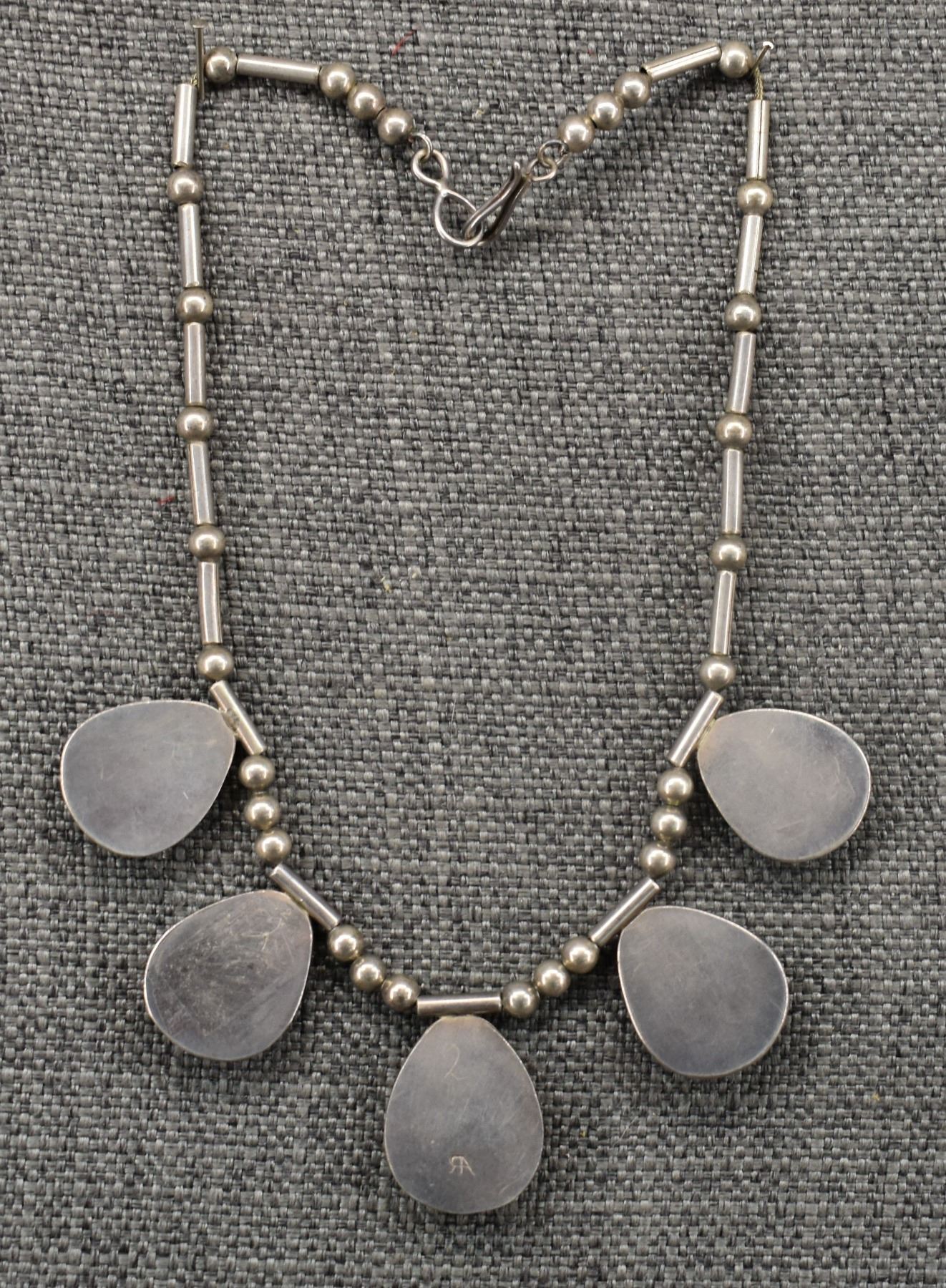 1980's Navajo, sterling silver and turquoise signed. 16" long, tabs and pendant 1.25" x 1". Total weight 51 grams