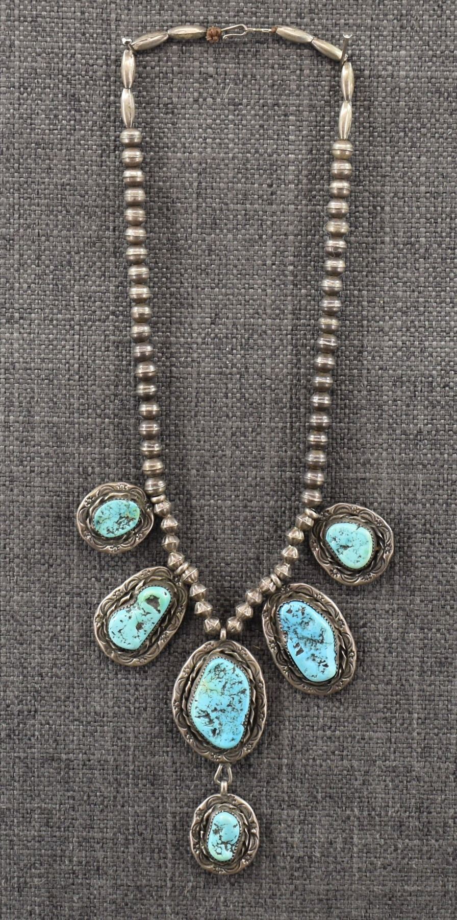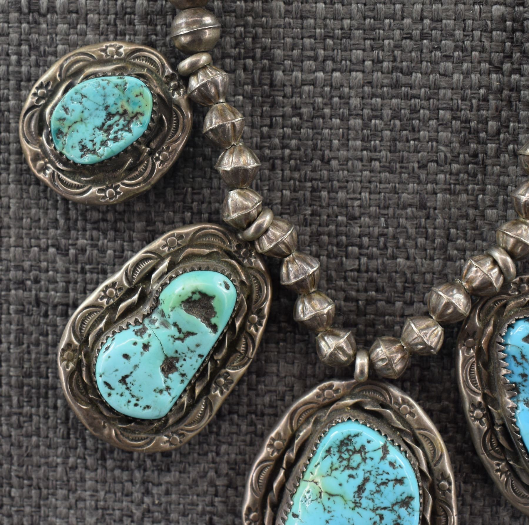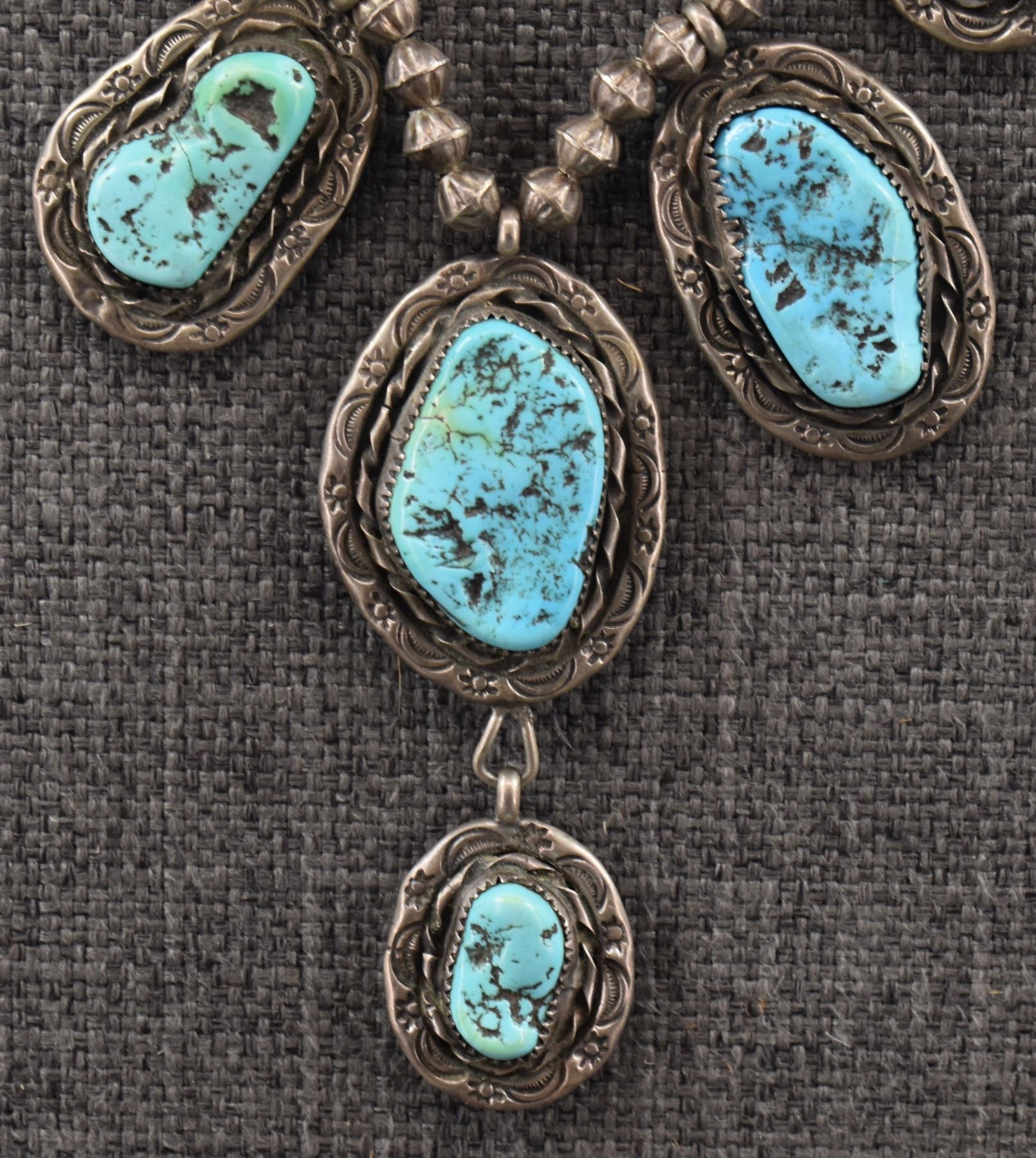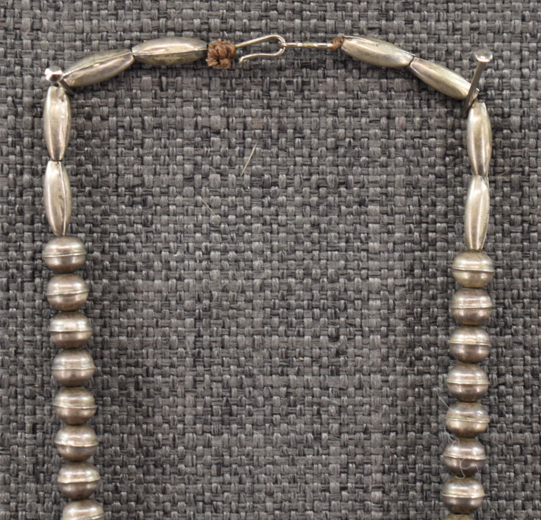 1980's Navajo, sterling silver beads 18" long with sterling silver stamped design with turquoise stones pendant 3.25" x 1.25" total weight 91 grams