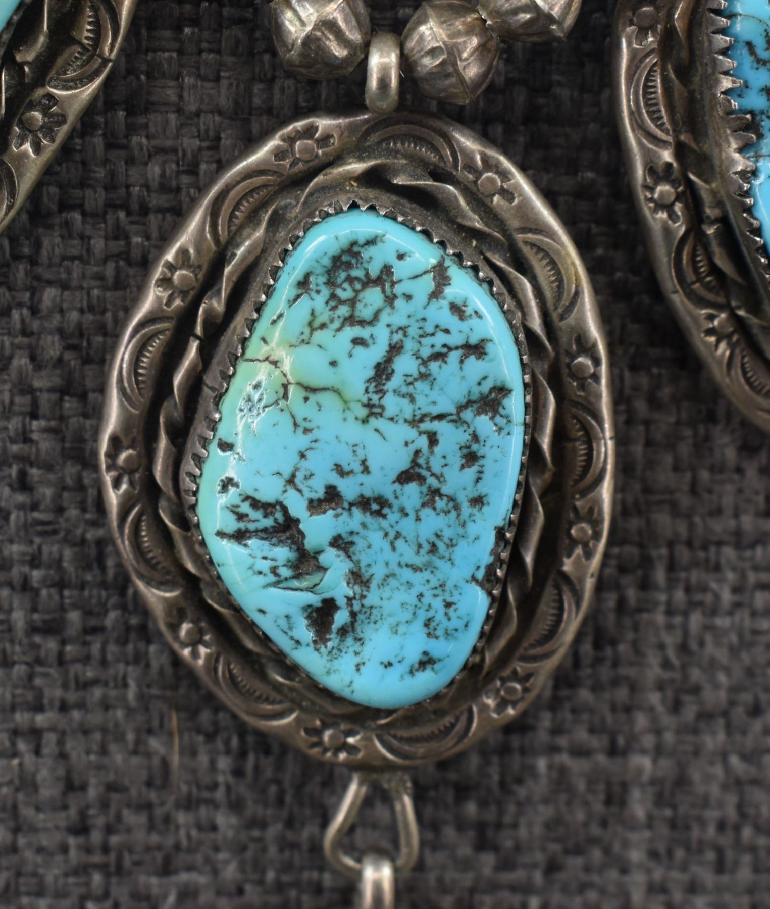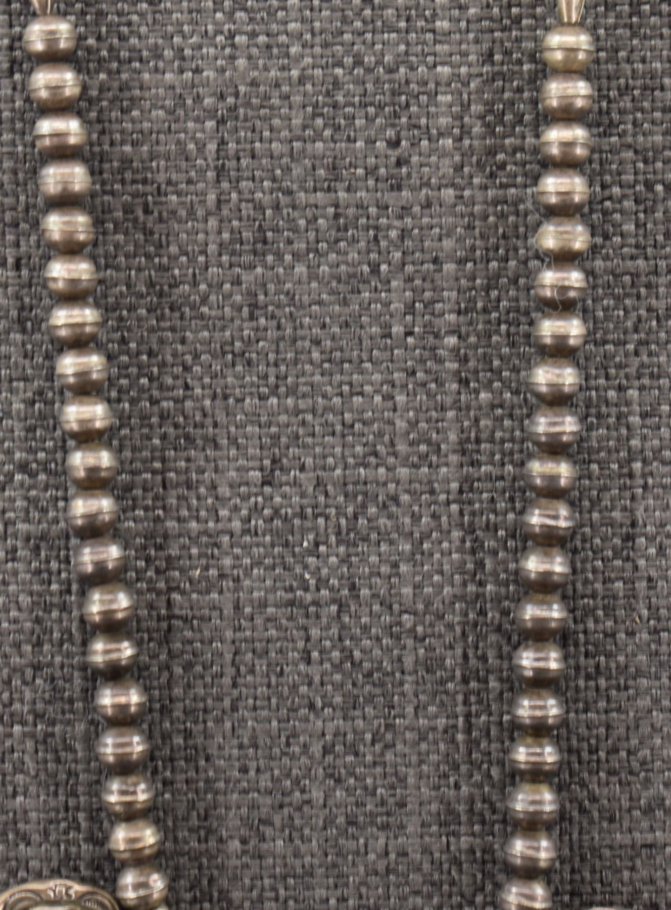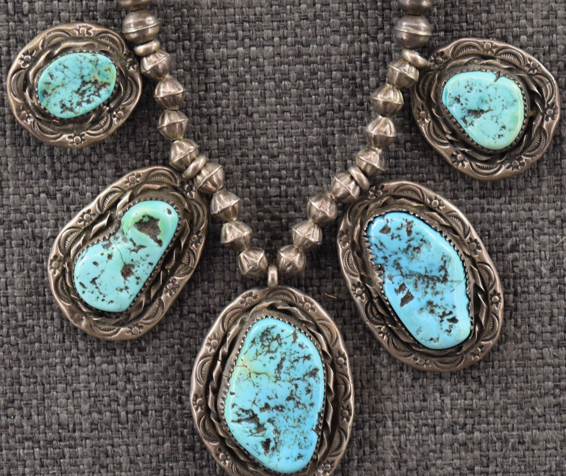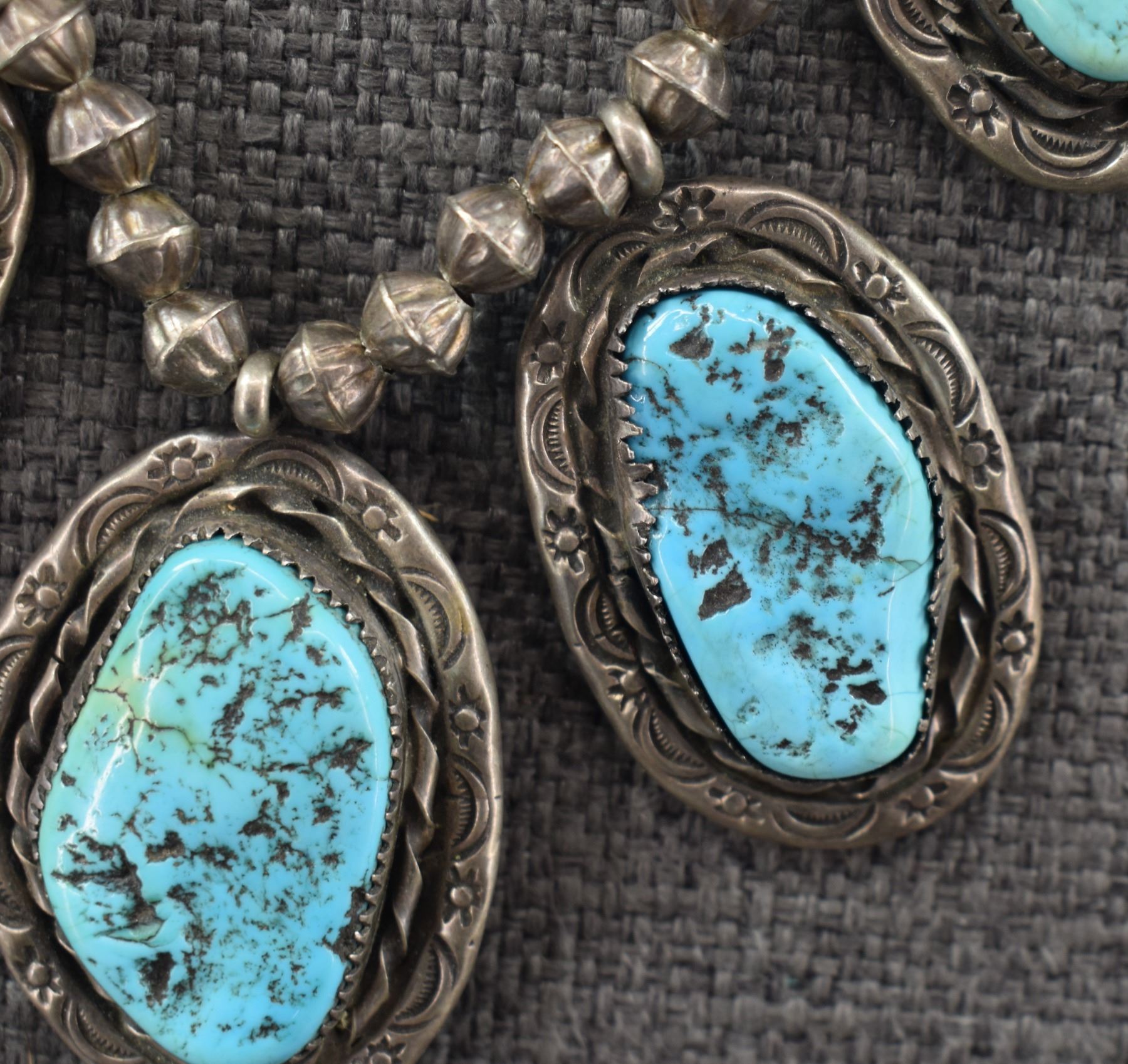1980's Navajo, sterling silver beads 18" long with sterling silver stamped design with turquoise stones pendant 3.25" x 1.25" total weight 91 grams