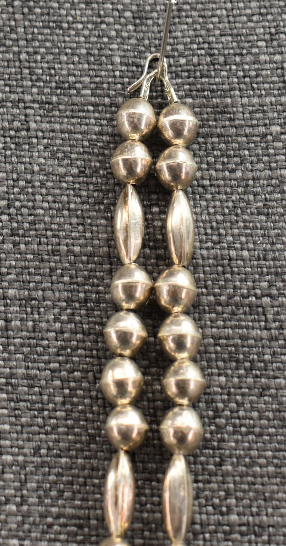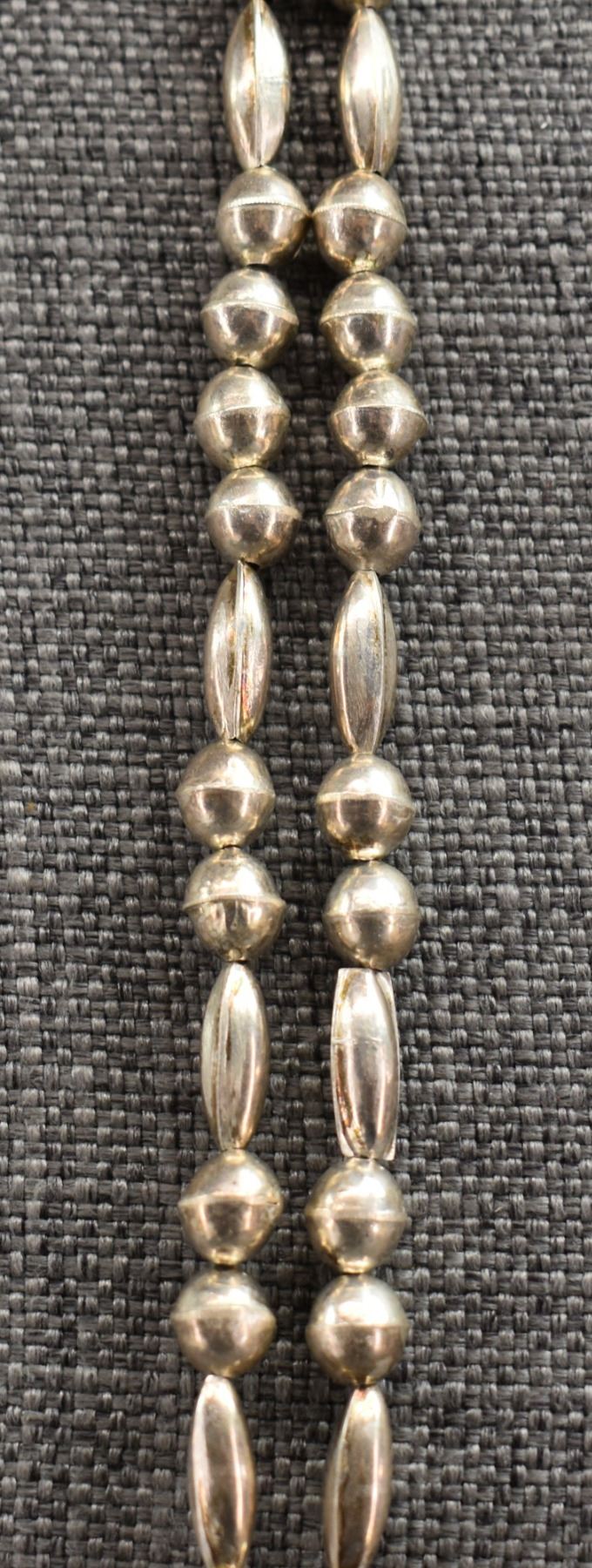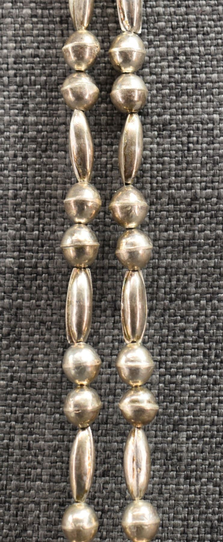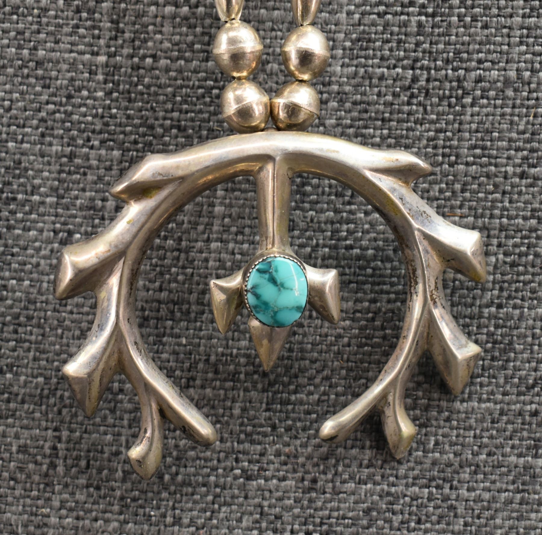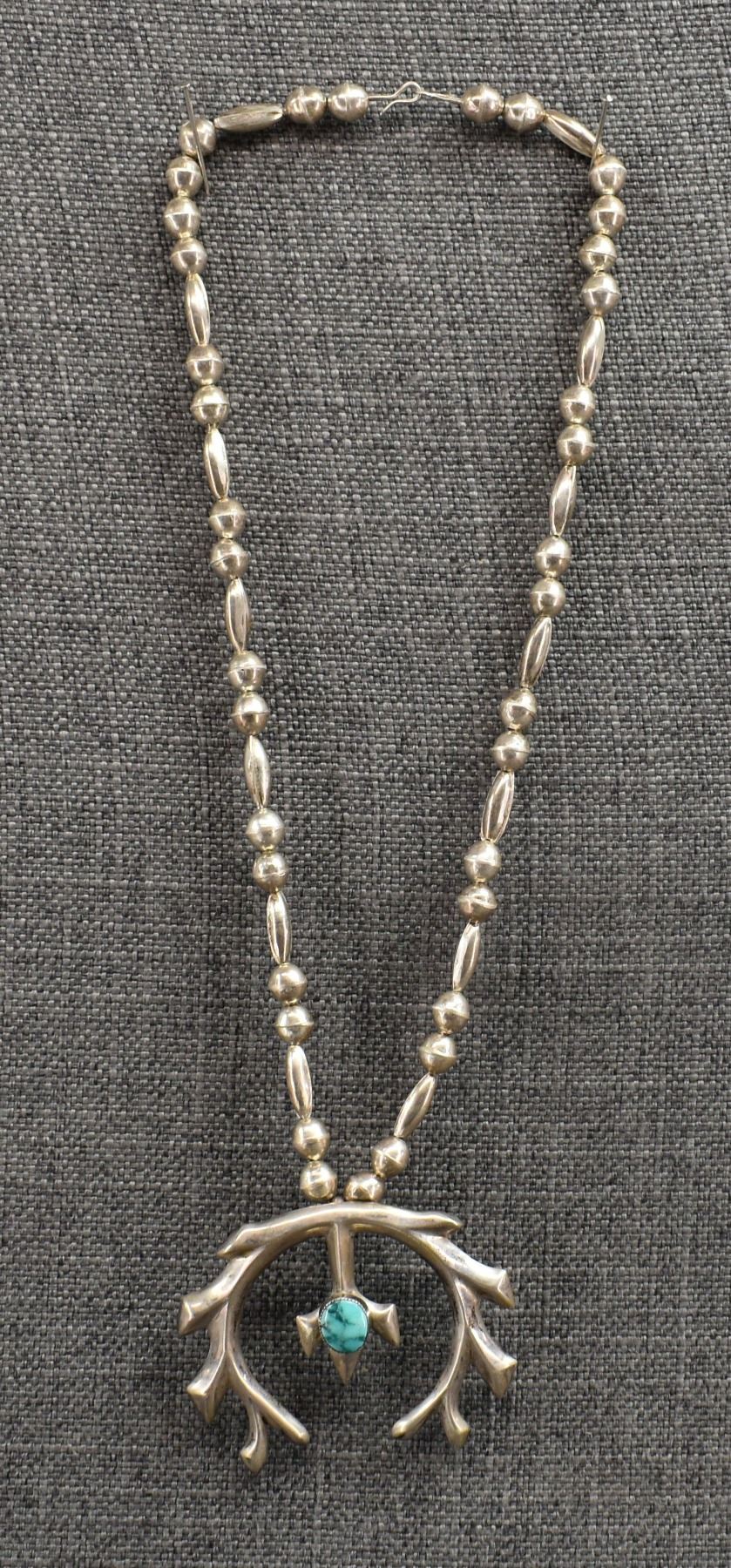1970's Navajo. Sterling silver bead necklace 22'' long and sterling silver and turquoise Naja 2.75'' x 3''