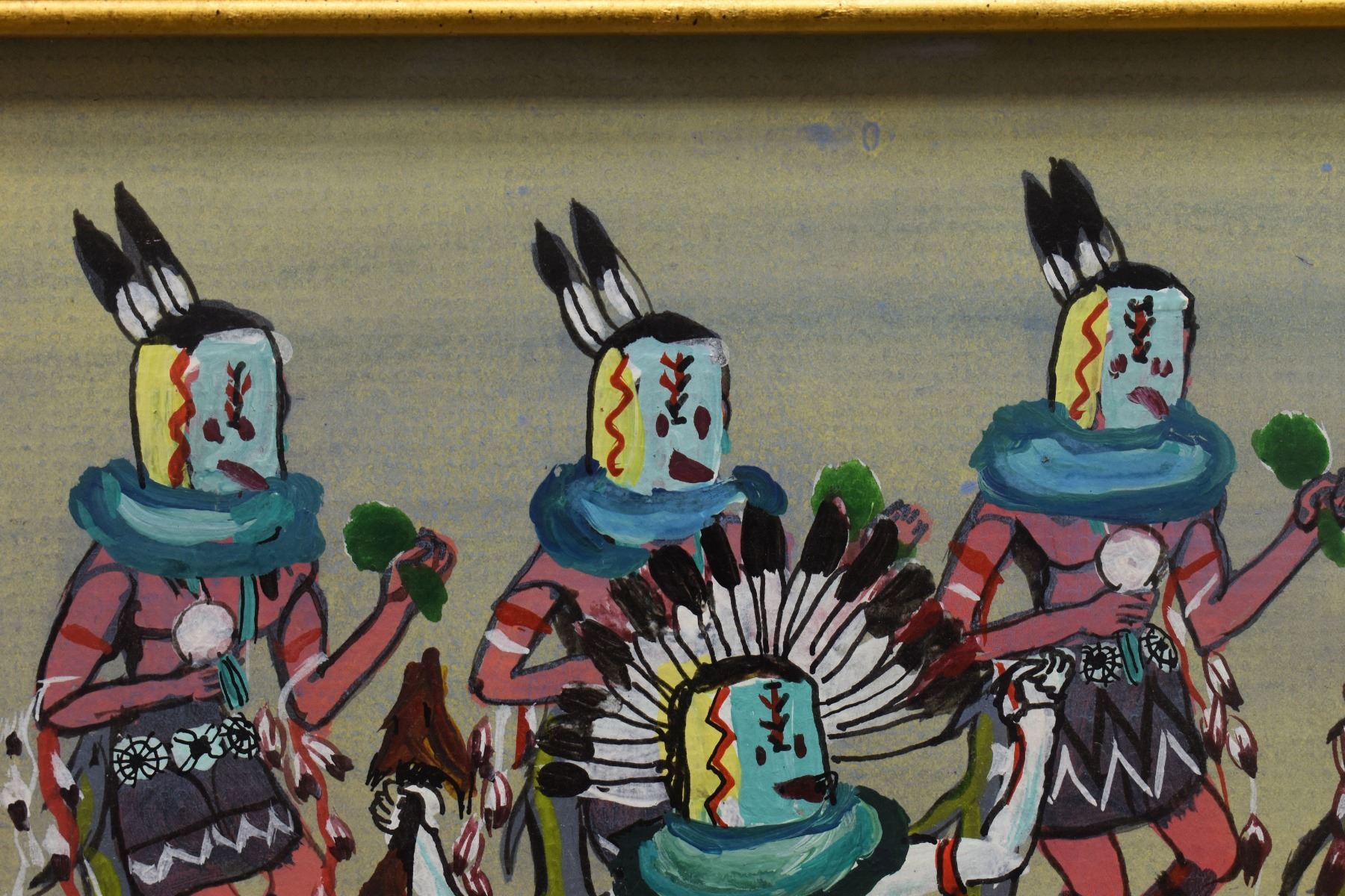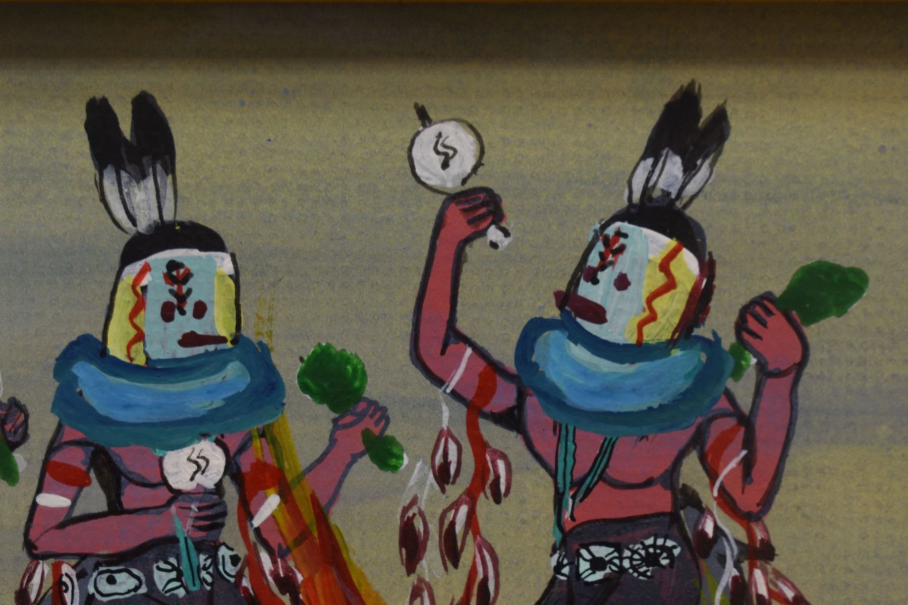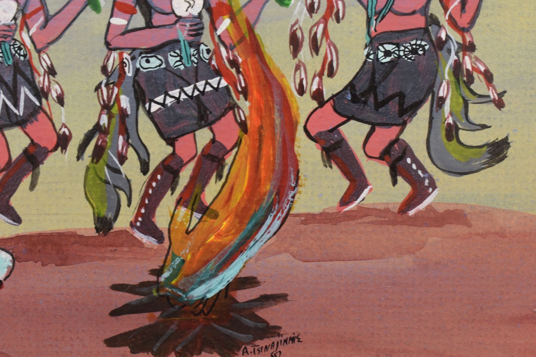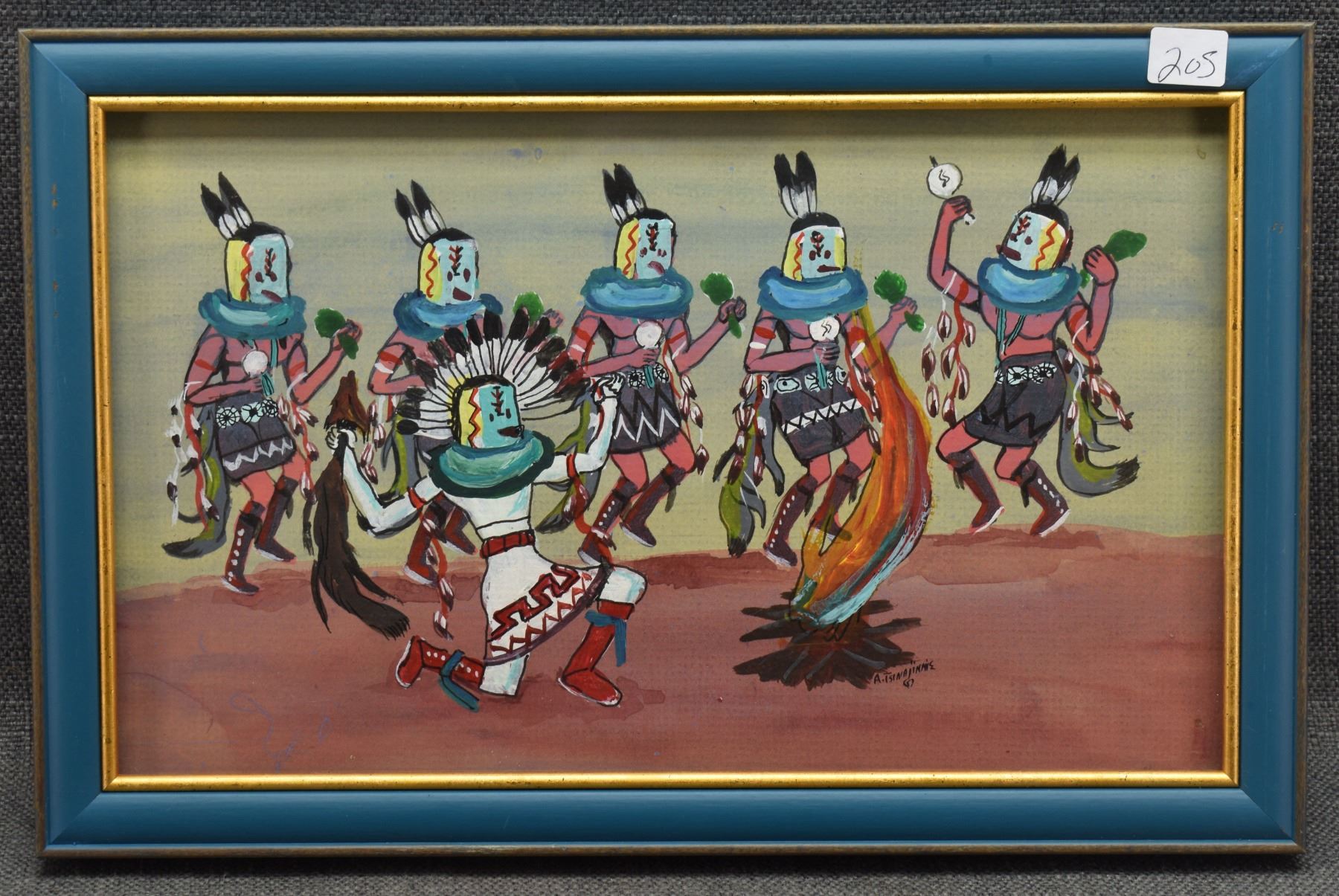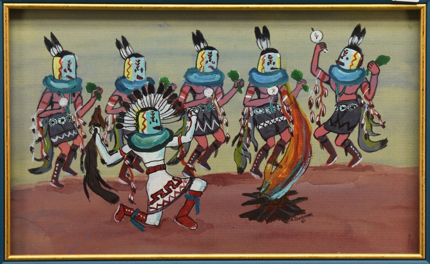1960's Navajo. Original on paper depicting yeis. Signed A. Tsinajinnie. 7'' x 13'' frame size 9'' x 14''