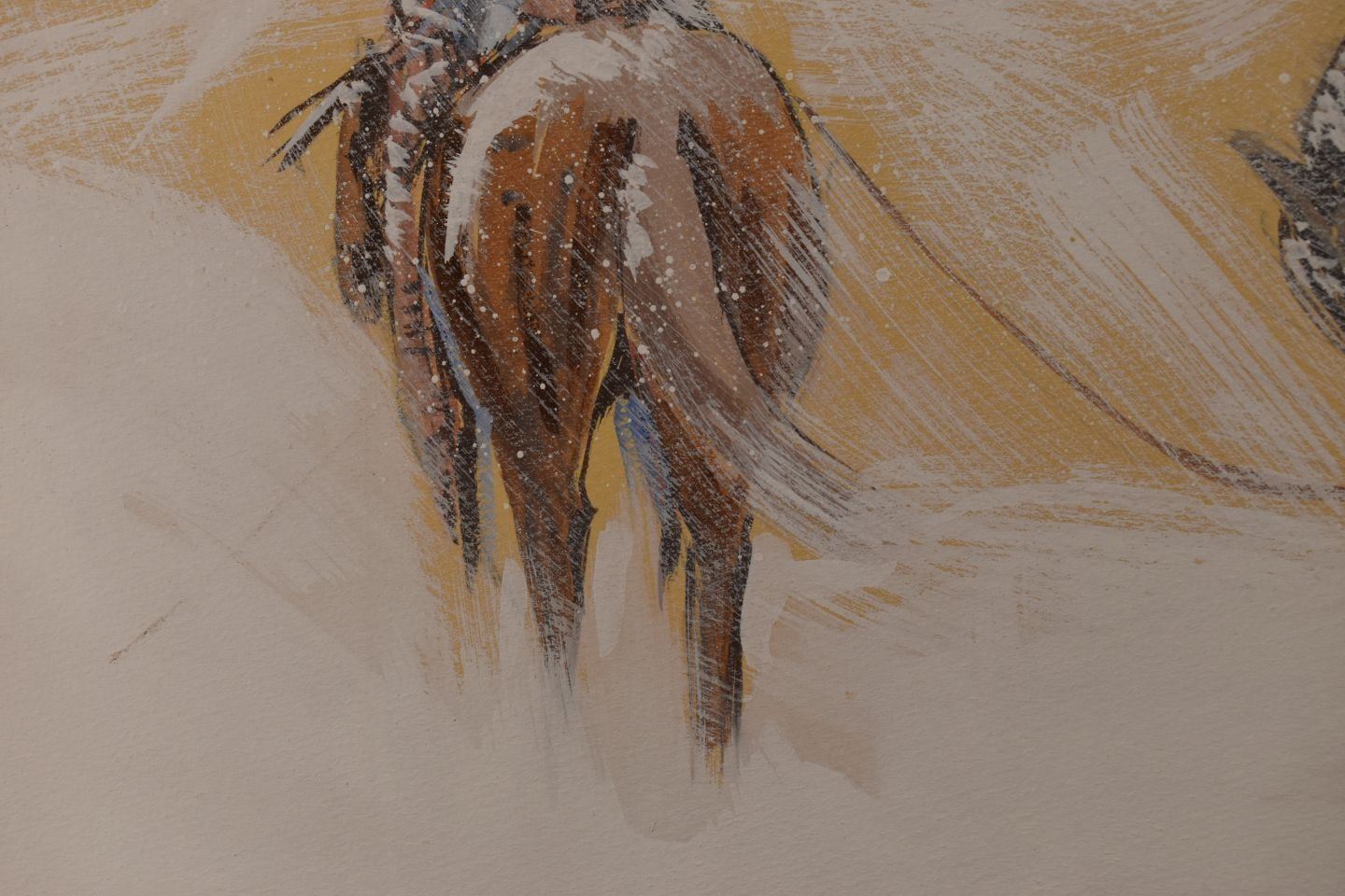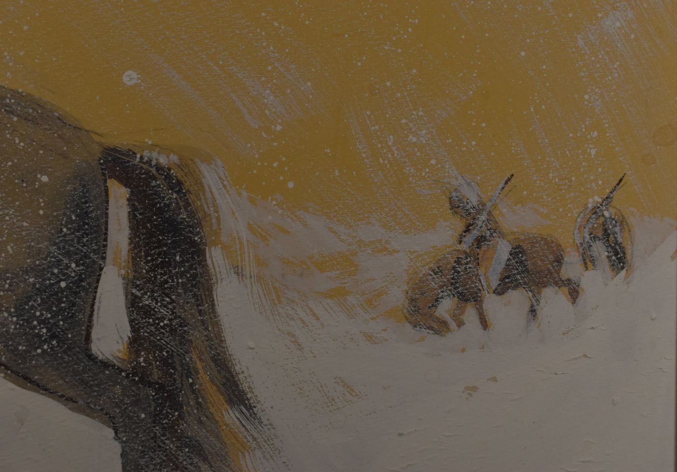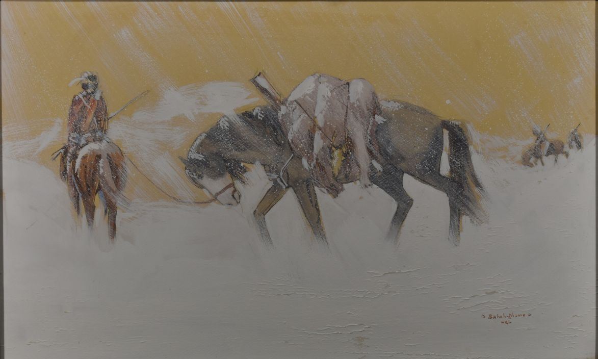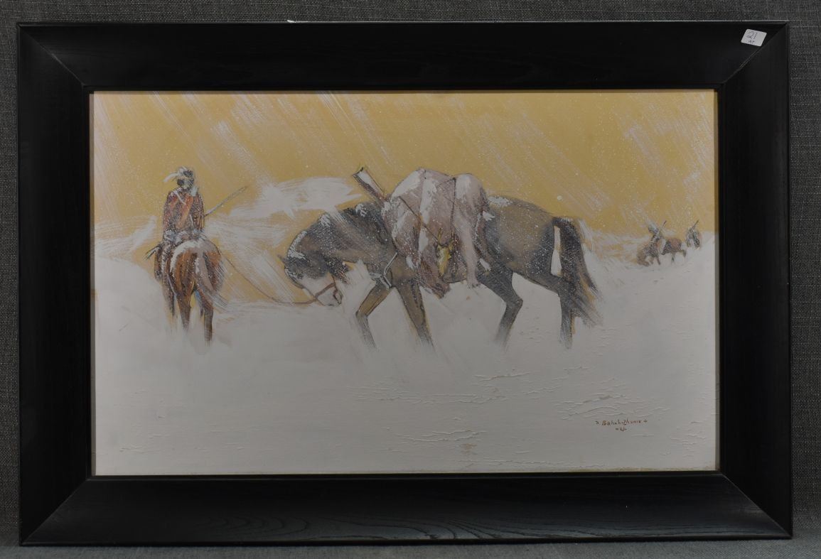 1961 Navajo. Original on paper depicting winter scene signed Bahah-Zhonie. 16'' x 26'' frame size 21'' x 31''