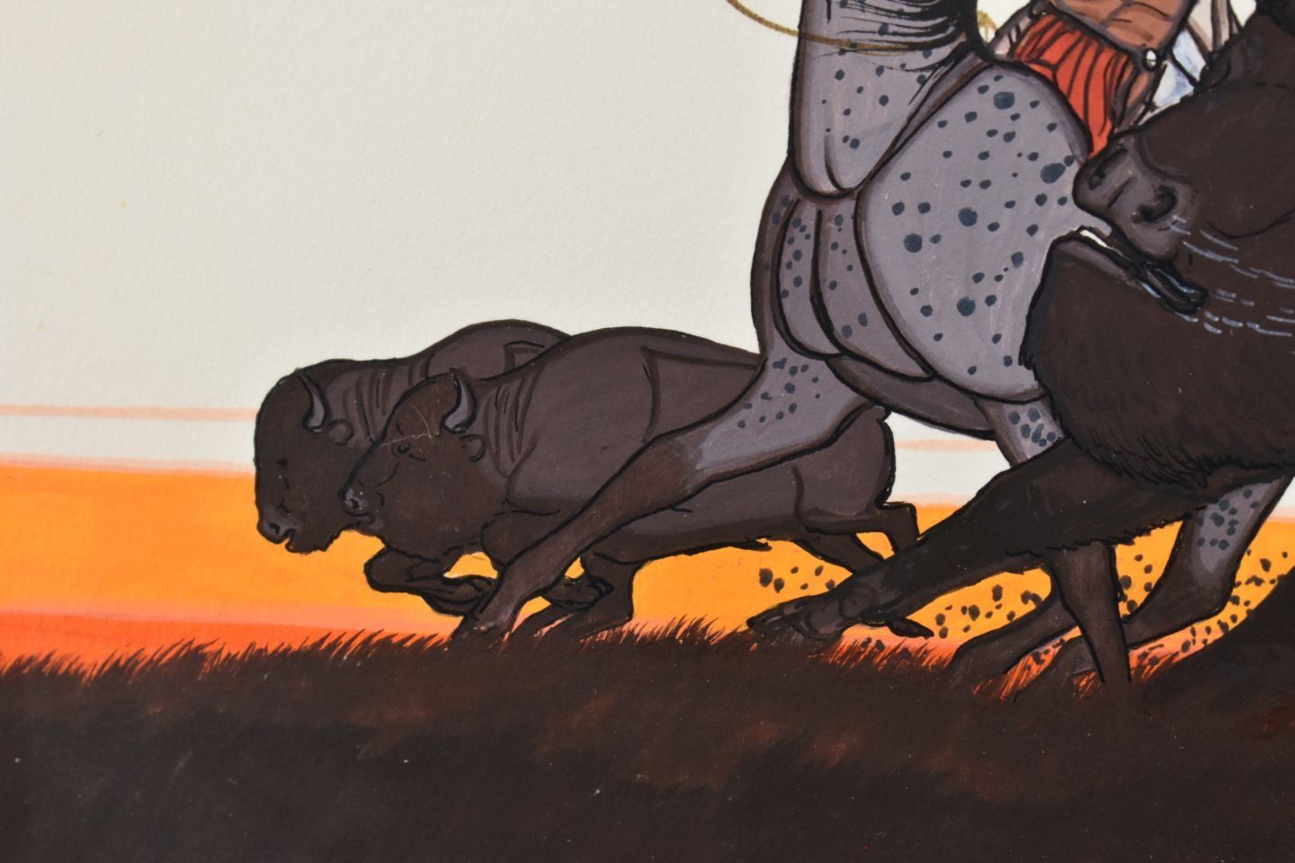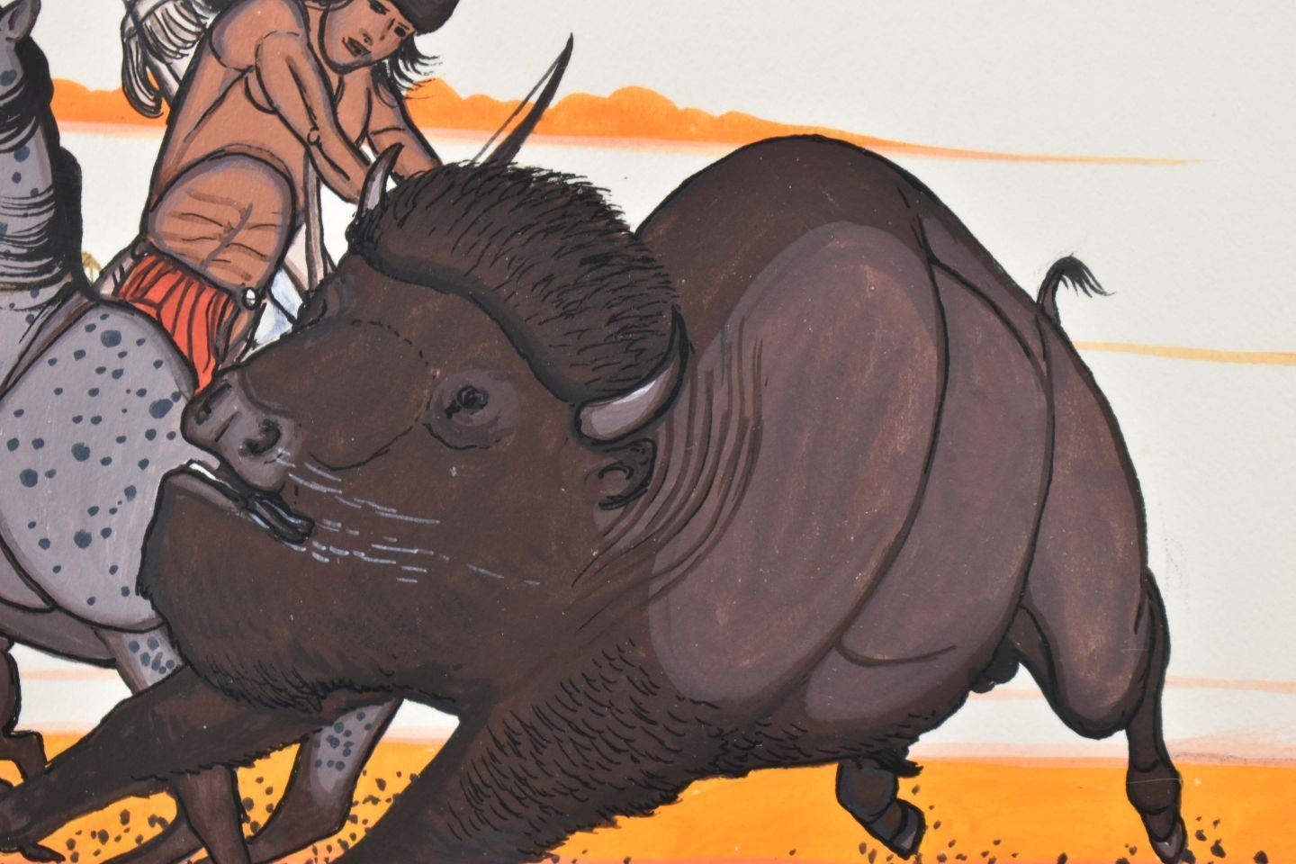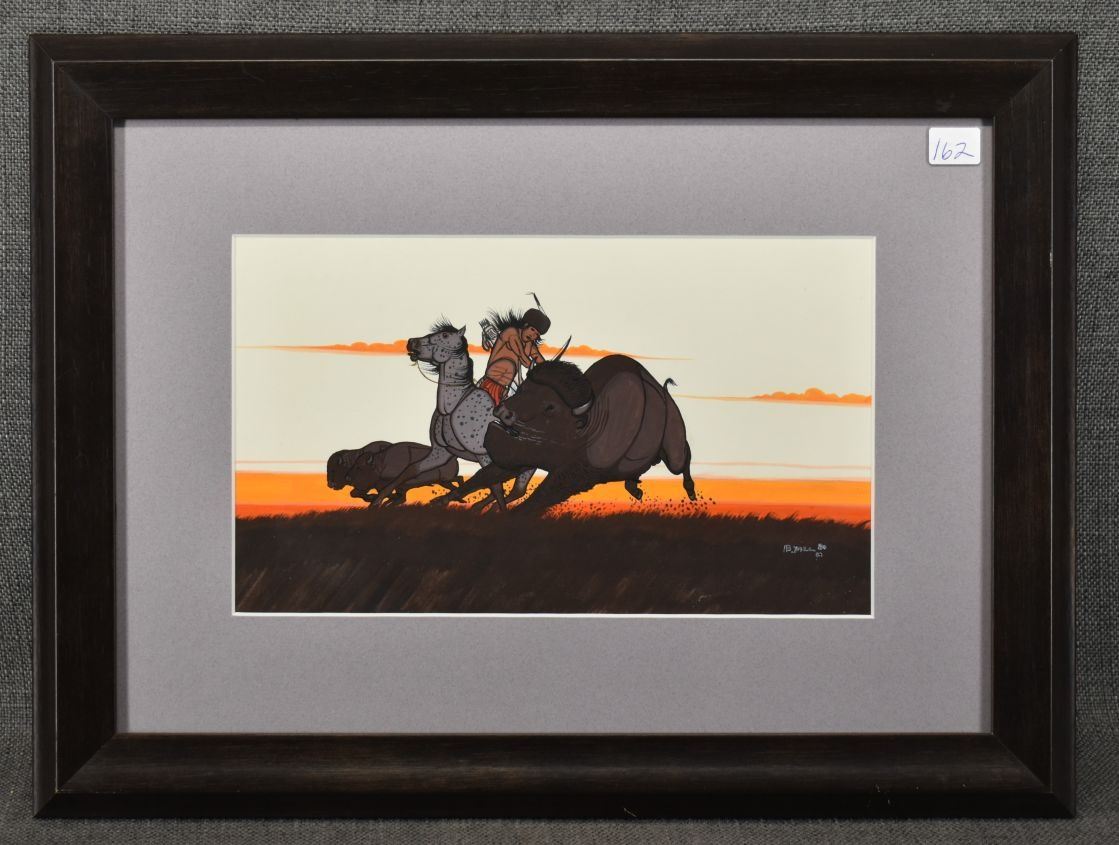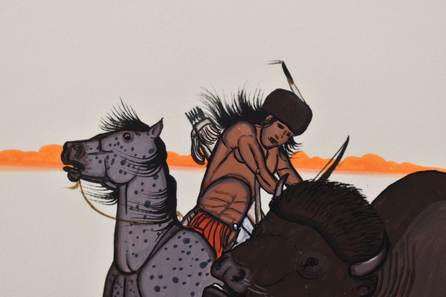 1980 Navajo, original hand painted depicting buffalo hunt by Beatin Yazz 6.5" x 11" matted and framed to 13.5" x 18"
