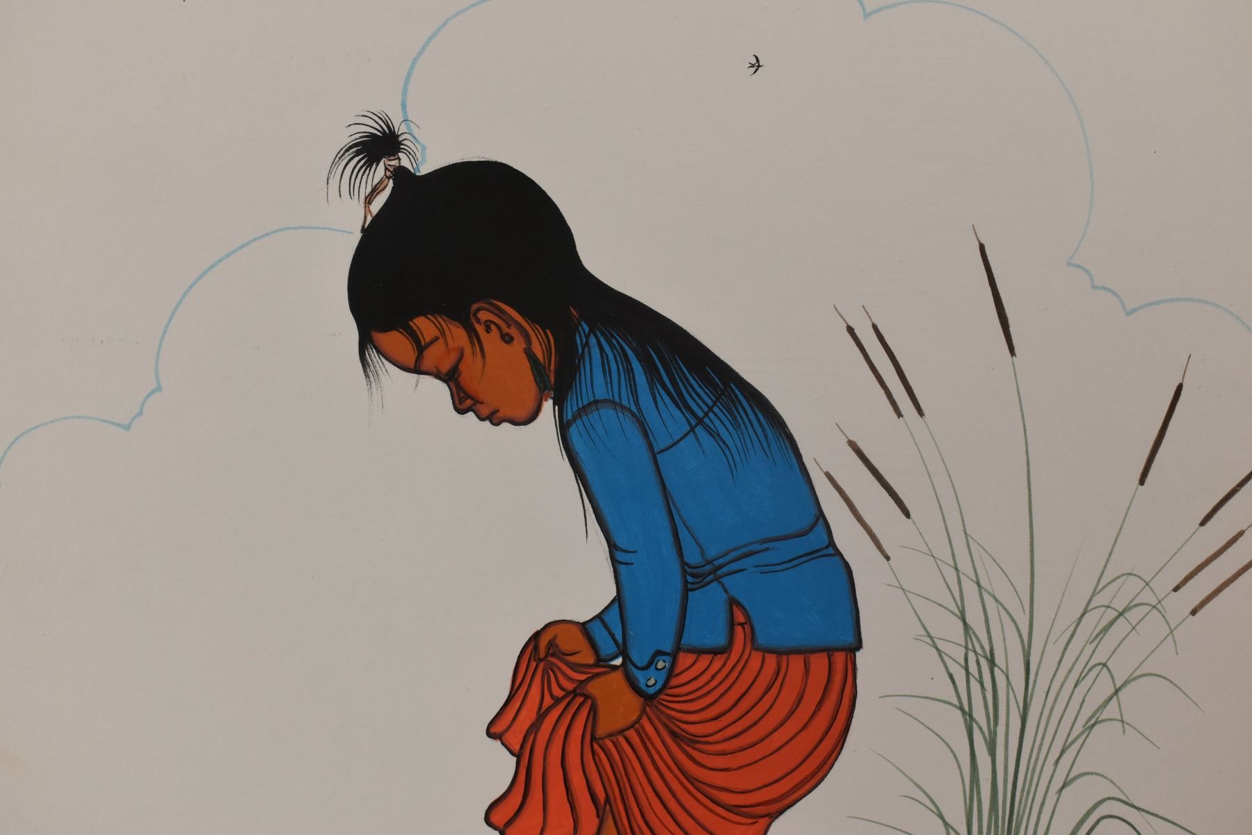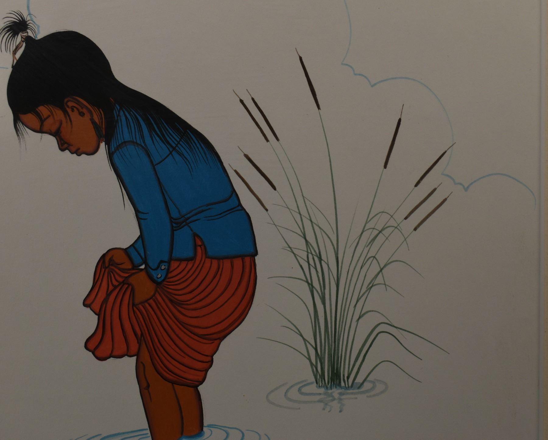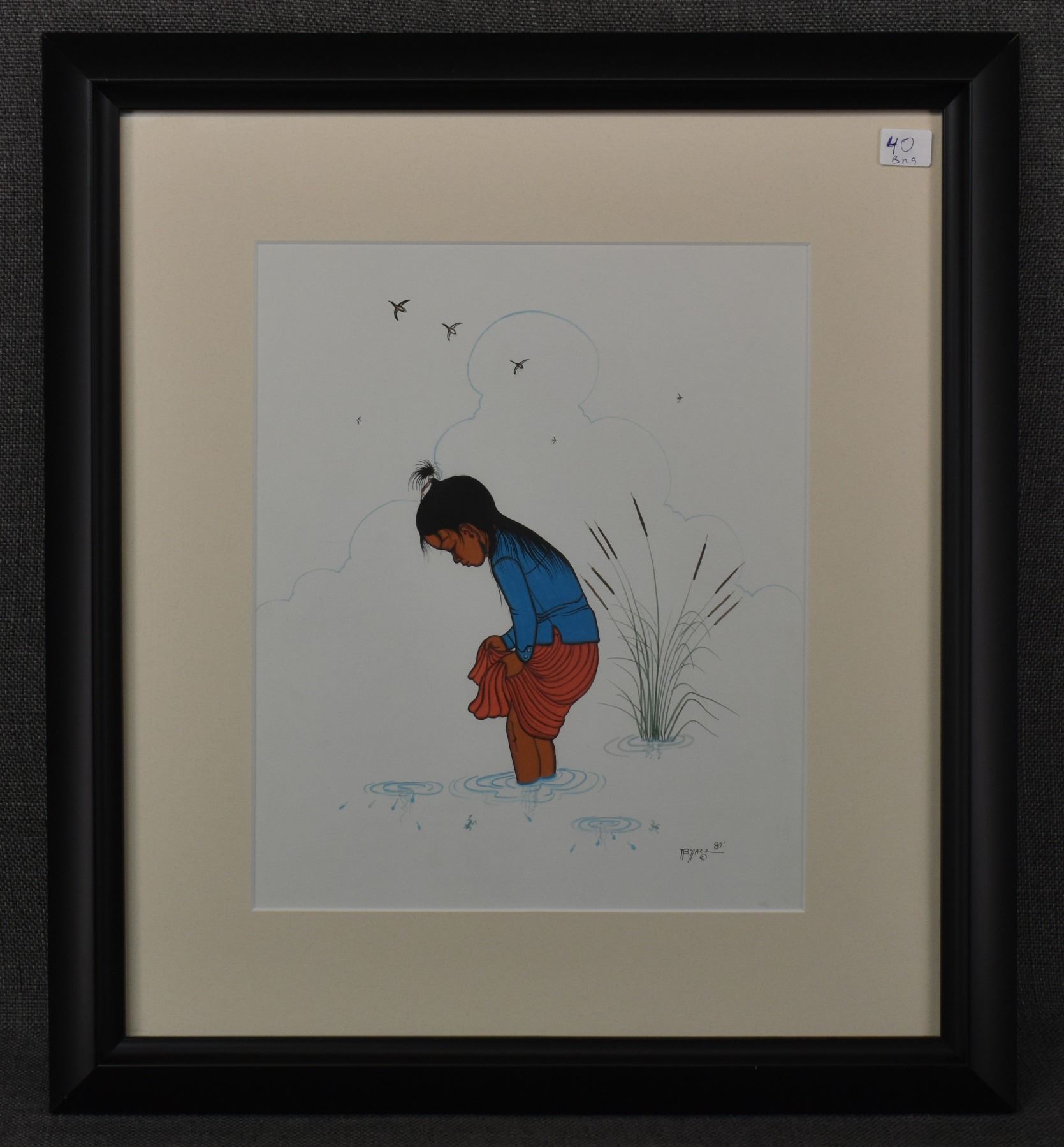 1980 Navajo, original hand painted on paper depicting Navajo girl in water by Beatin Yazz 11.5" x 9.5" framed to 18.5" x 16.75"