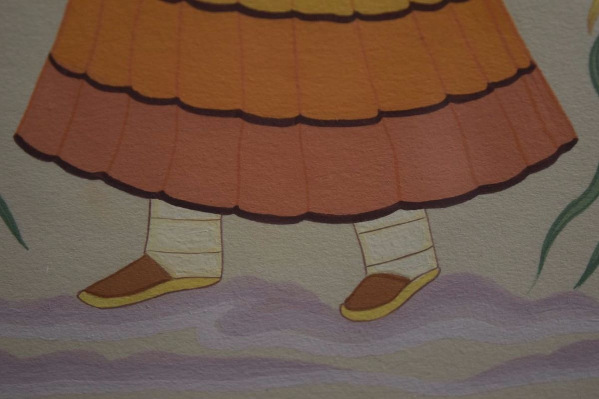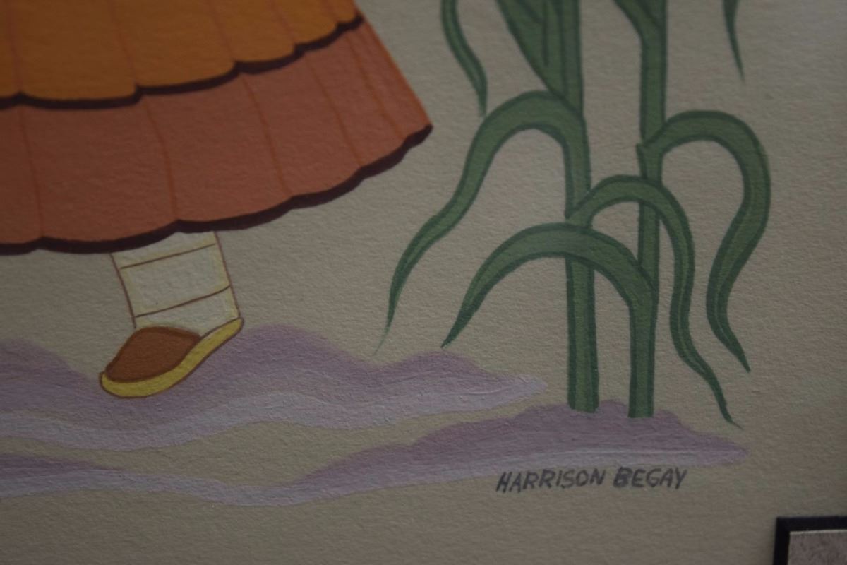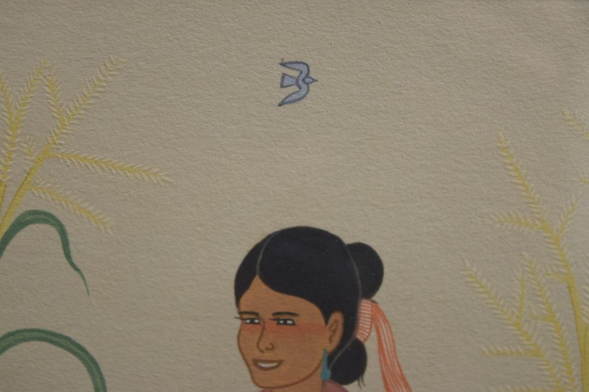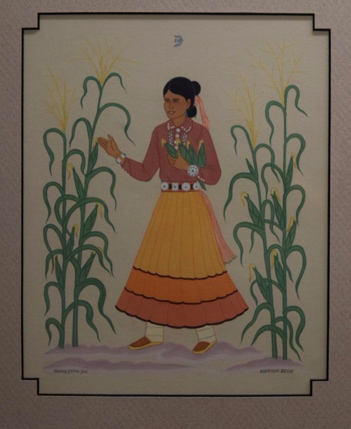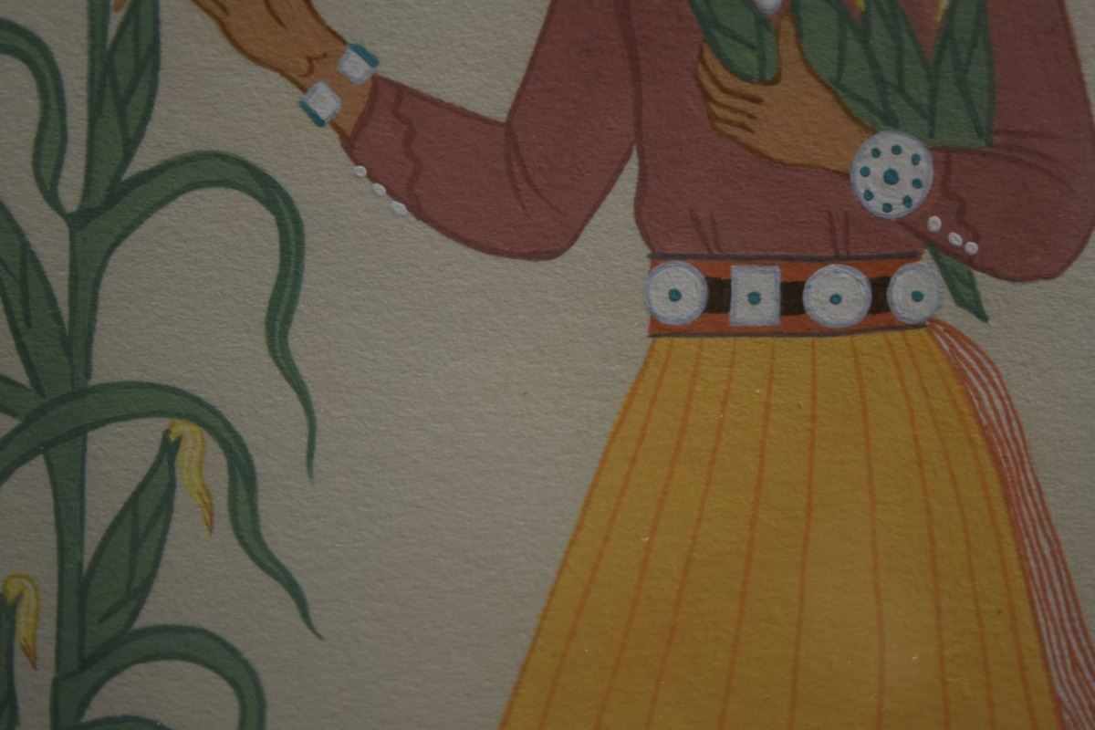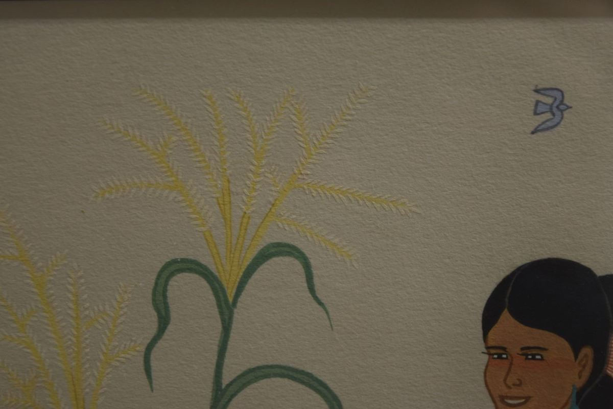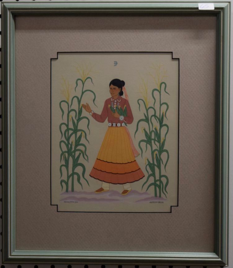 1970's original on paper depicting native woman picking corn signed Harrison Begay. 9.5'' x 7'' frame size 15'' x 13''