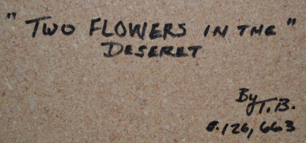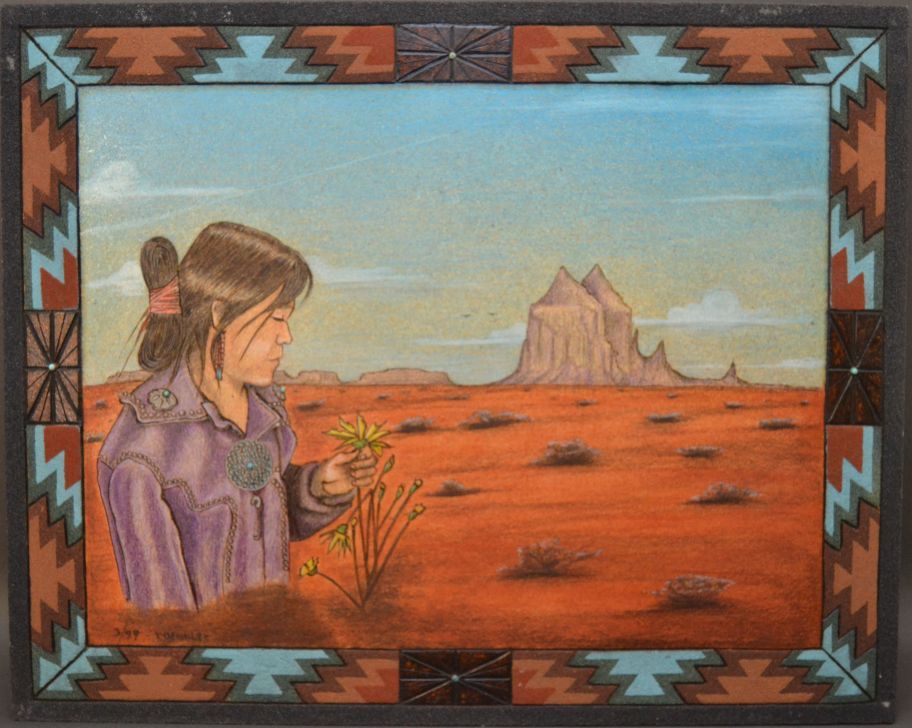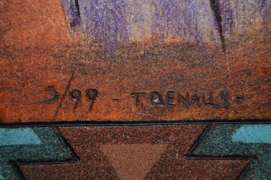 1999 mixed media sand paint and wood burn on hard board, titled "two flowers in the desert" signed T. Benally has minor rubs signed 16'' x 20''