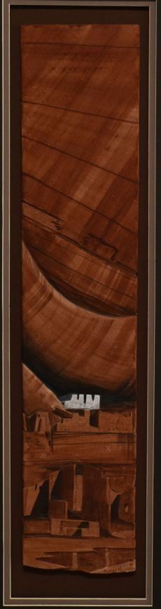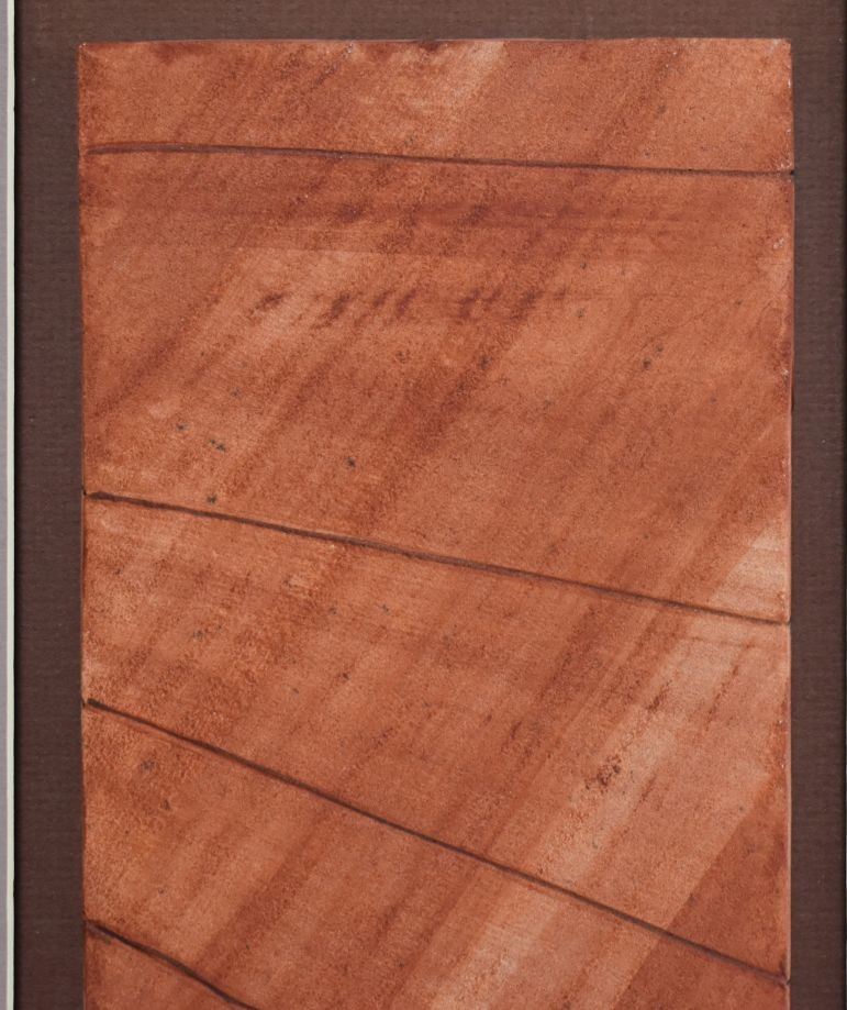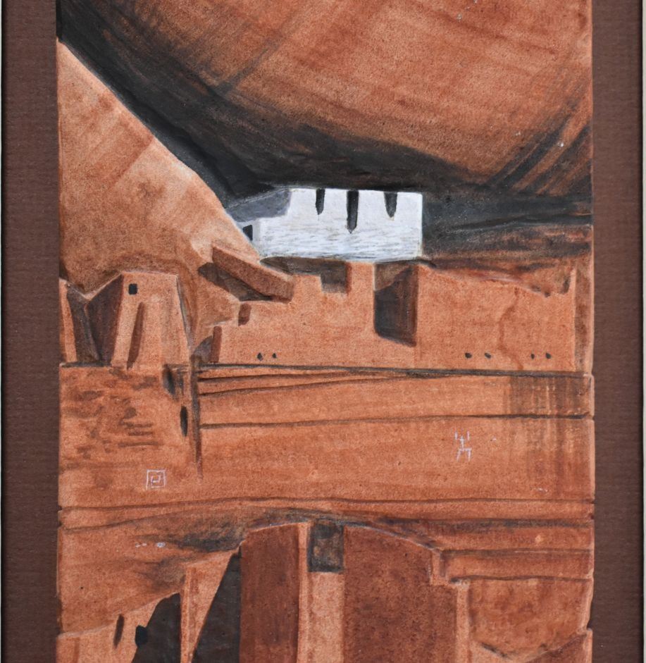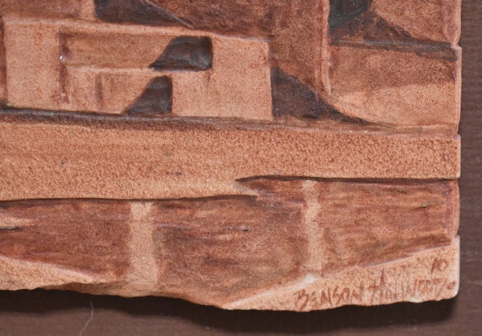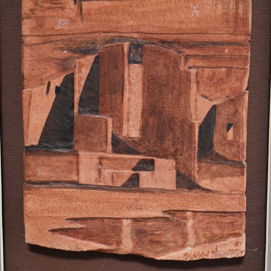 2010 Navajo. Original on sand stone depicting cliff dwelling signed Benson Halwood. 23'' x 5'' matt 32'' x 12''
