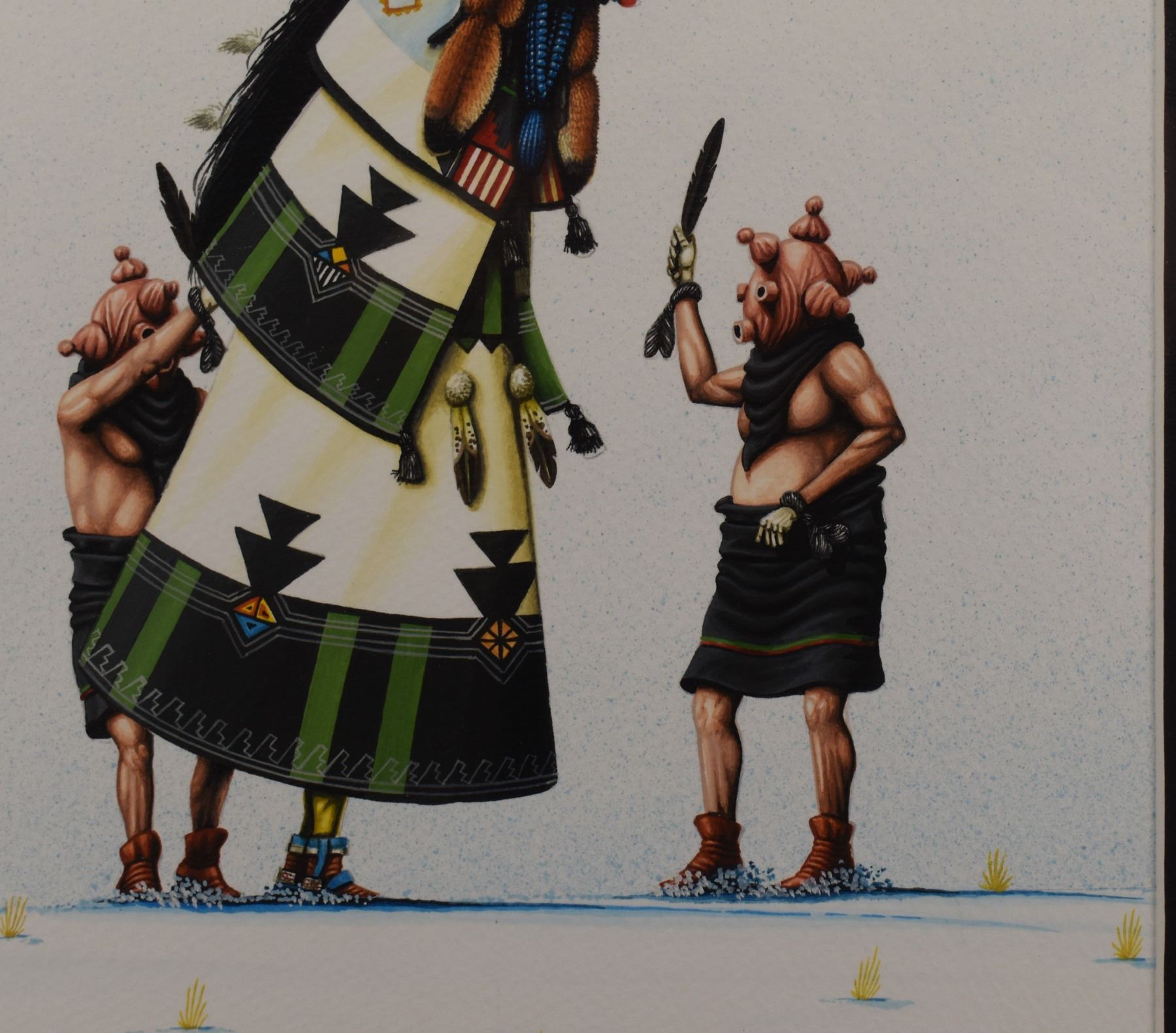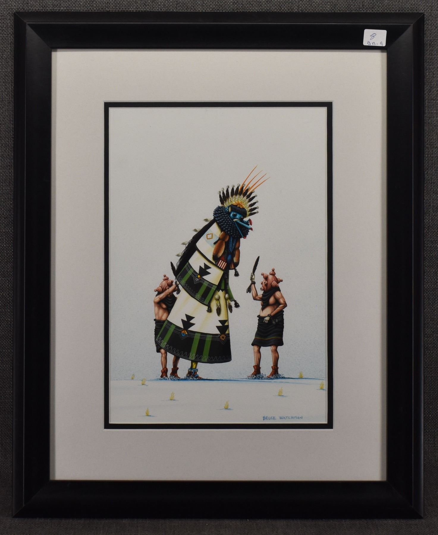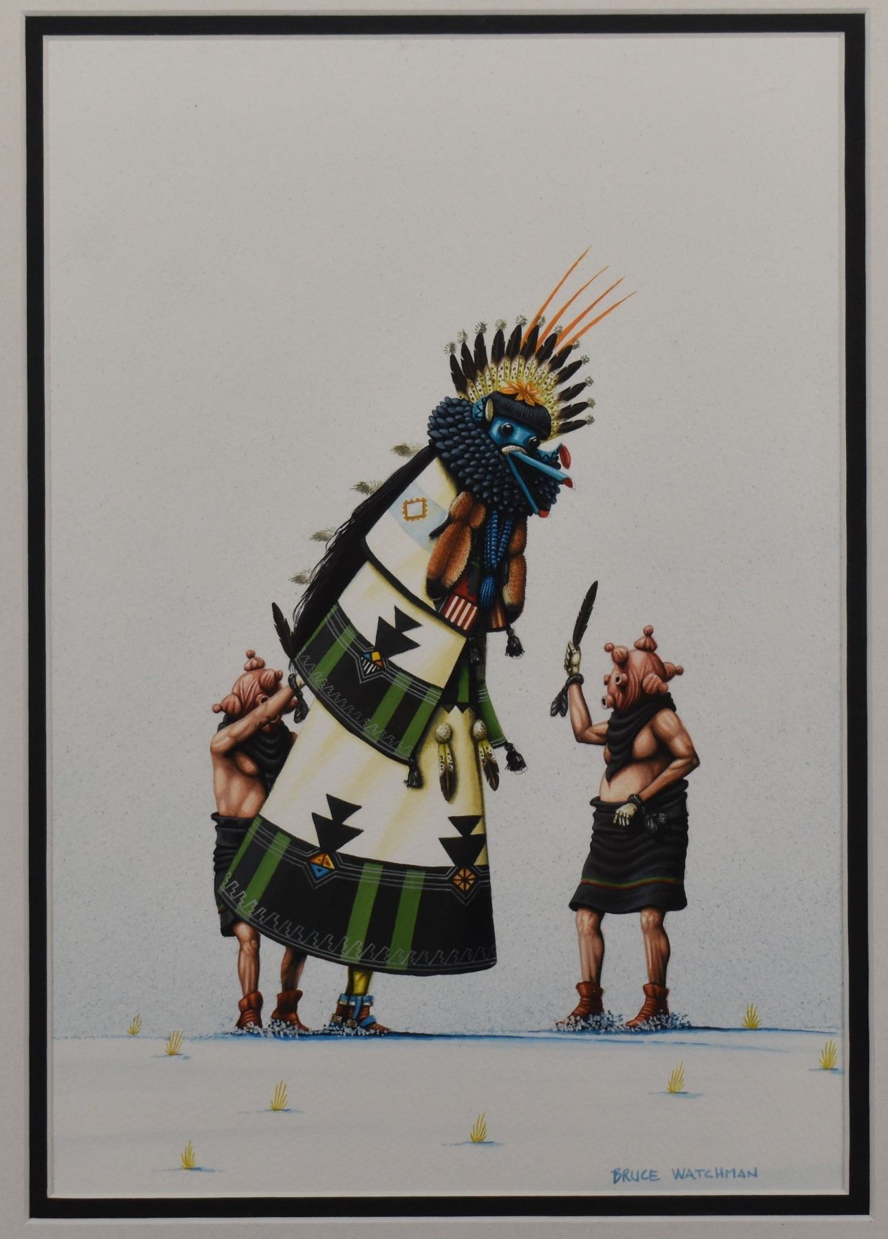 1980-90's Navajo, original hand painted depicting Shalako and mud head kachinas by Bruce Watchman 12.25" x 8.5" matted and framed to 19.75" x 16.25"