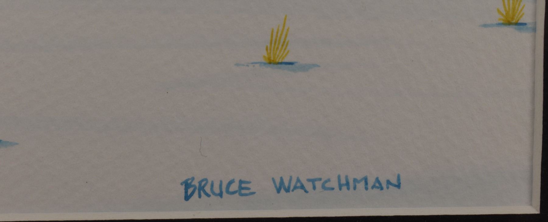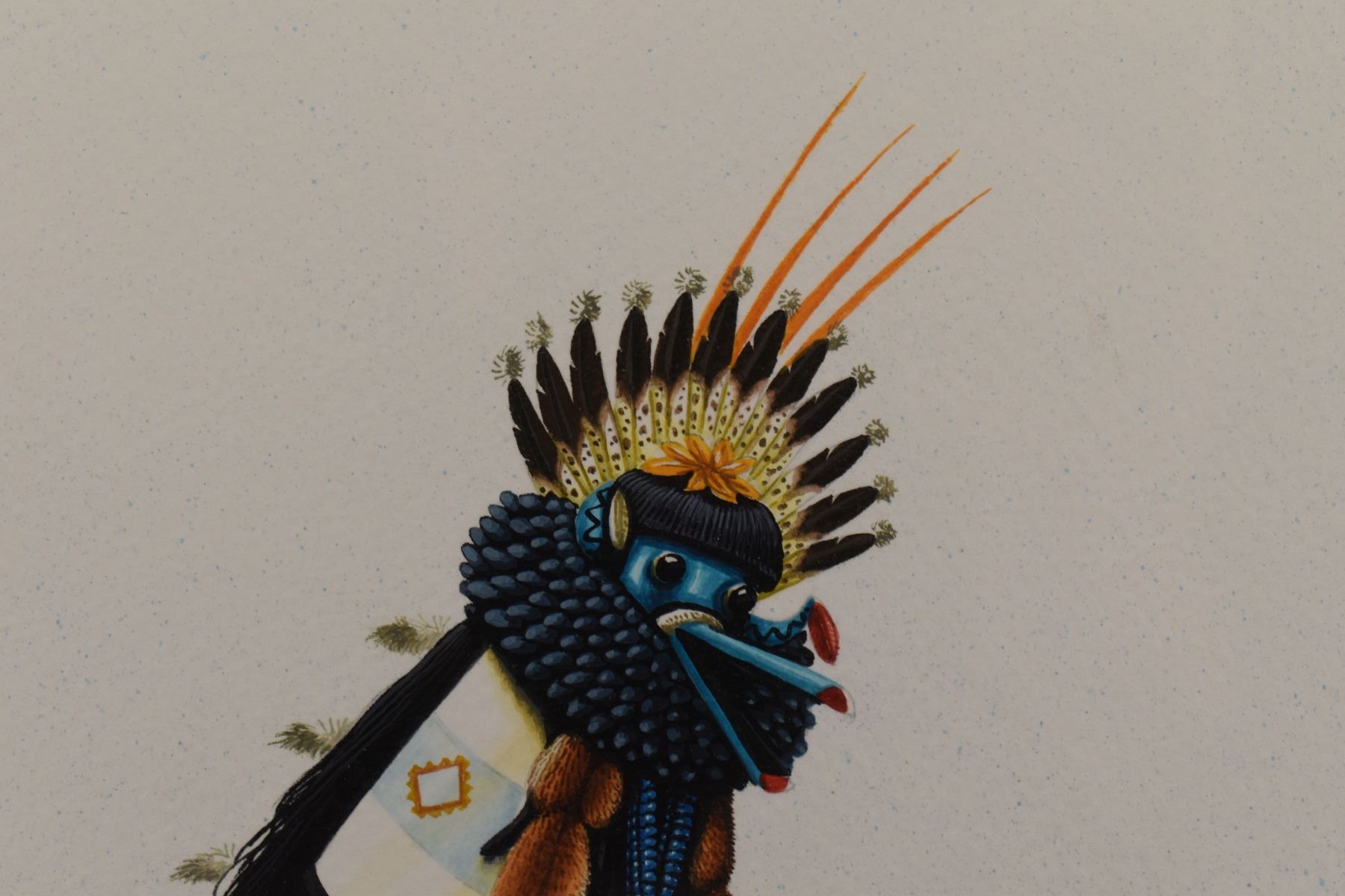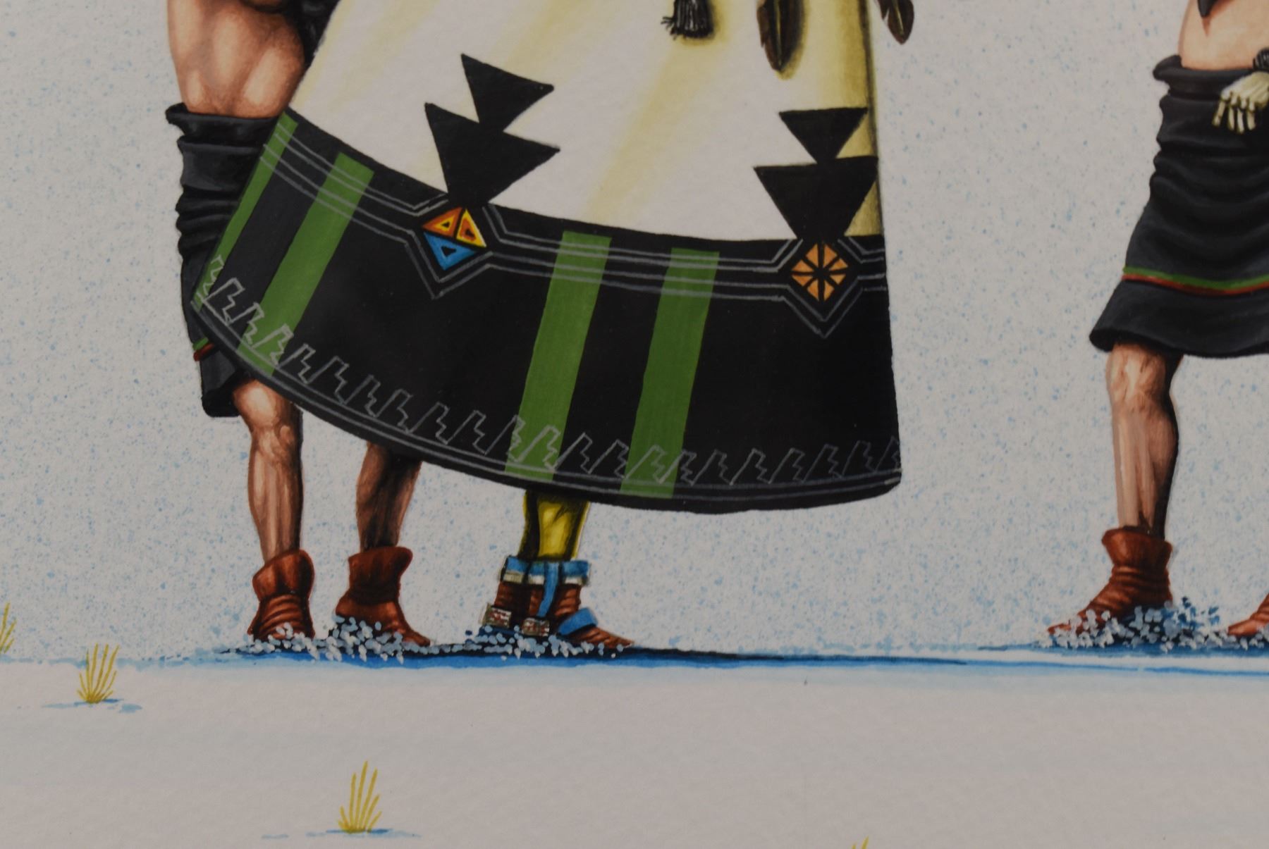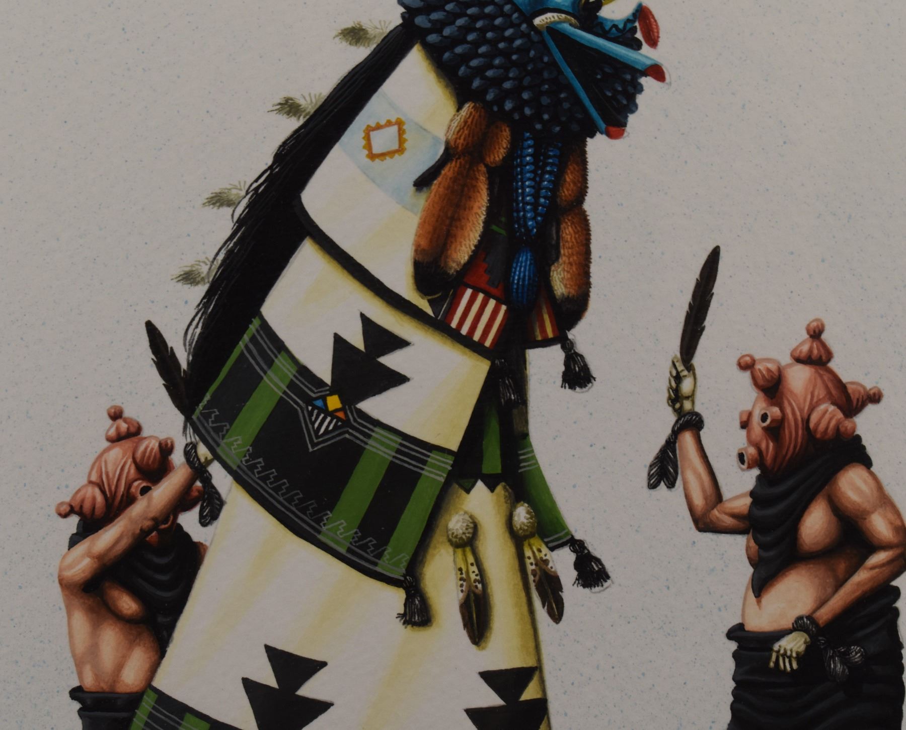 1980-90's Navajo, original hand painted depicting Shalako and mud head kachinas by Bruce Watchman 12.25" x 8.5" matted and framed to 19.75" x 16.25"