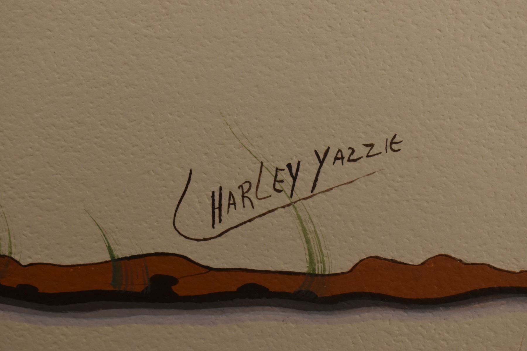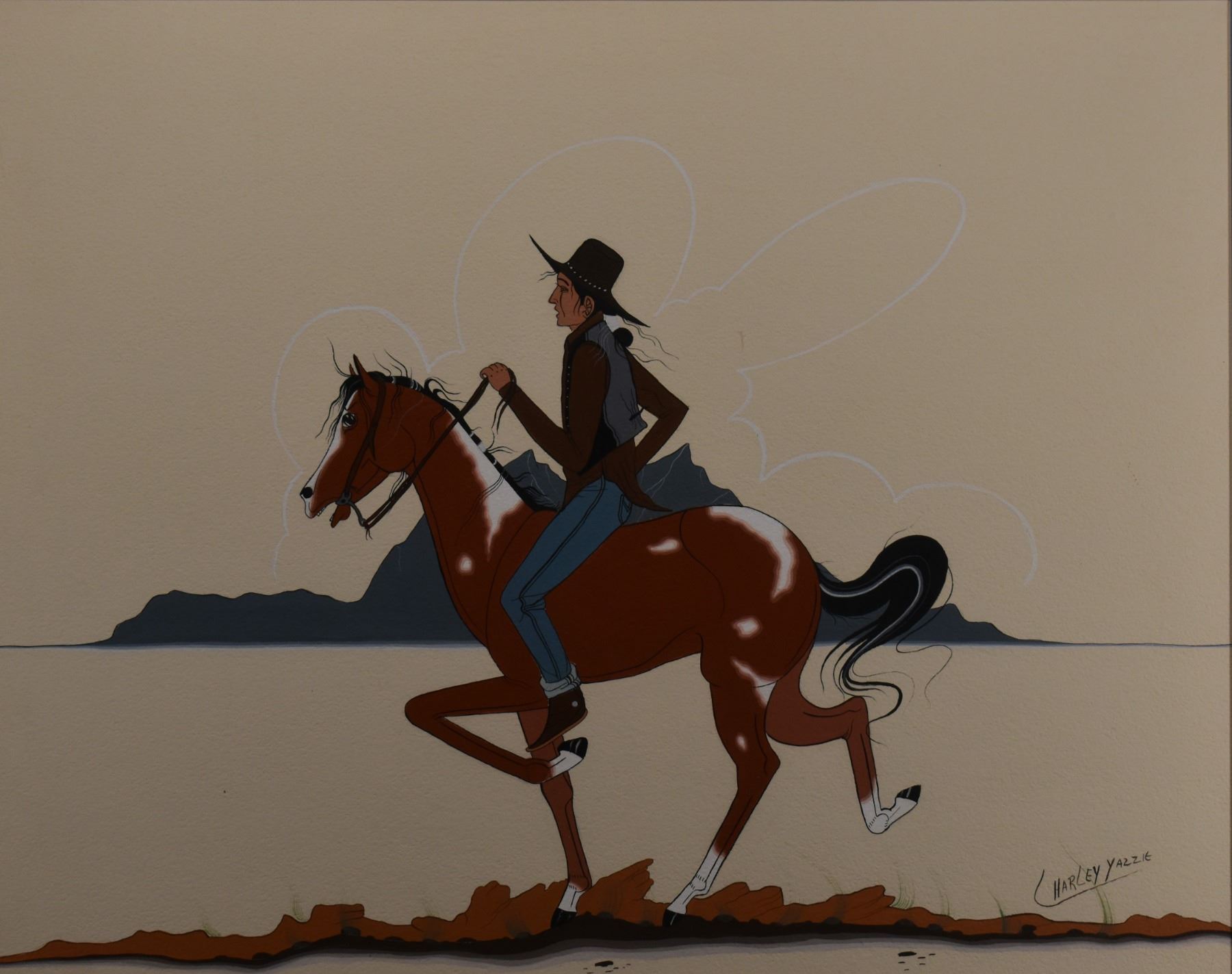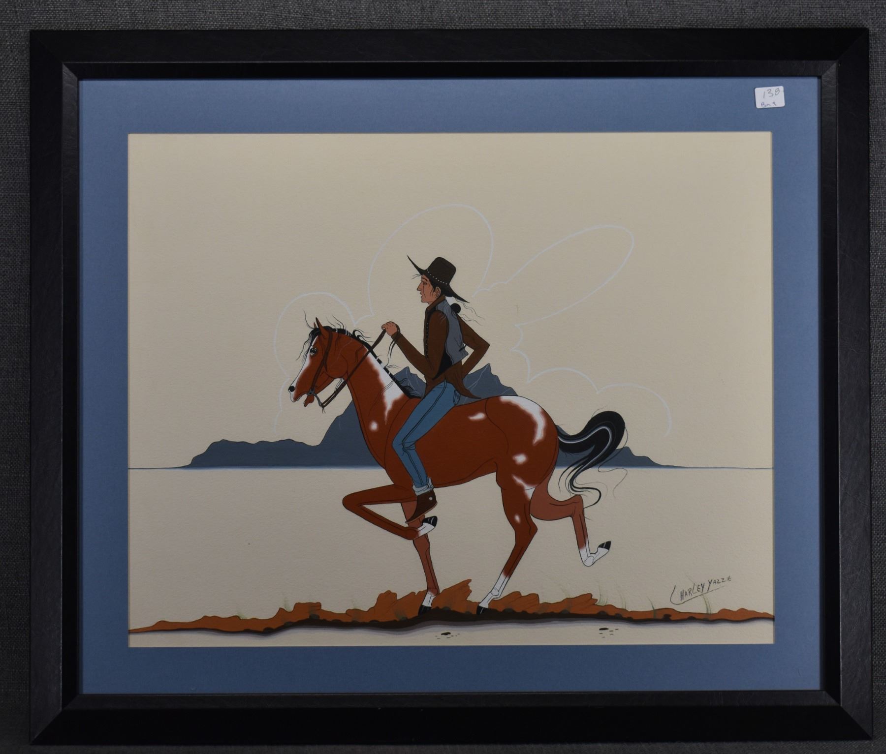 1970's Navajo. Original painting on paper depicting native man on horse, signed Charley Yazzie. 15'' x 19'' frame size 22'' x 26''