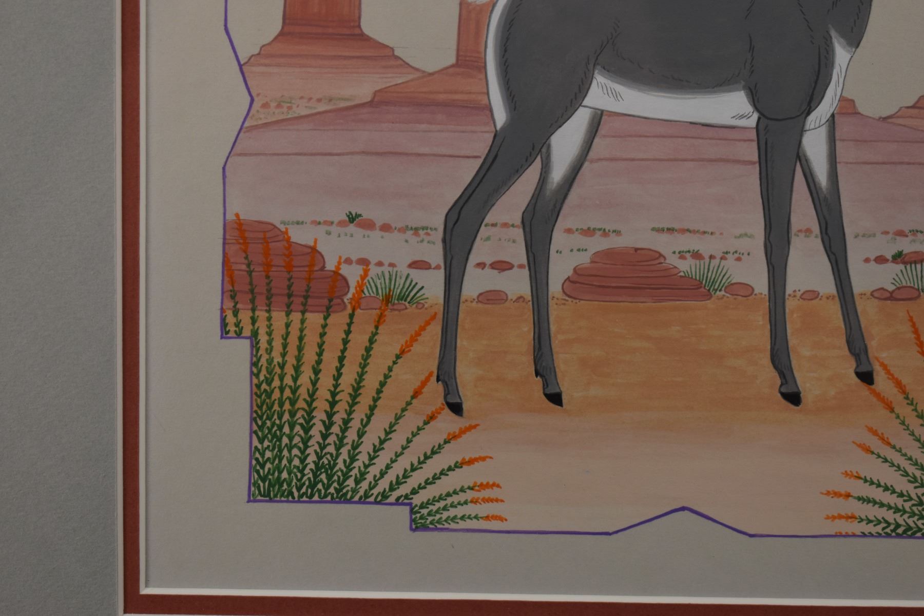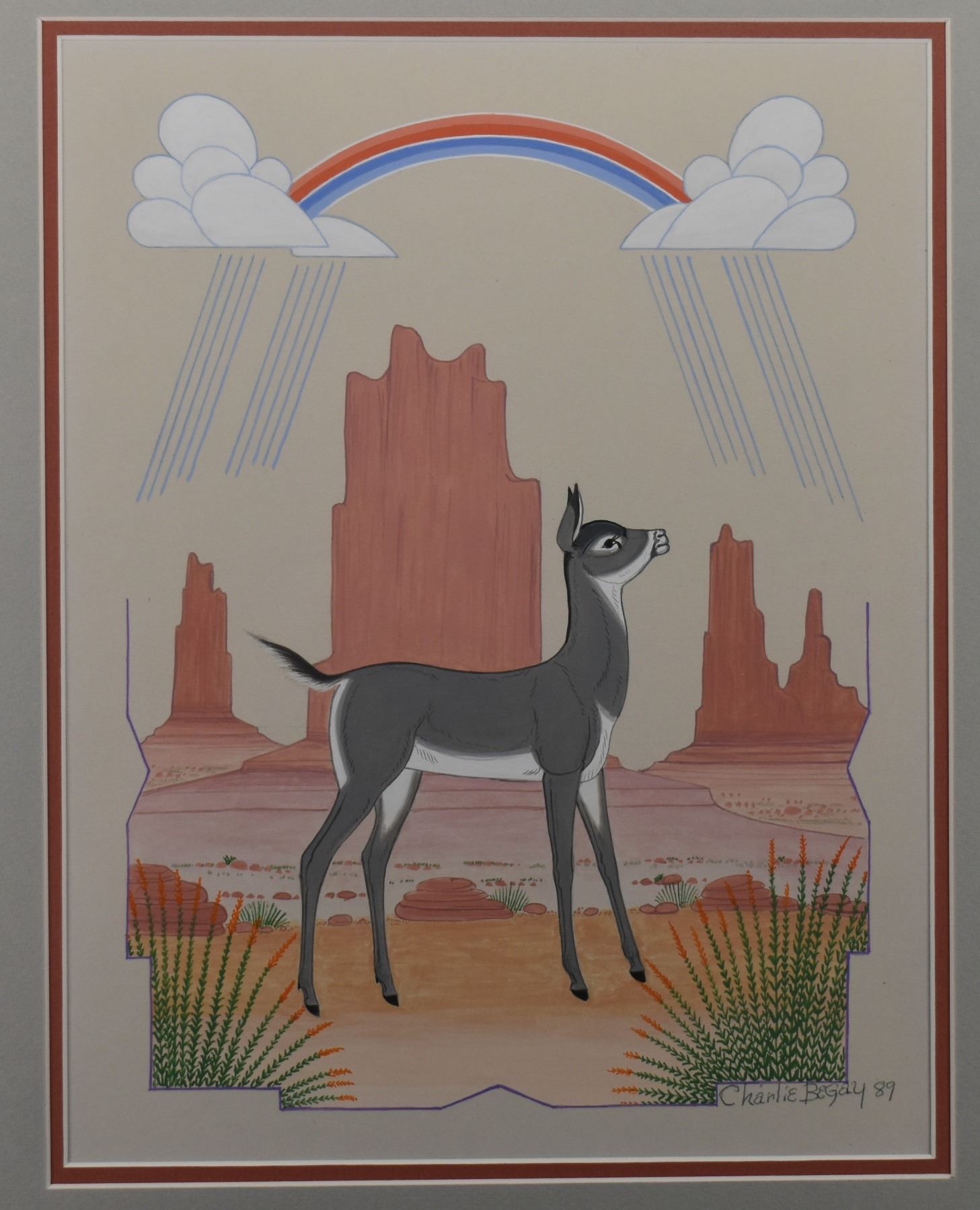 1989 Navajo. Original on paper depicting deer. Signed Charlie Begay. 13'' x 10'' frame size 22'' x 18''