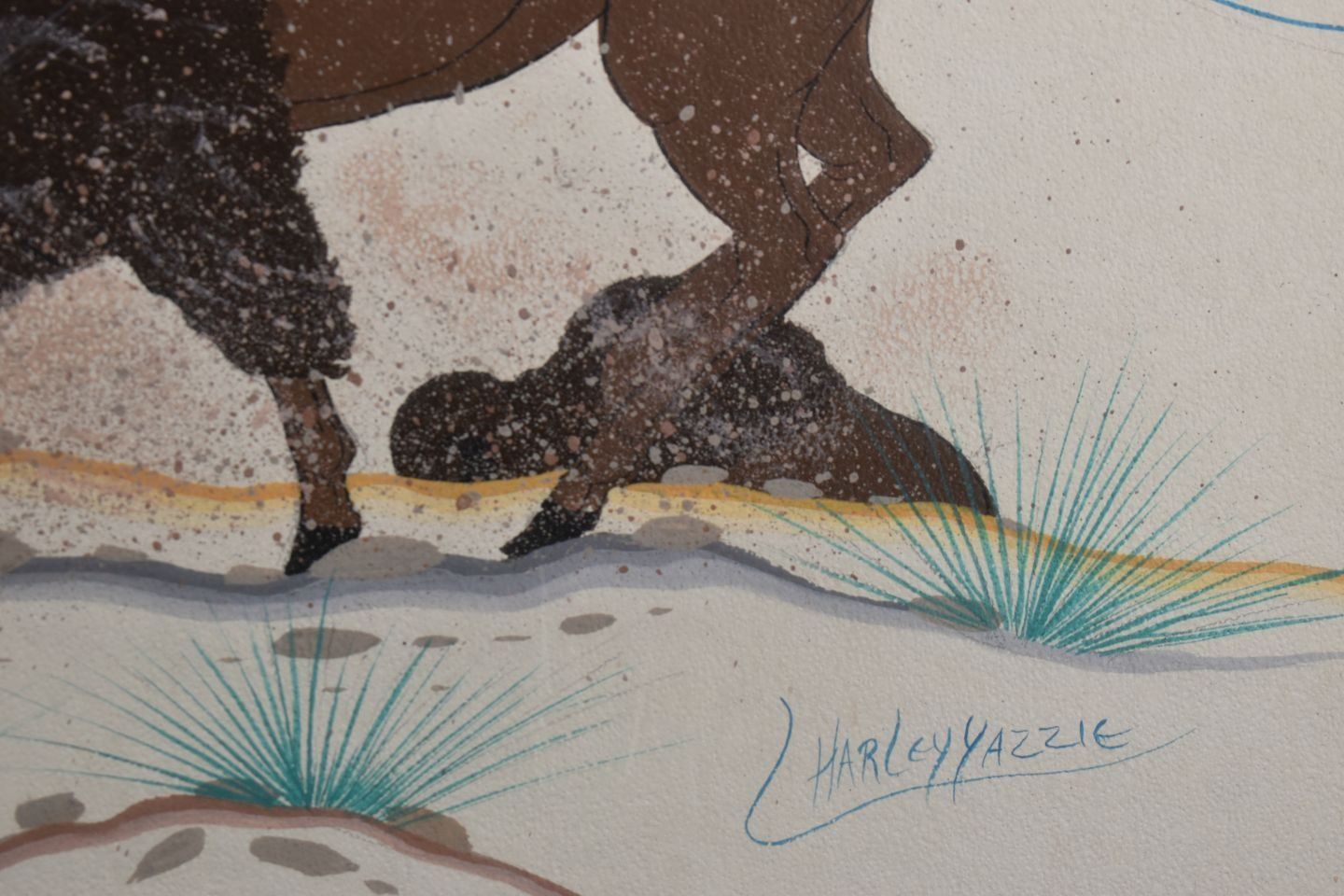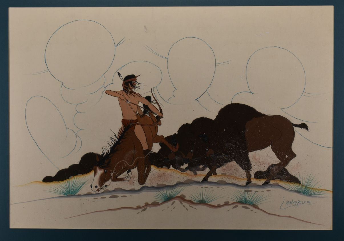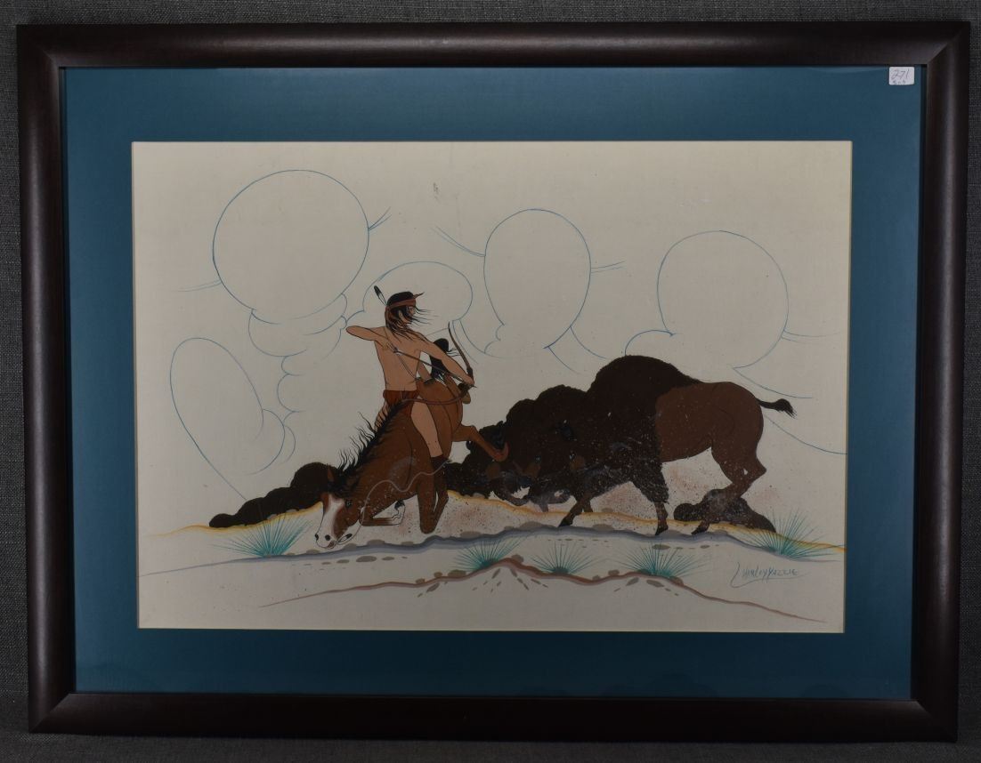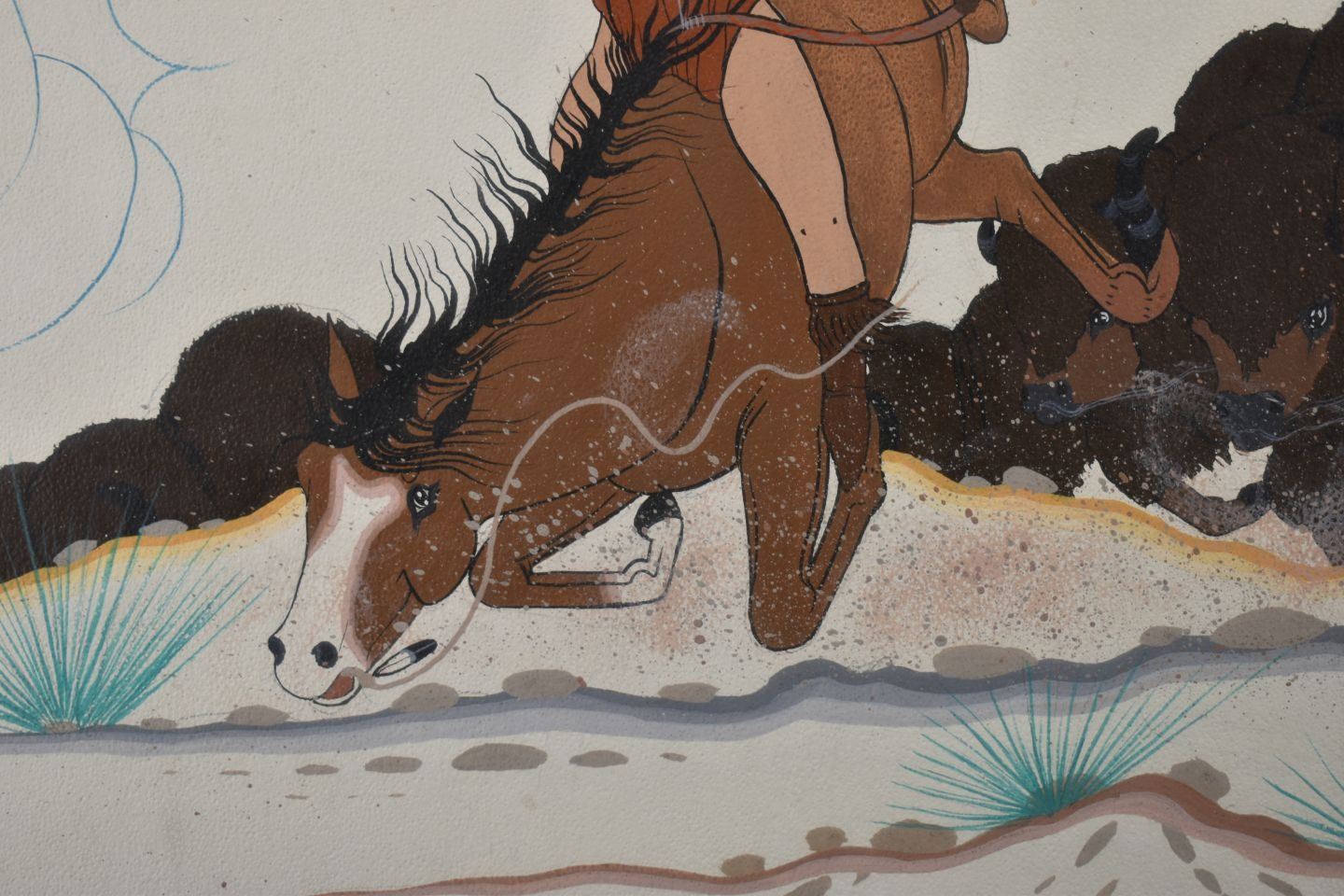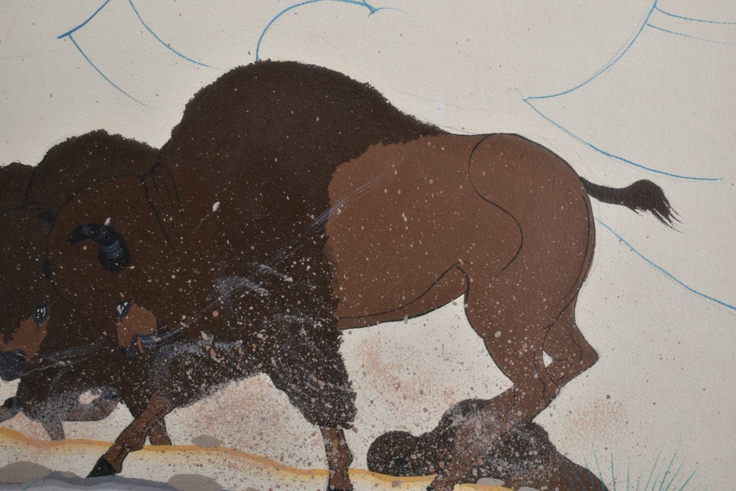 1970's Navajo, original hand painted depicting Buffalo hunt by Charley Yazzie 17.5" x 25.5" matted and framed to 25.5" x 33.5"