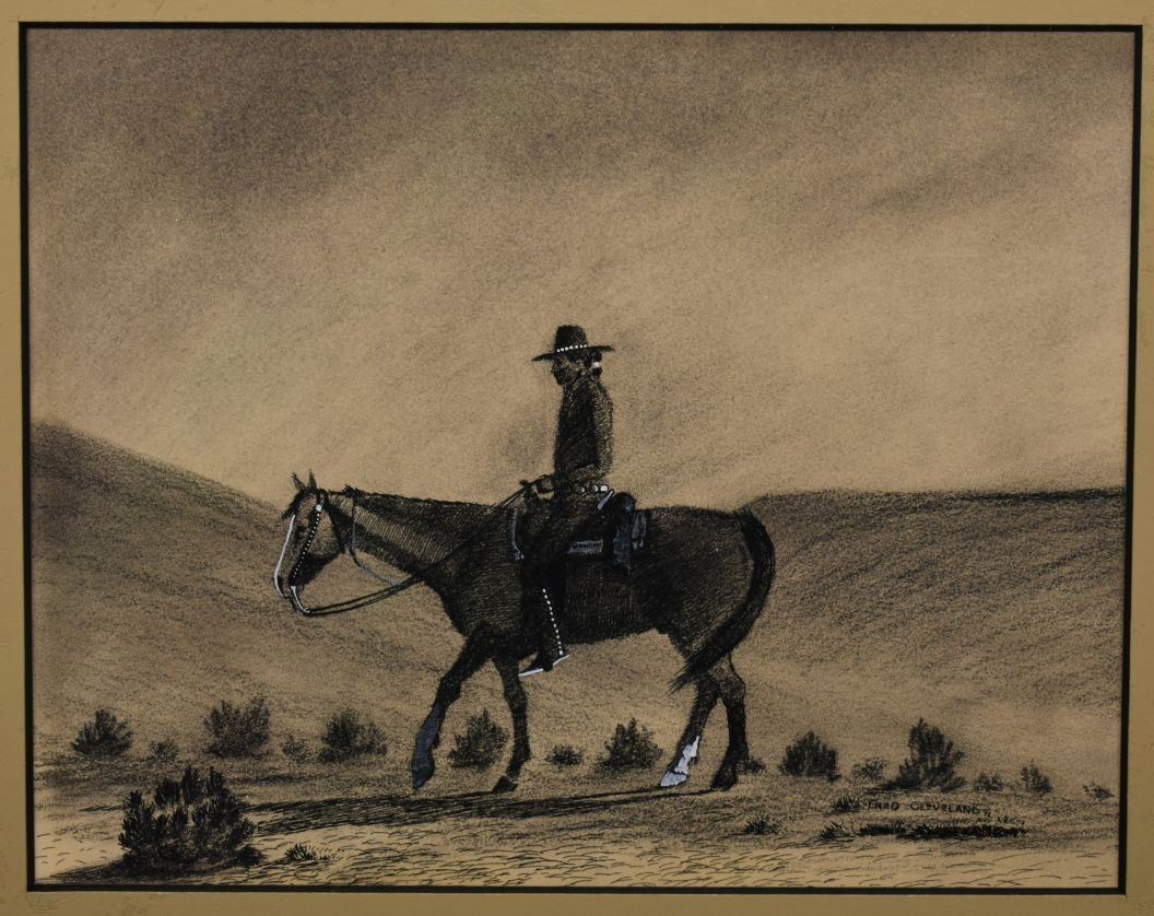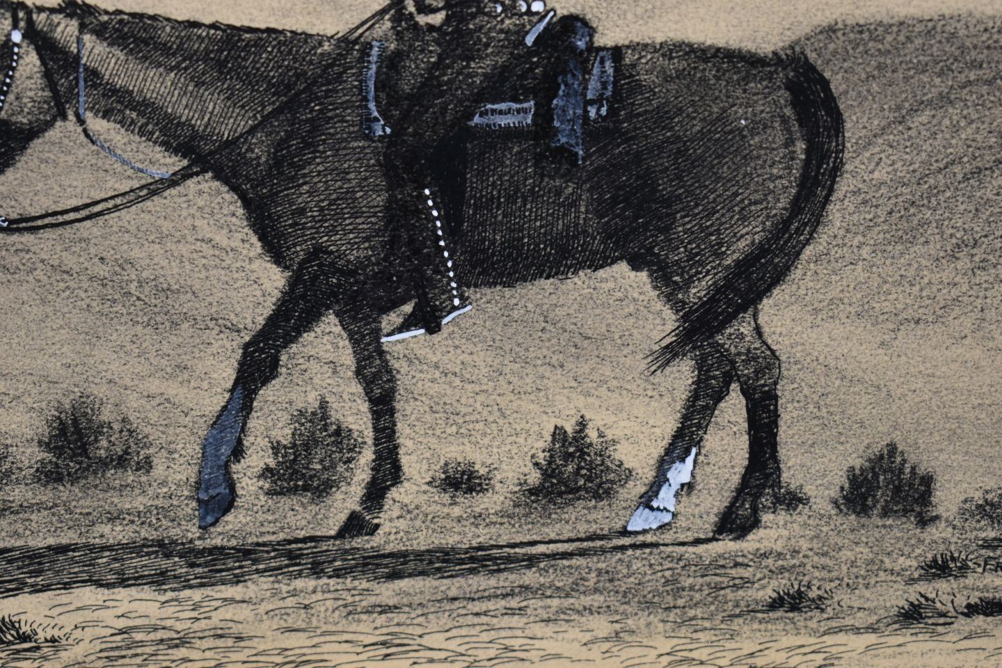 1971 Navajo, original hand drawn and painted depicting Navajo rider on horse by Fred Cleveland 8.25" x 10.5" matted and framed to 13.25" x 15.5"
