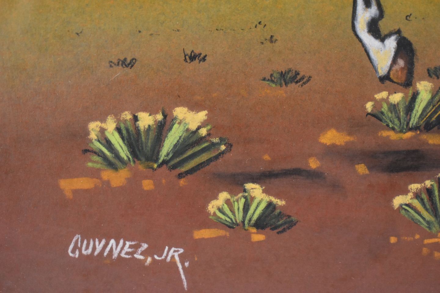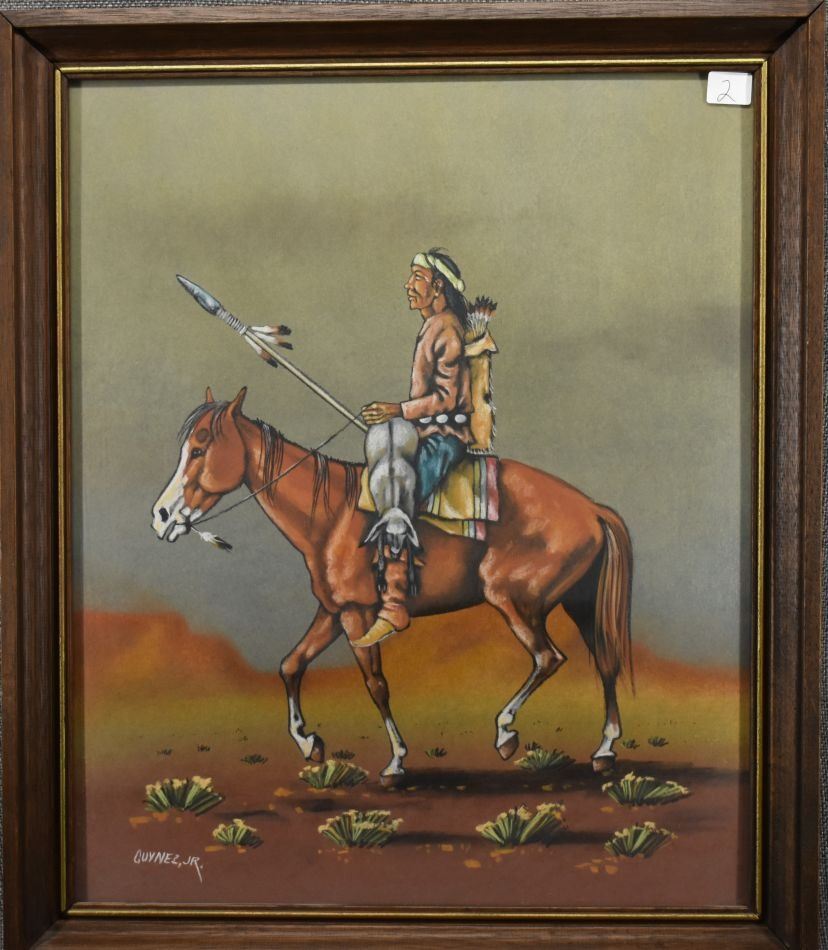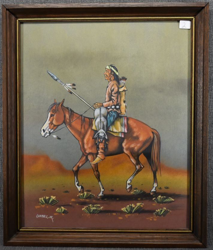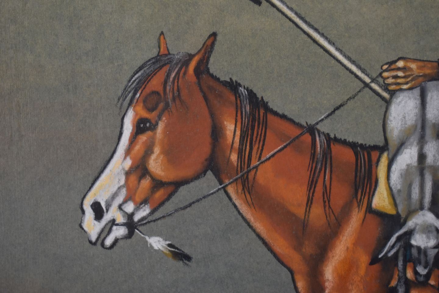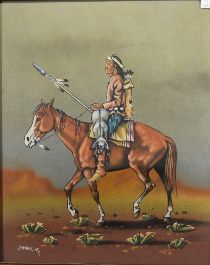 1970's Navajo. Original on paper depicting native Man on horse back, signed Guy Nez Jr, 17'' x 14'' frame size 19'' x 16''