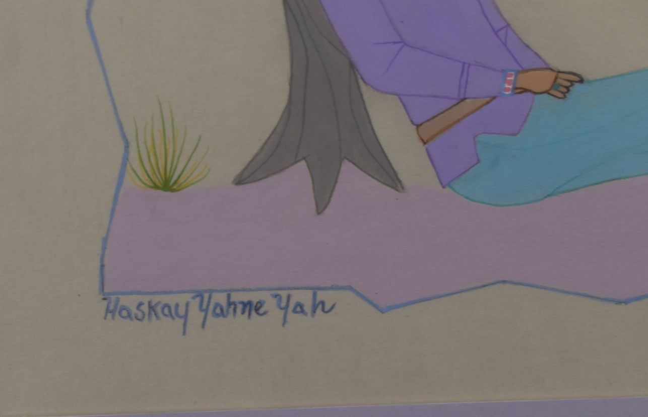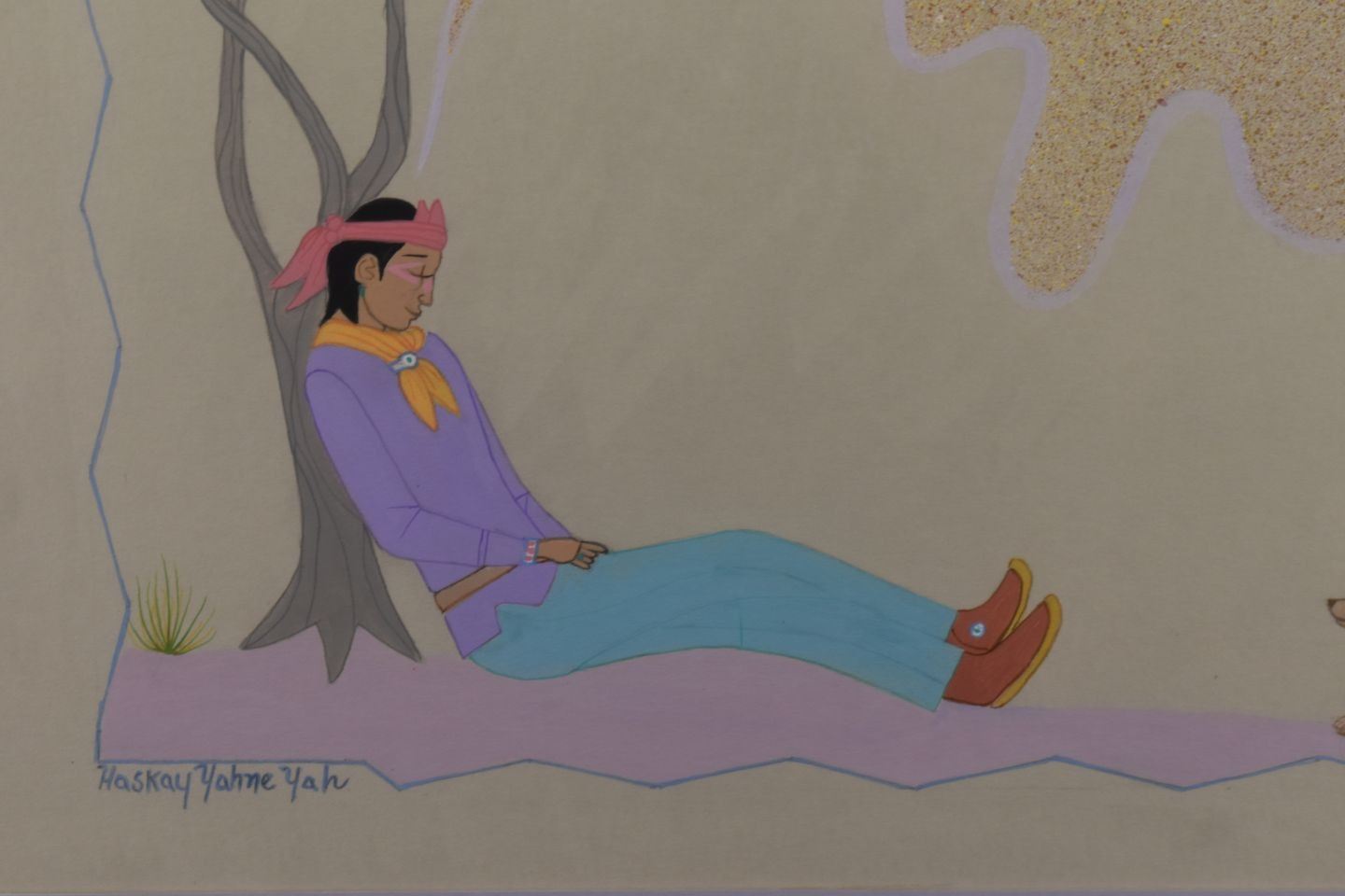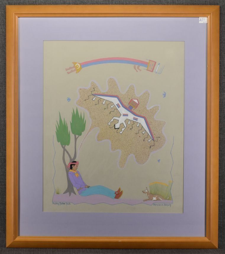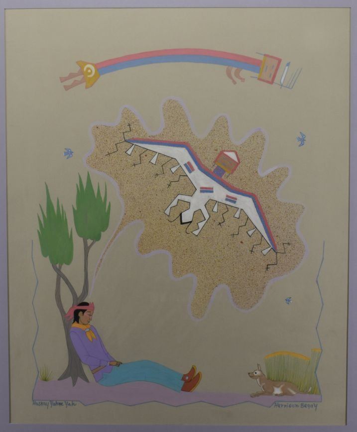 1970-80's Navajo, original hand painted depicting Navajo boy dreaming of thunderbird by Harrison Begay 18" x 14.5" matted and framed to 25.5" x 22"