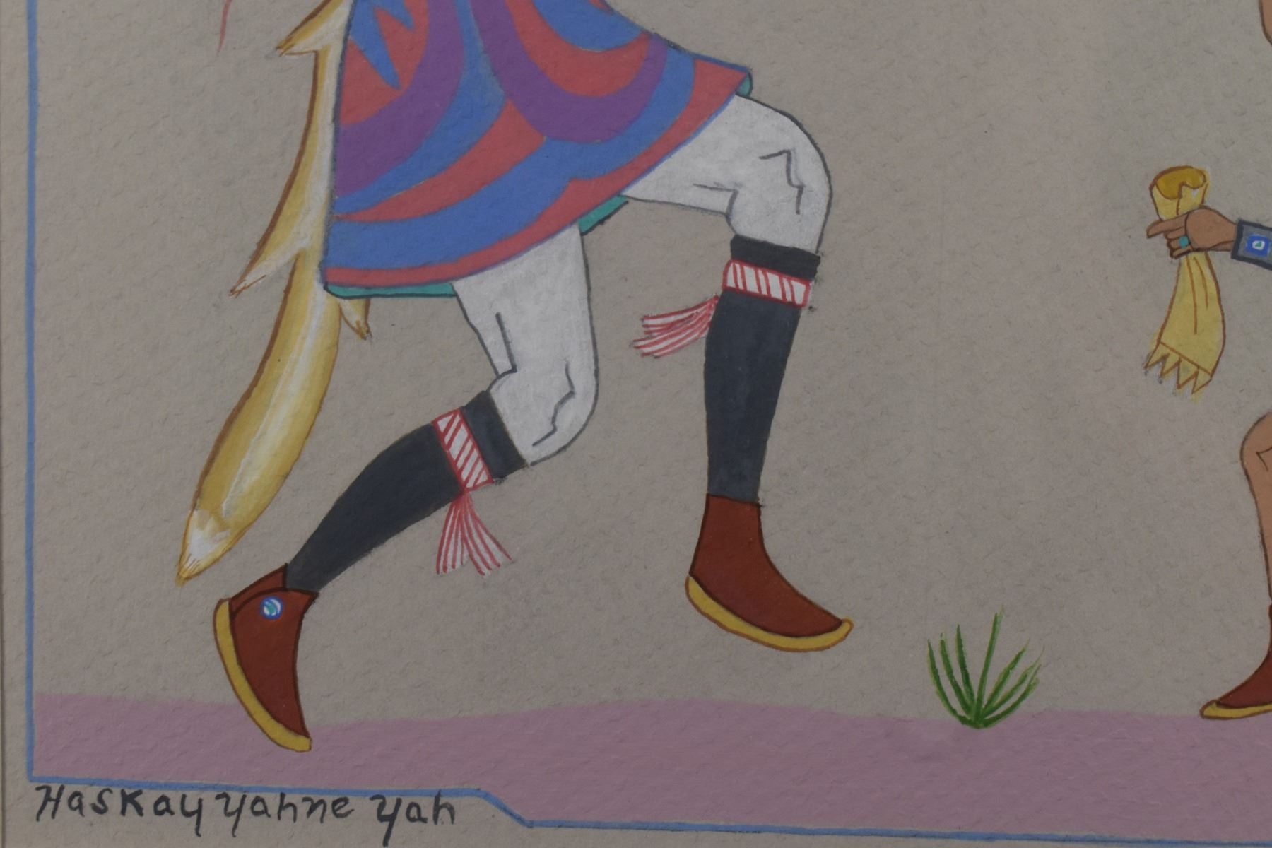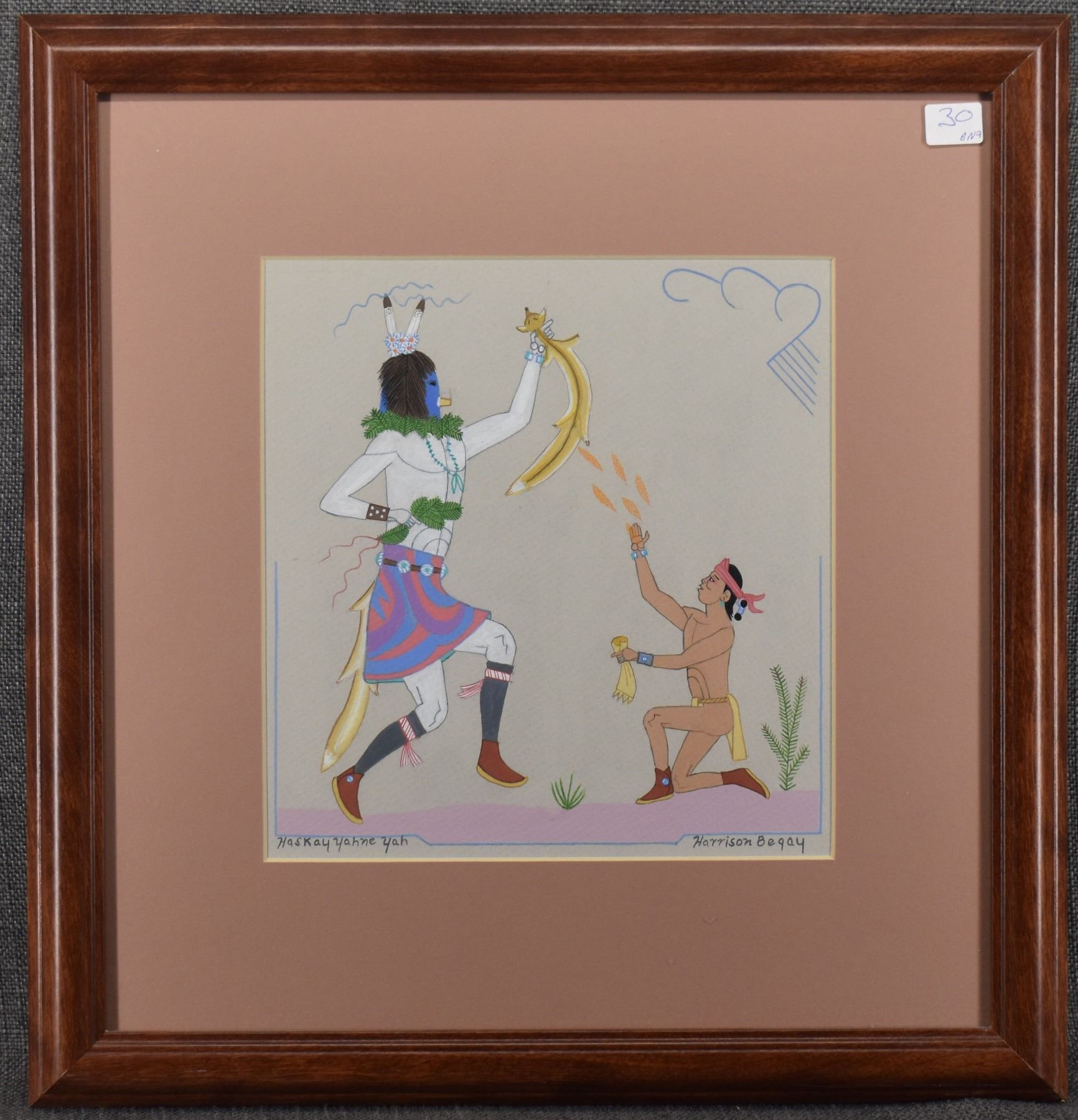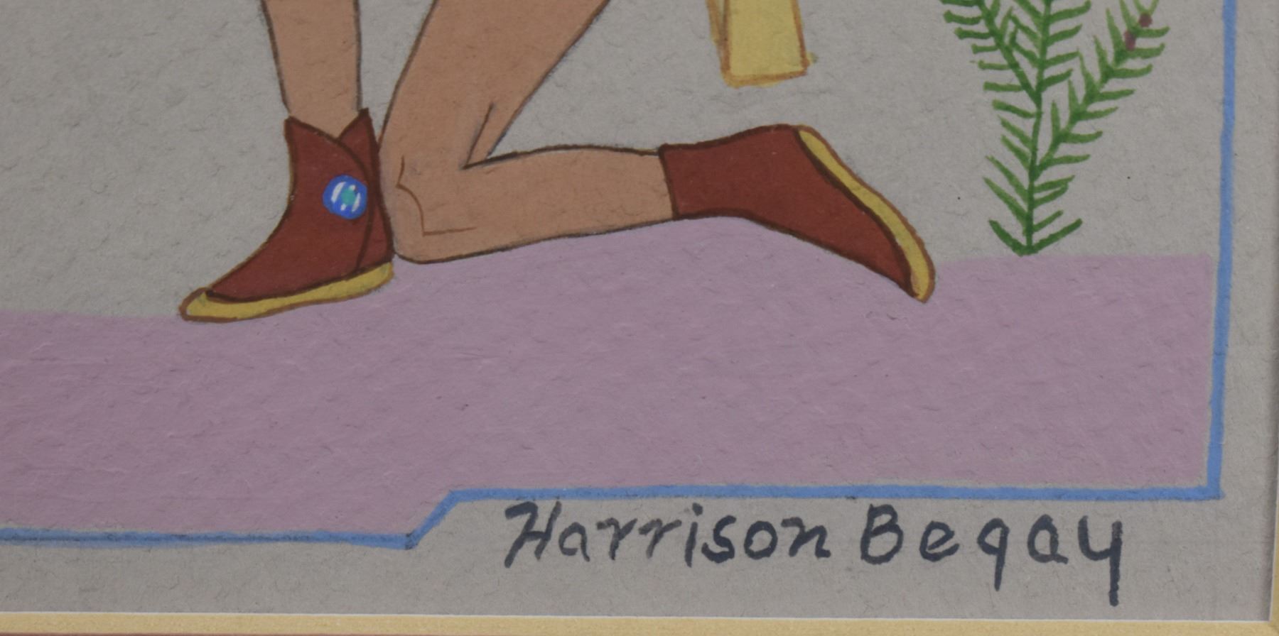 1980's Navajo. Original on paper depicting Native Man And Yei. Signed Harrison Begay. 9'' x 9'' frame size 17'' x 17''