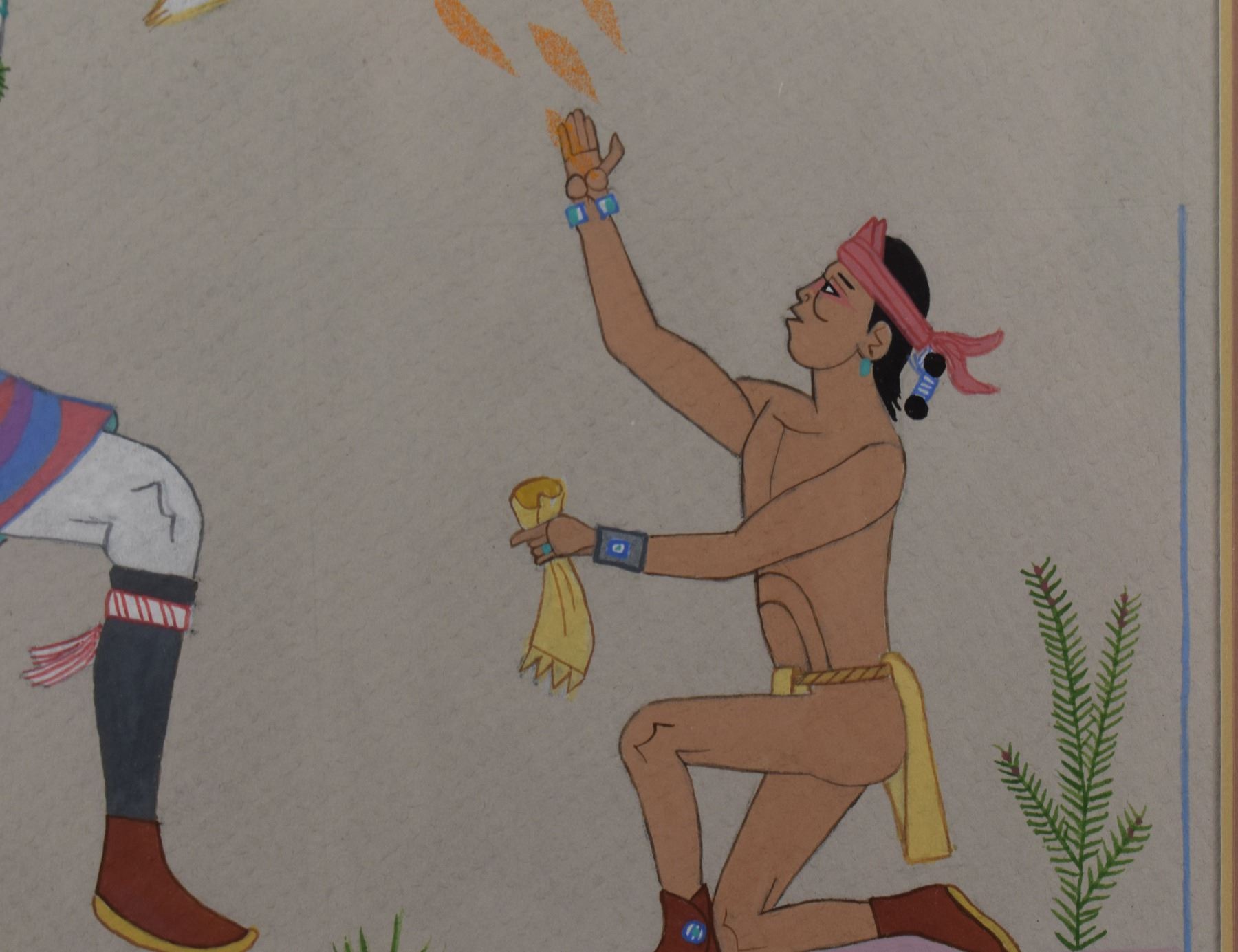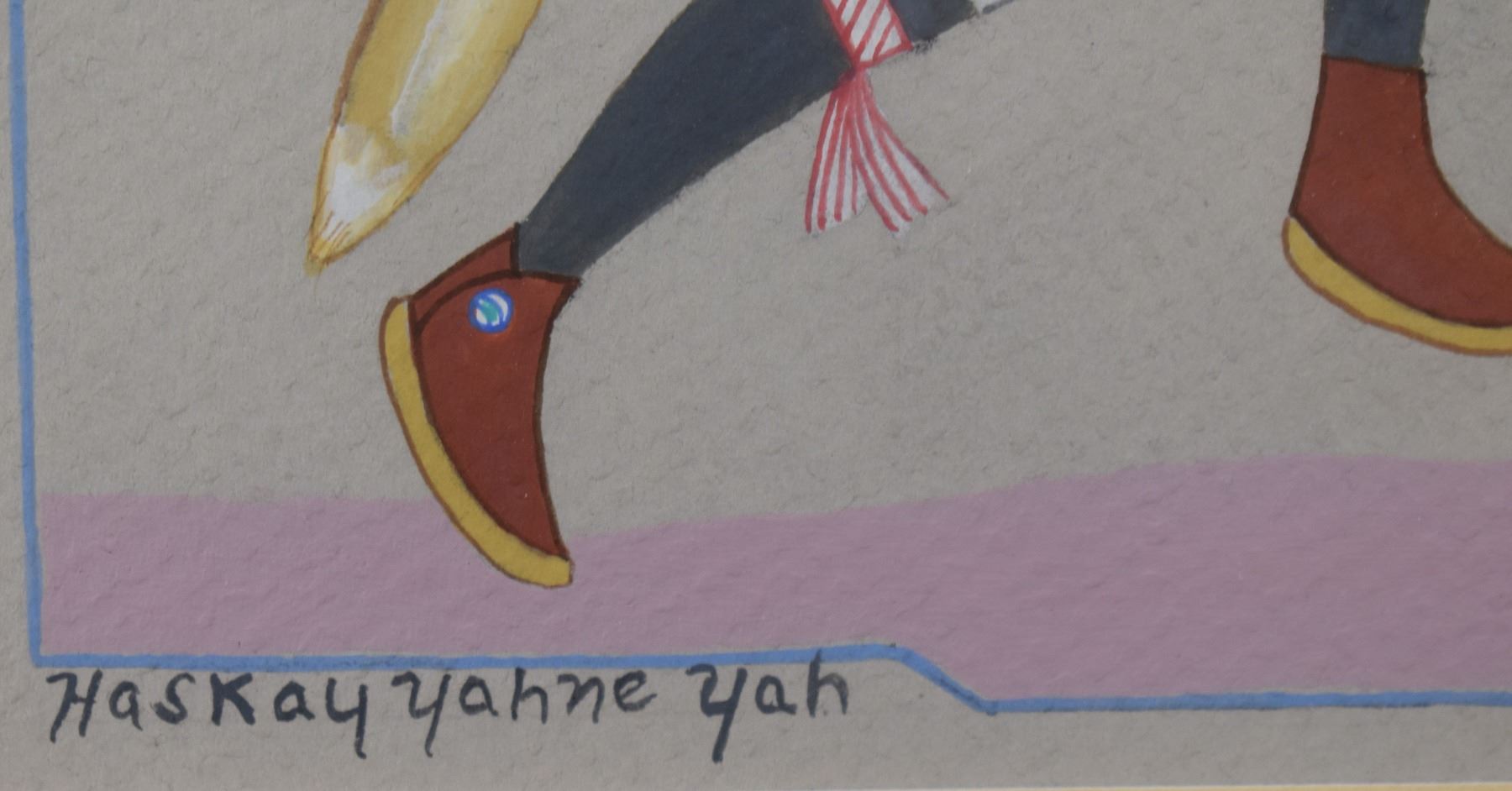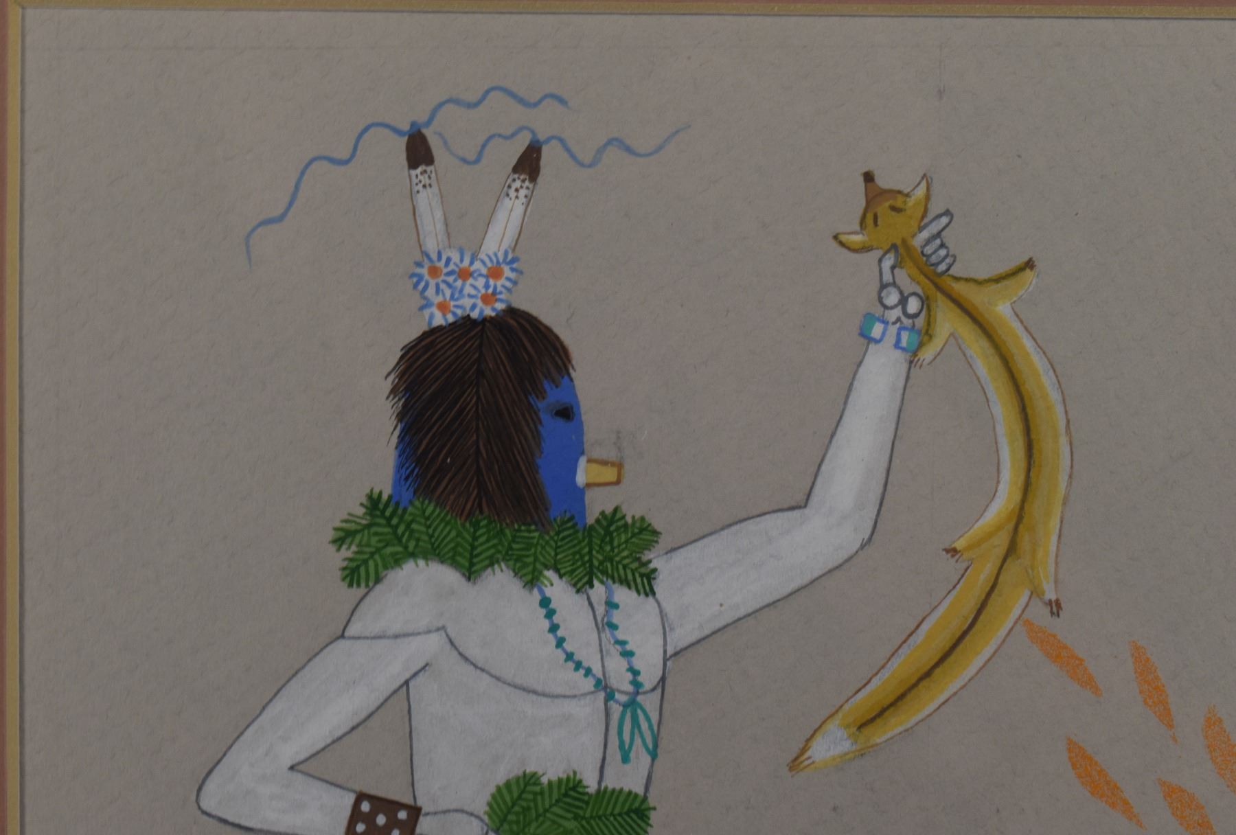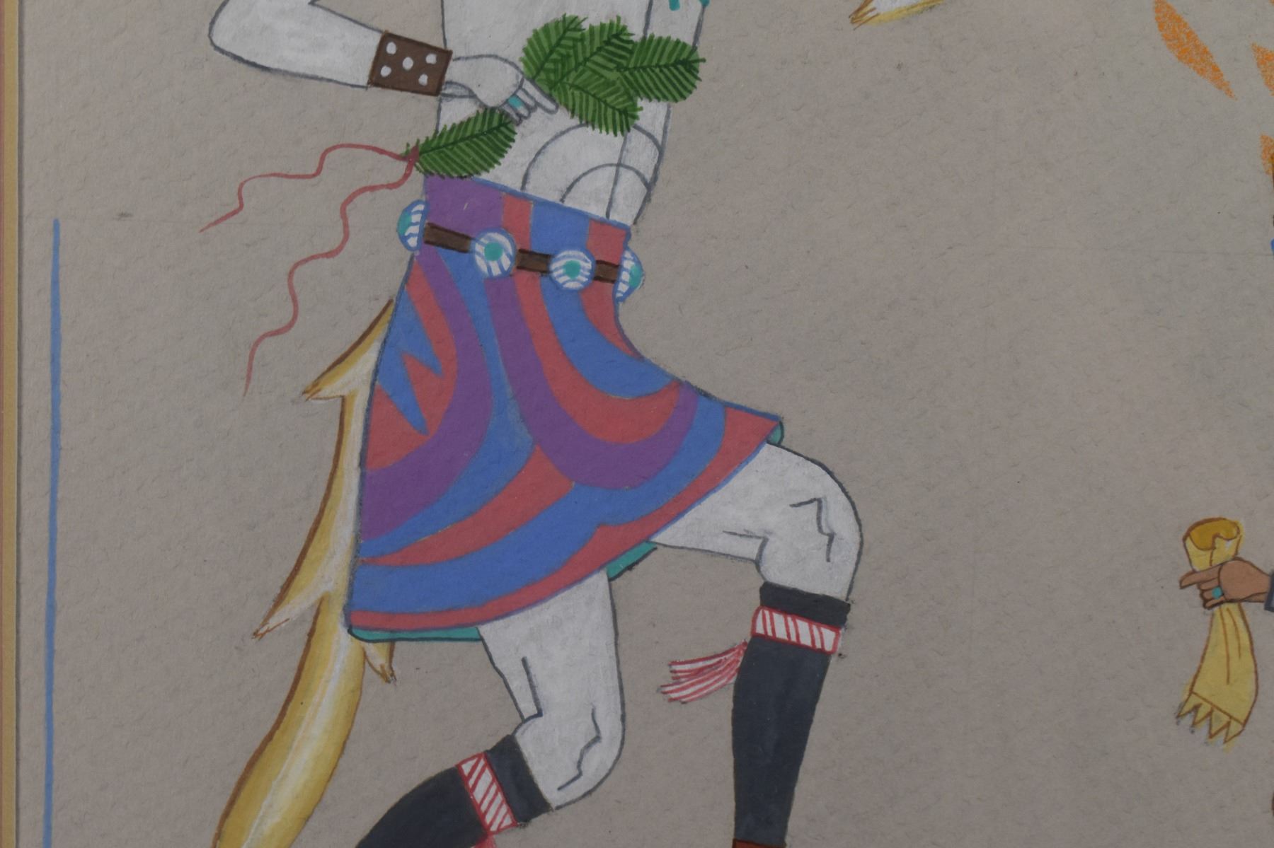1980's Navajo. Original on paper depicting Native Man And Yei. Signed Harrison Begay. 9'' x 9'' frame size 17'' x 17''