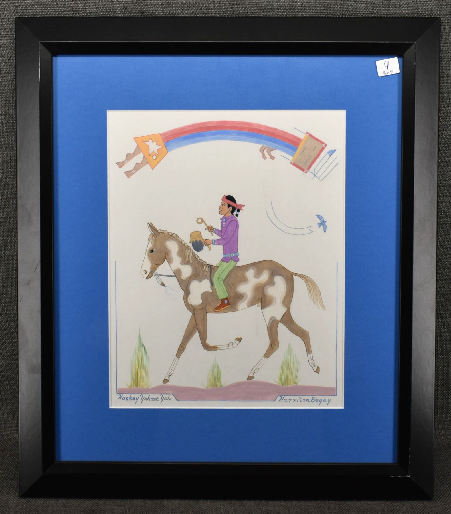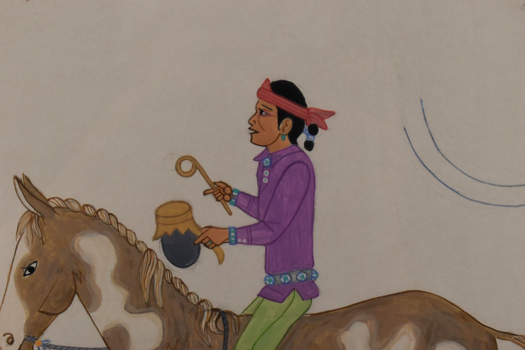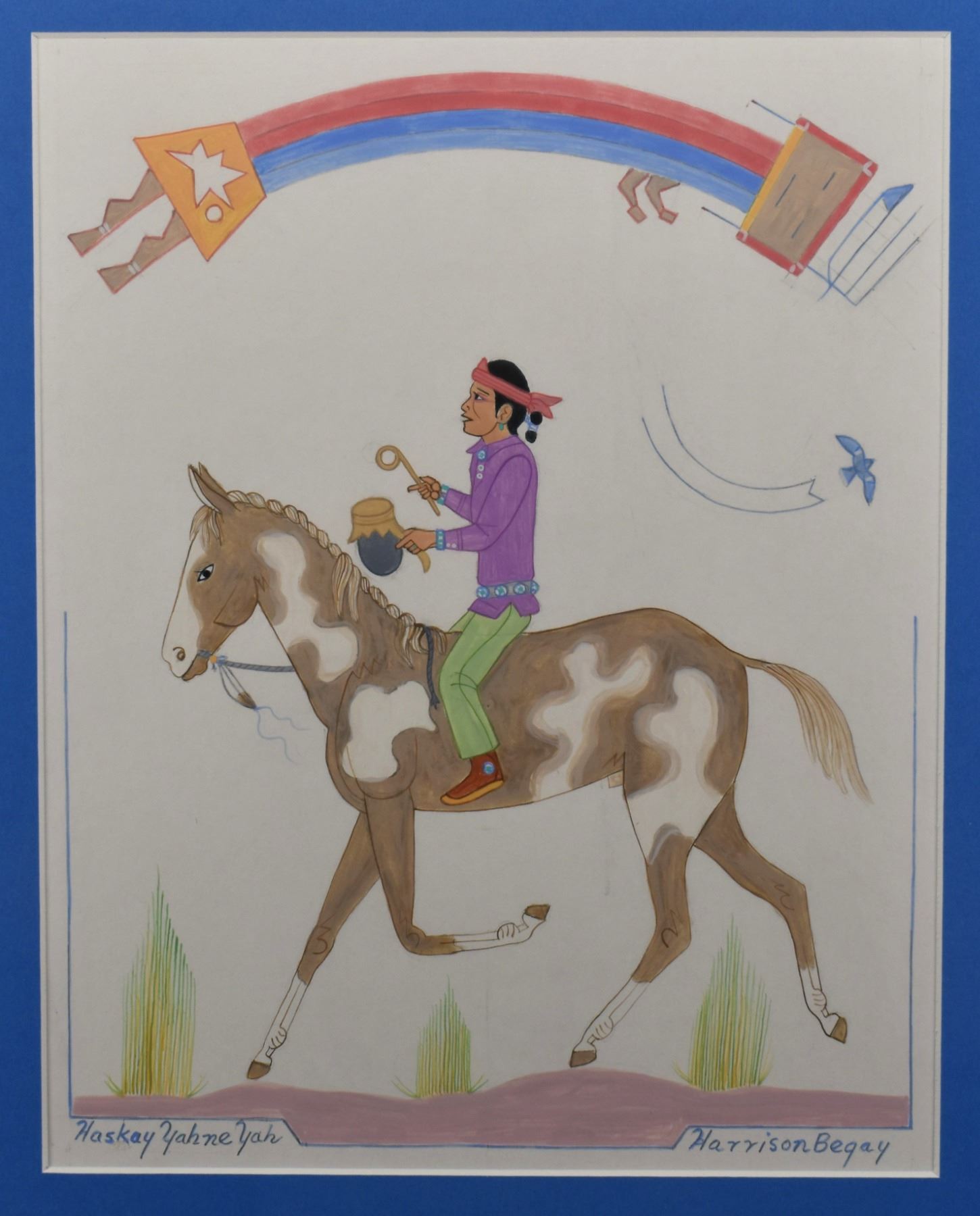1970's Navajo, original hand painted depicting Navajo boy singing on horseback by Harrison Begay 12" x 9.5" matted and framed to 19.5" x 17"