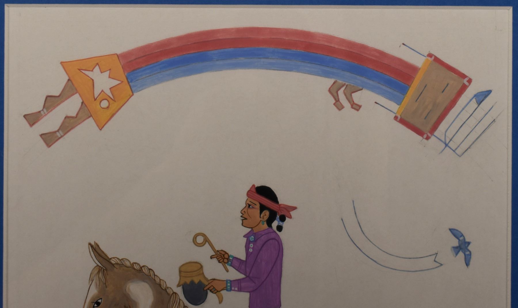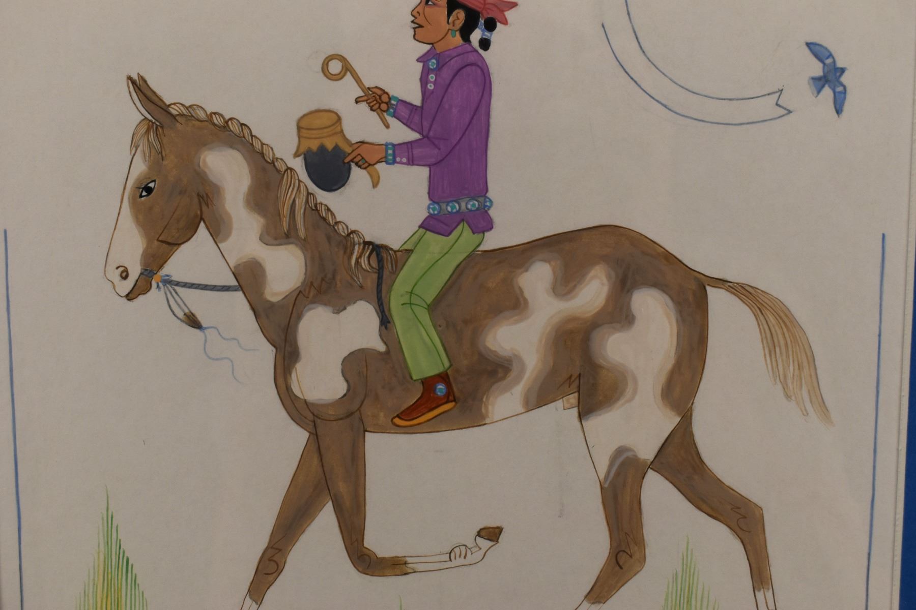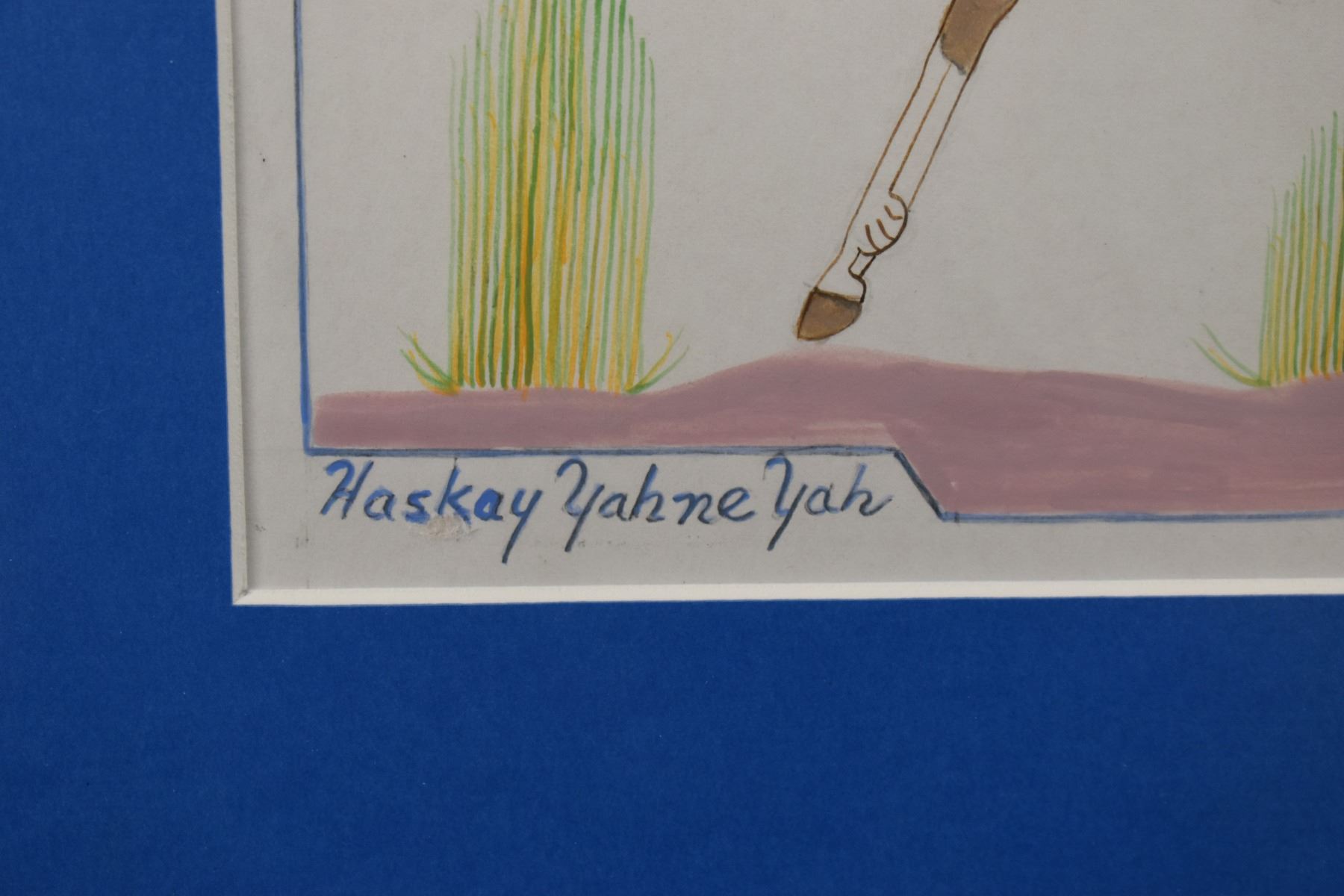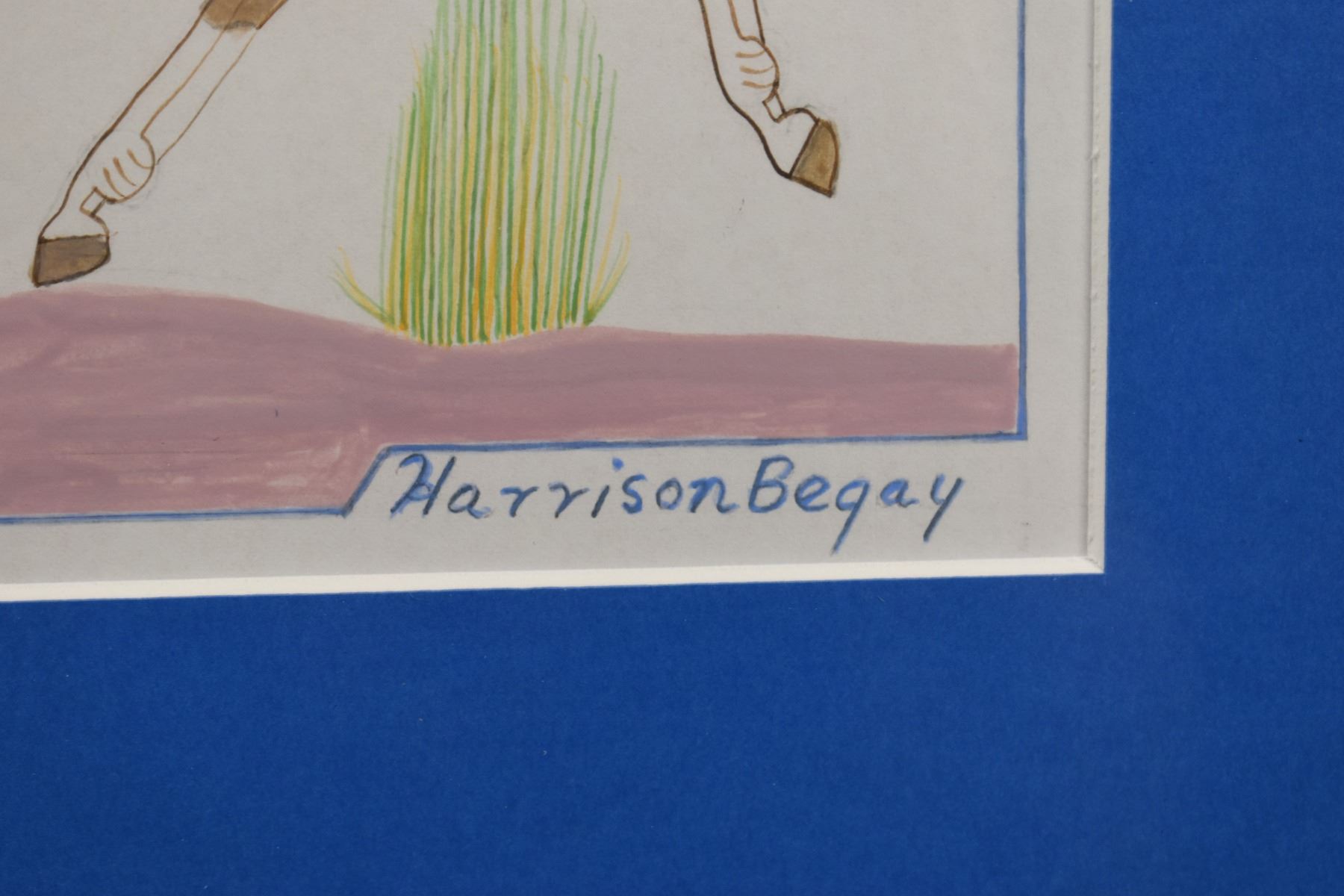1970's Navajo, original hand painted depicting Navajo boy singing on horseback by Harrison Begay 12" x 9.5" matted and framed to 19.5" x 17"