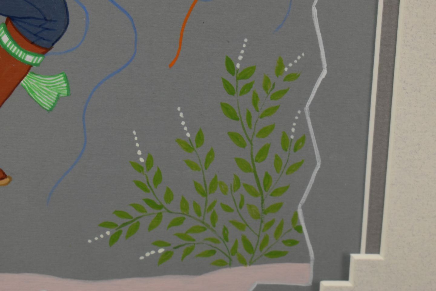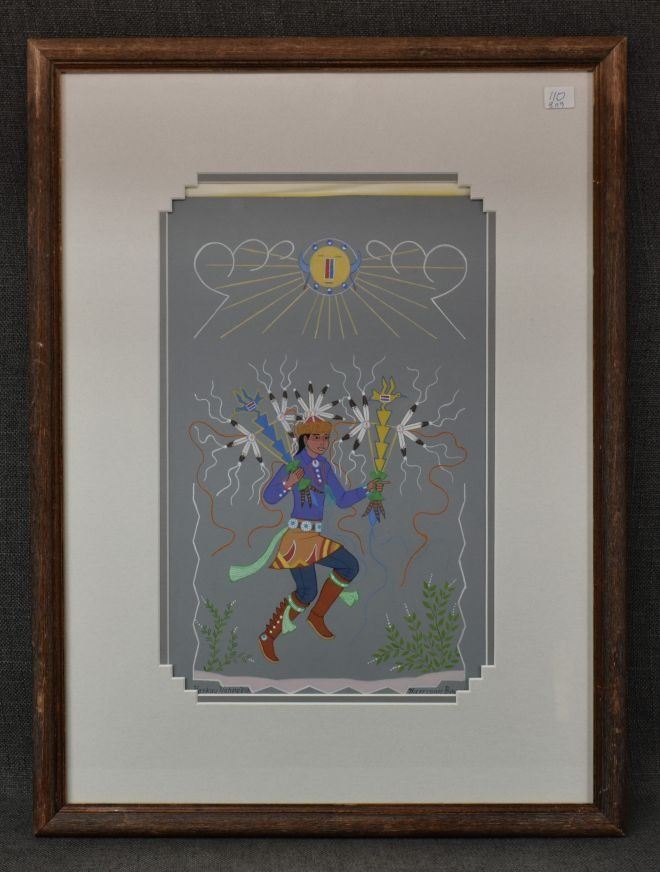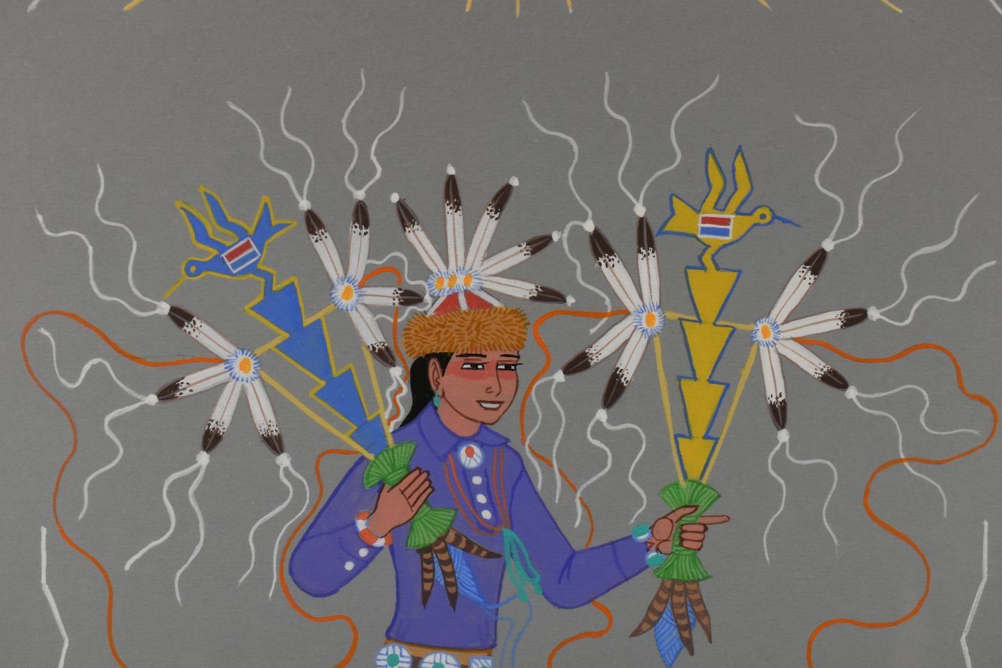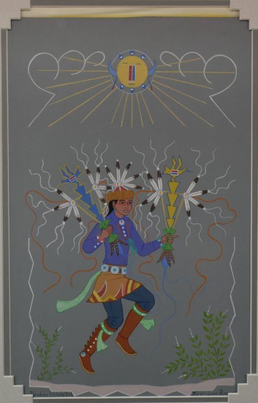 1970's Navajo, original hand painted depicting Navajo feather dance by Harrison Begay 15" x 9.5" matted and framed to 23.5" x 17.5"