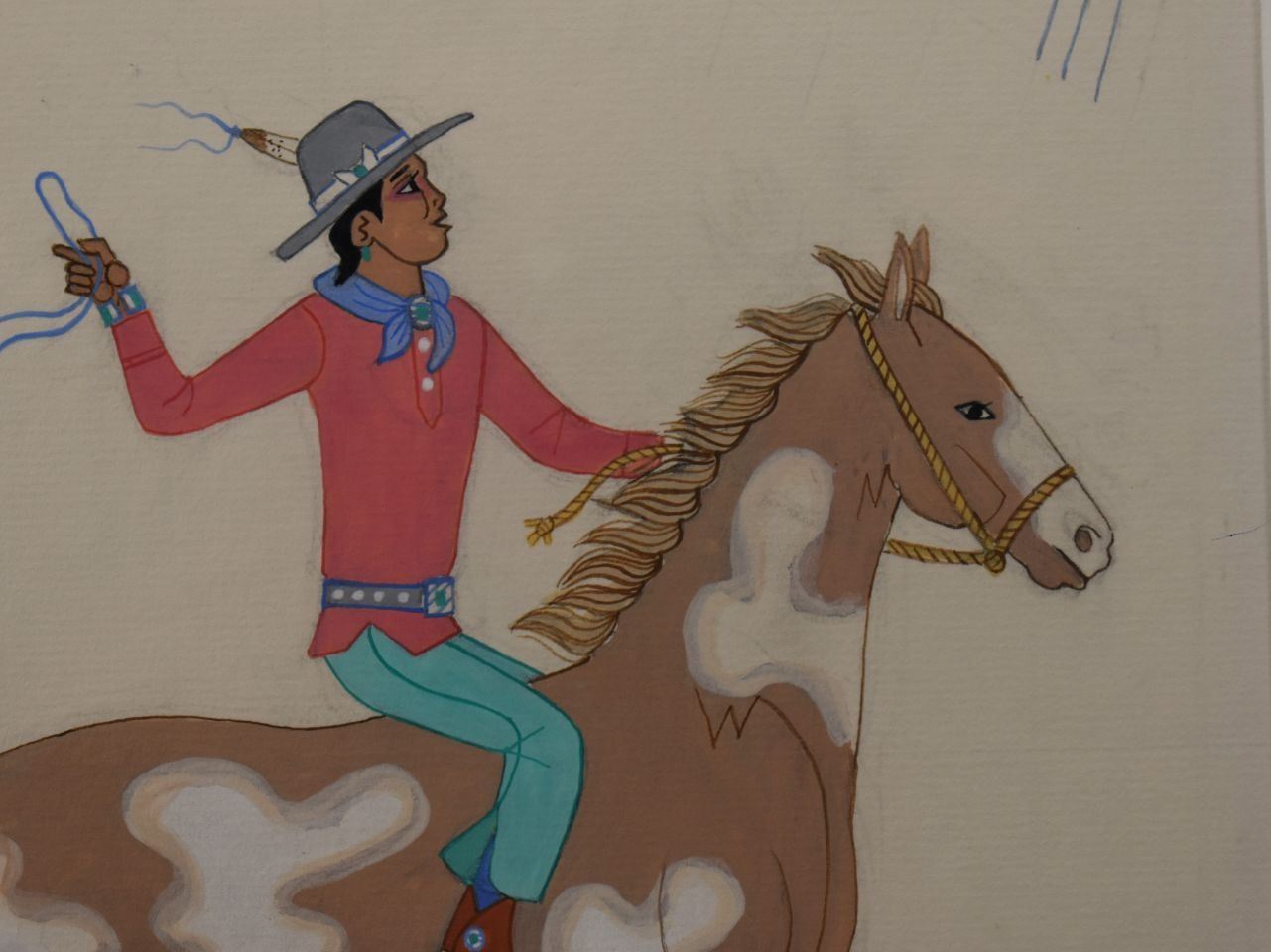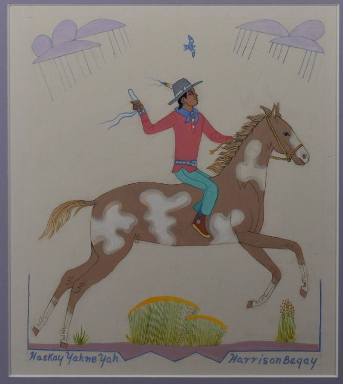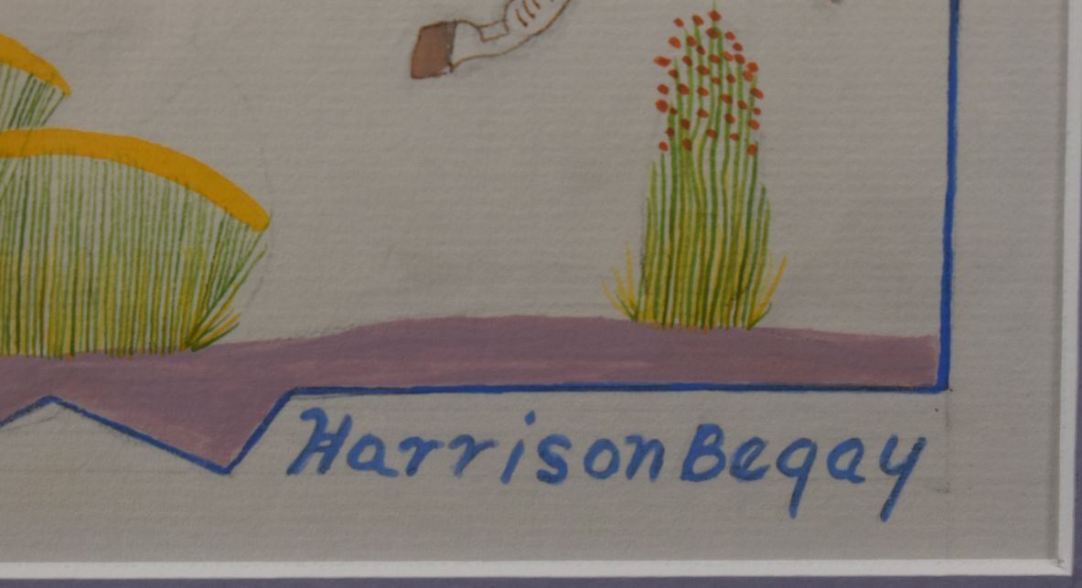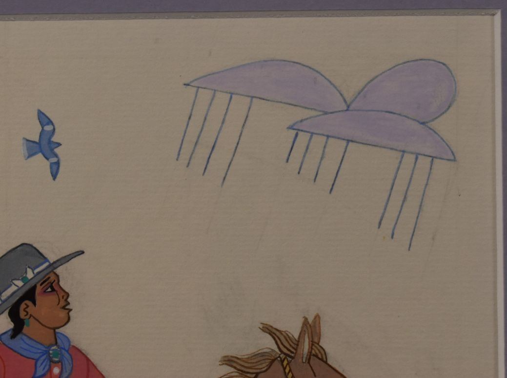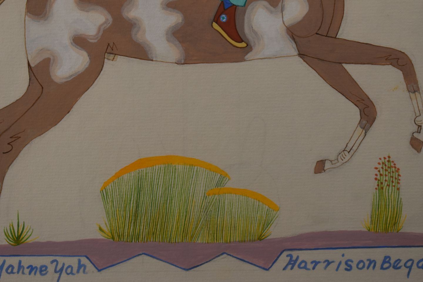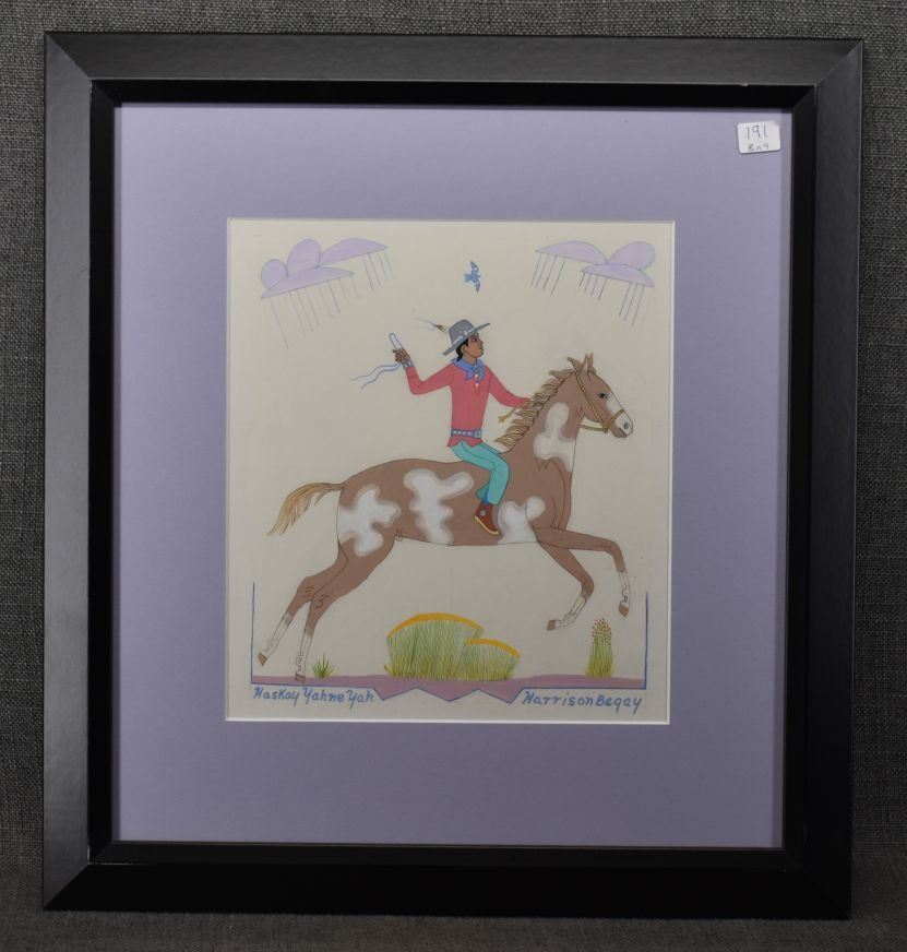 2000's Navajo. Original on paper depicting native boy on horse. Signed Harrison Begay. 11'' x 9'' frame size 19'' x 17'' and photo of artist holding the painting