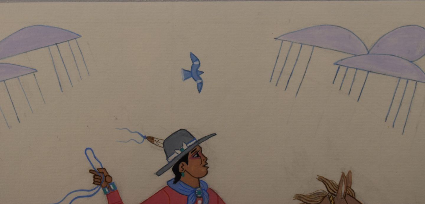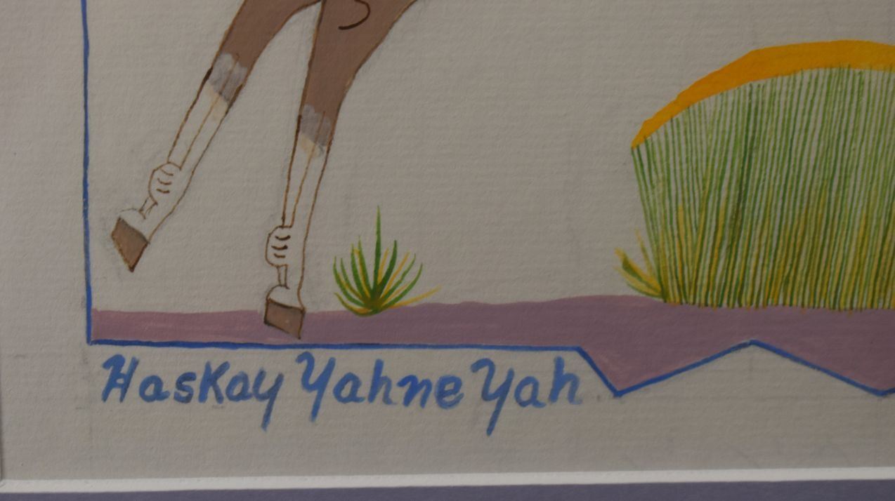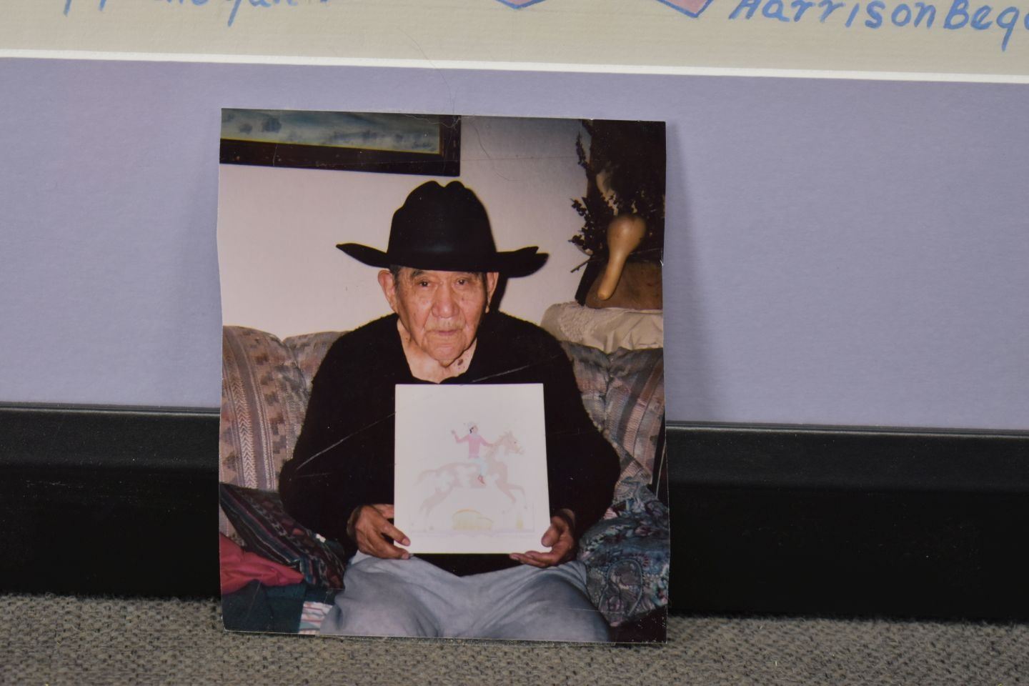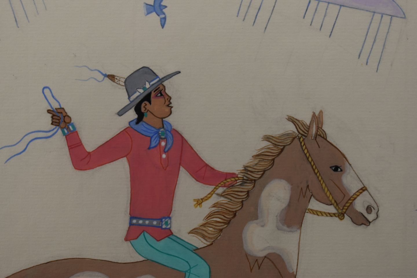 2000's Navajo. Original on paper depicting native boy on horse. Signed Harrison Begay. 11'' x 9'' frame size 19'' x 17'' and photo of artist holding the painting