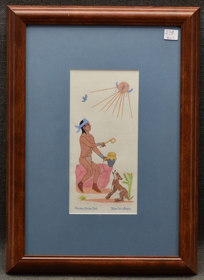 Damage that is visible in photos we do not note in description. Unless noted NO damage. All items have some amount of acceptable wear, scratches, nicks, missing stitches, etc. for their age. Measurements on paintings, pictures and prints are image size, paintings, pictures and prints that are in frames have not been examined outside the frame. Painting glass is not insurable Alvord/Munn auction is not responsible for brakeage of glass or frames during shipping. Bracelets measurements are width, inside circumference, opening. Weight on jewelry includes stones, leather from Concho belts and bolos removed when possible.