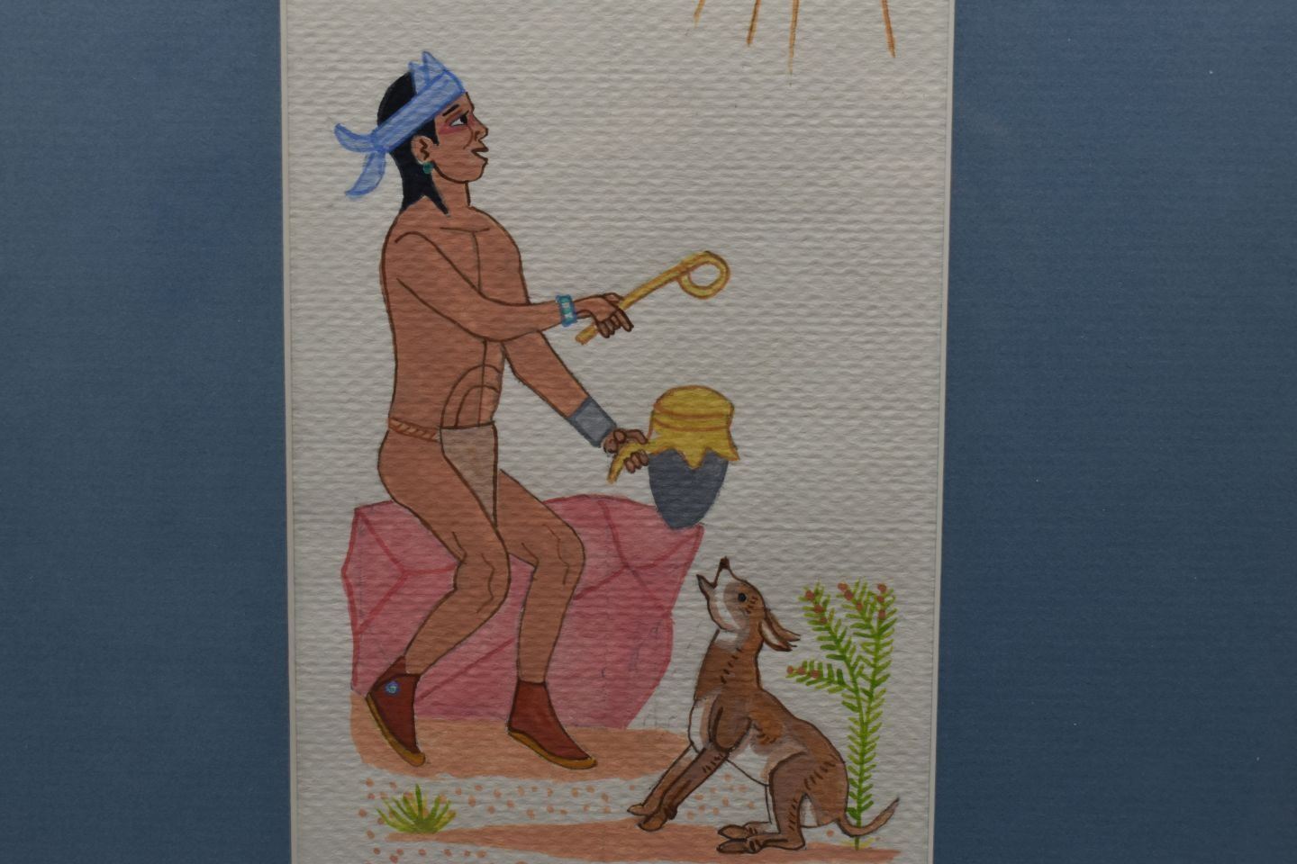 1980's Navajo, original hand painted depicting drummer boy with dog by Harrison Begay 9" x 4.25"