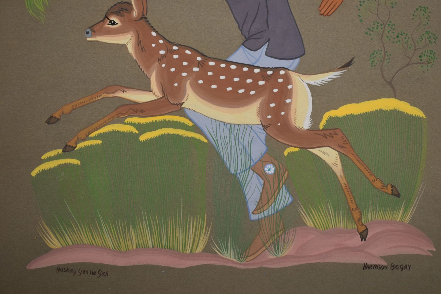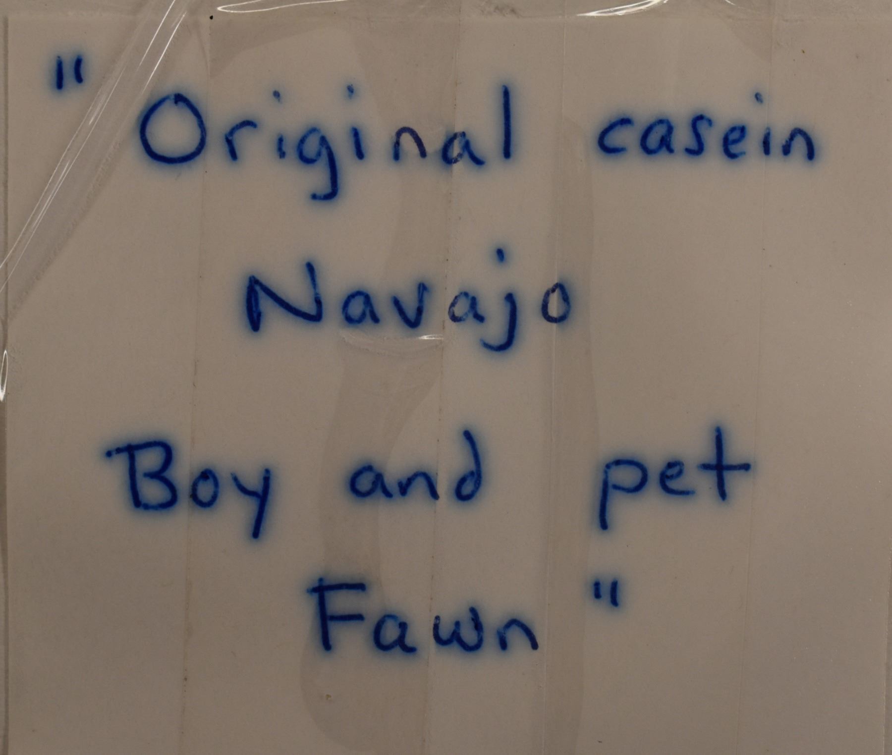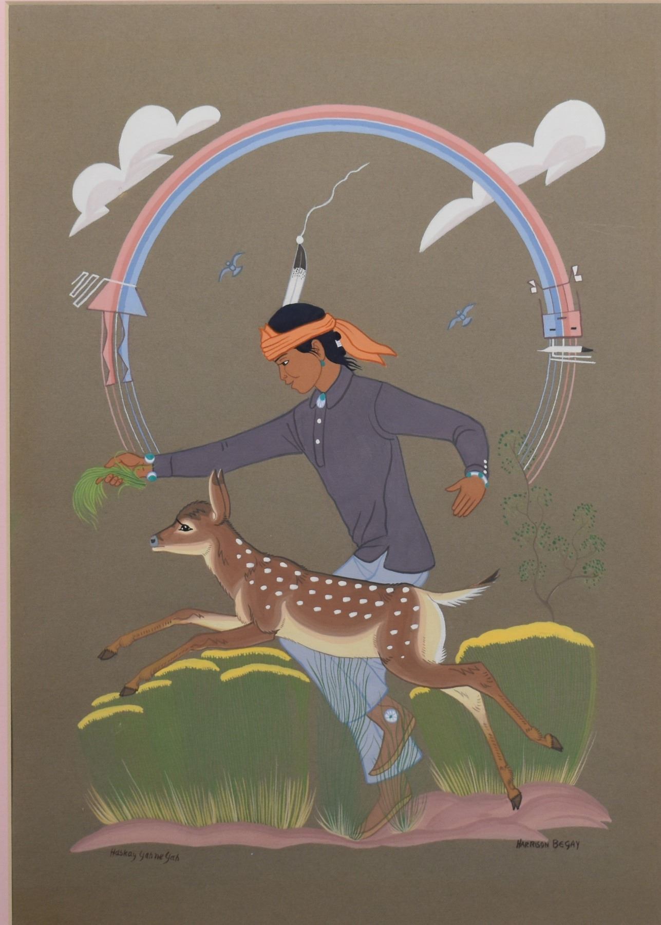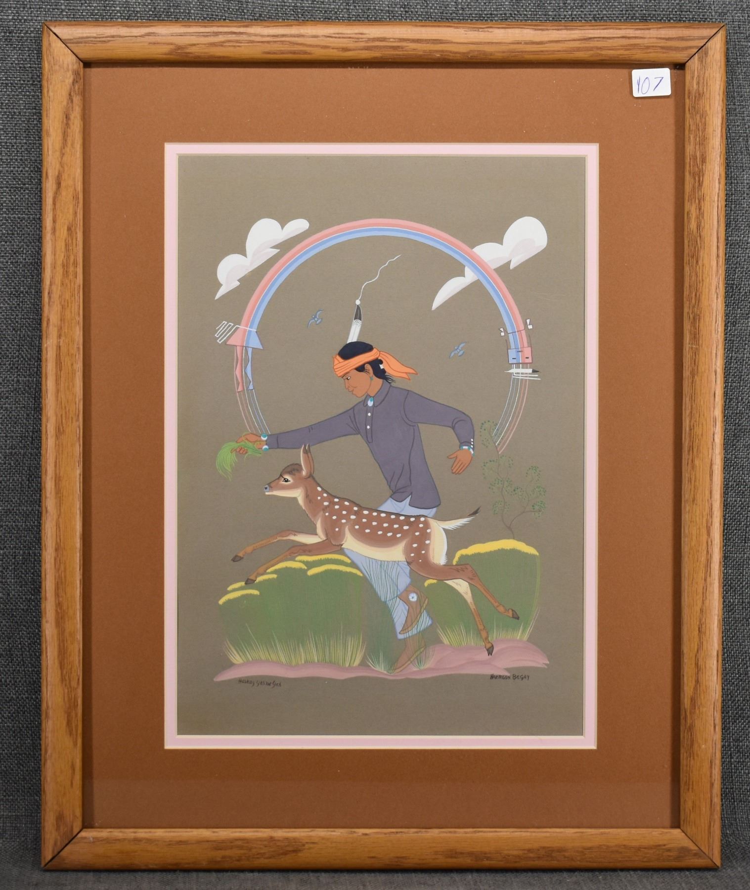 1960's/70's Navajo original hand painted on paper depicting boy playing with deer. Signed Harrison Begay. image 13" x 9.5" framed to 19.5" x 15.5"