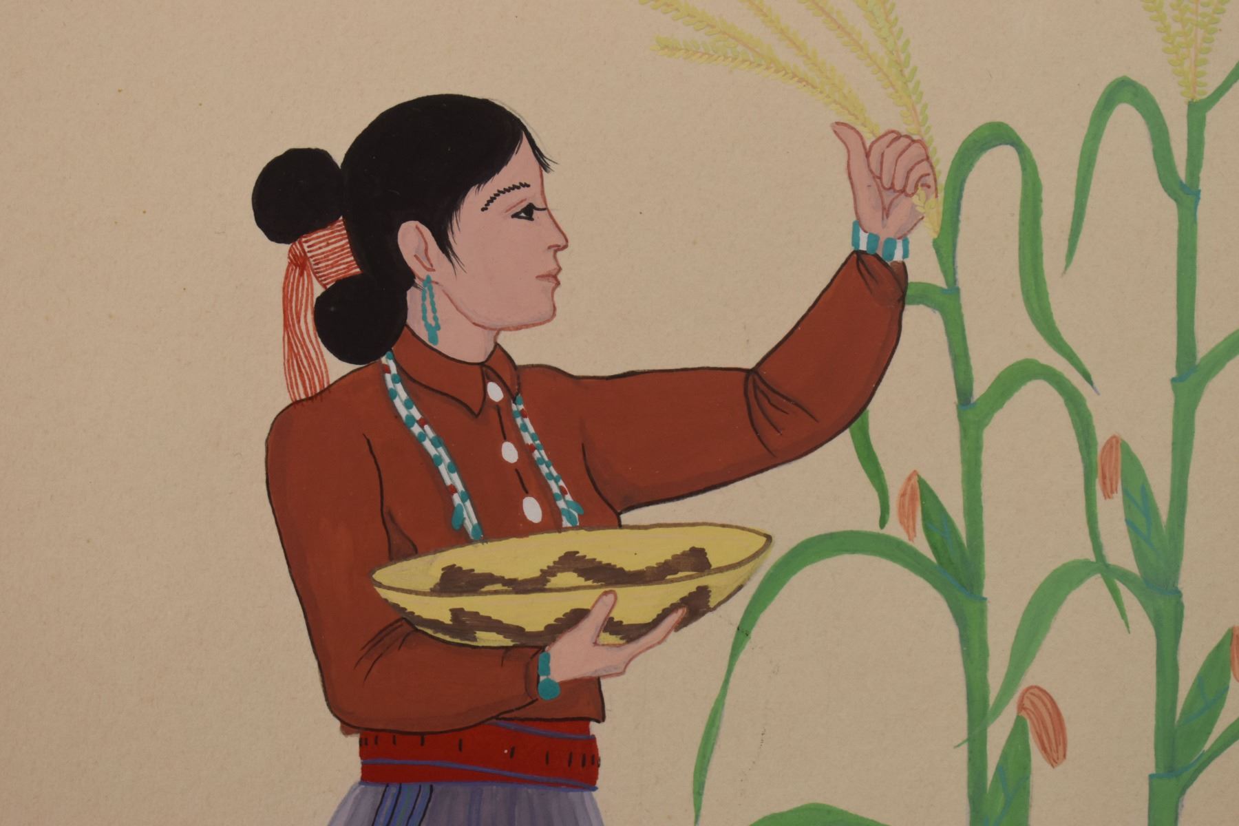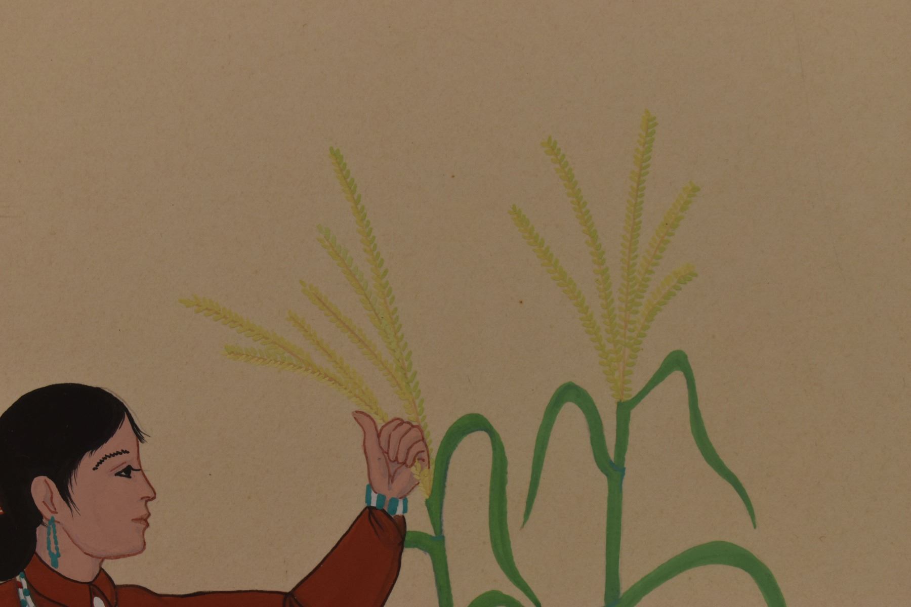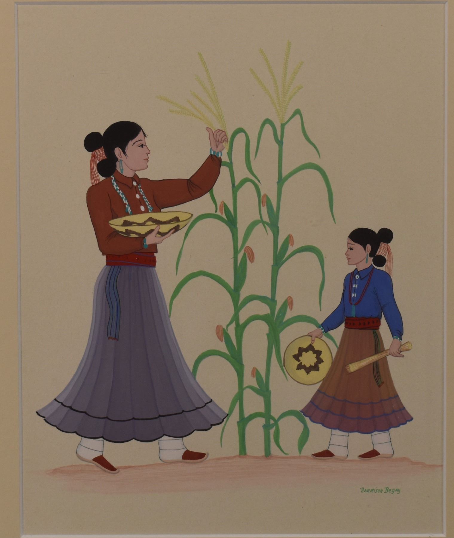 1970's Navajo, original hand painted watercolor on paper of Navajo woman and daughter with cornstalks by Harrison Begay. 10.25" x 8.25" framed to 18.25" x 15.25"