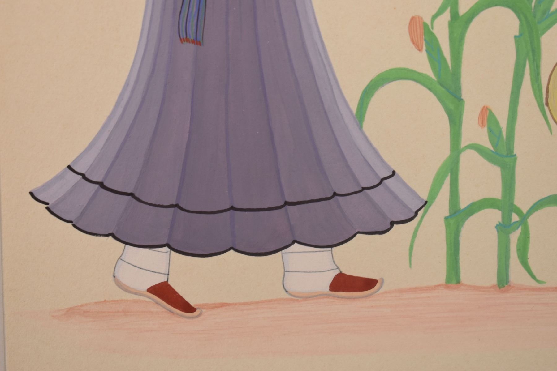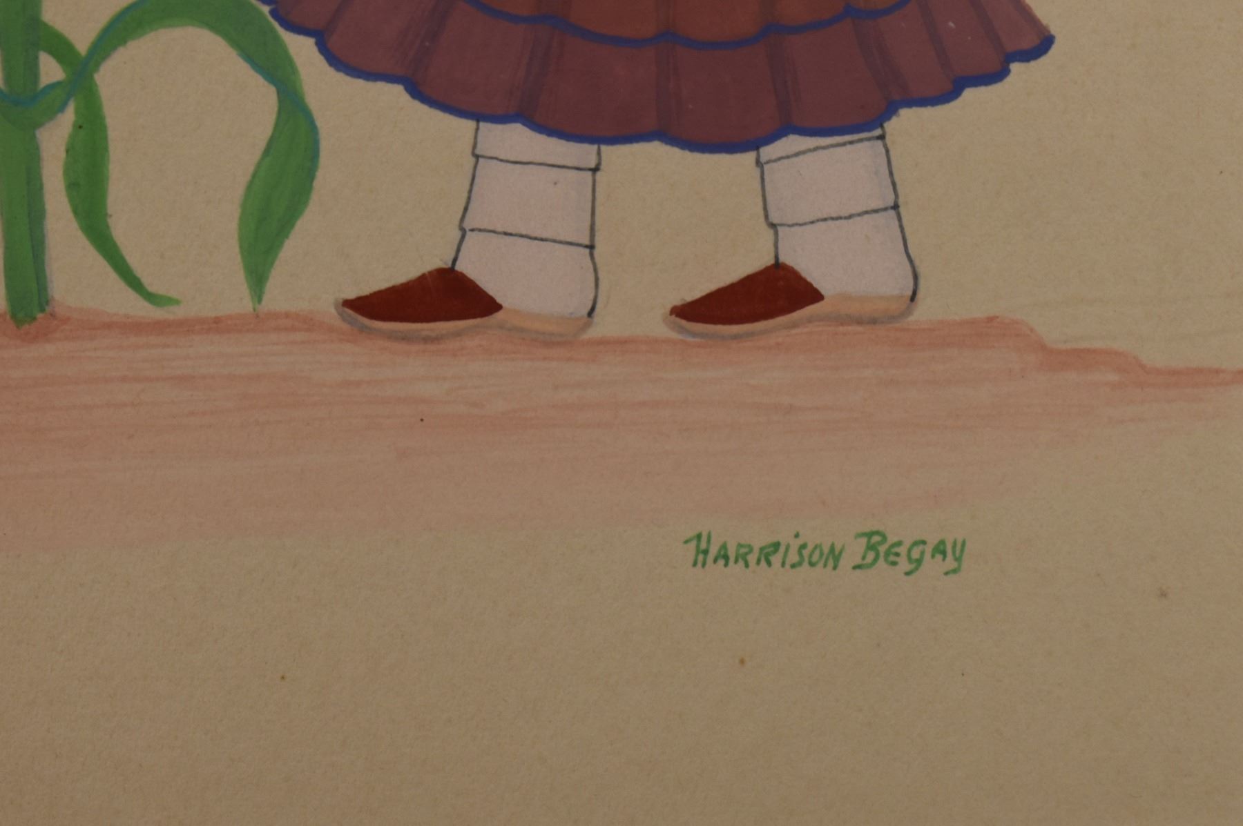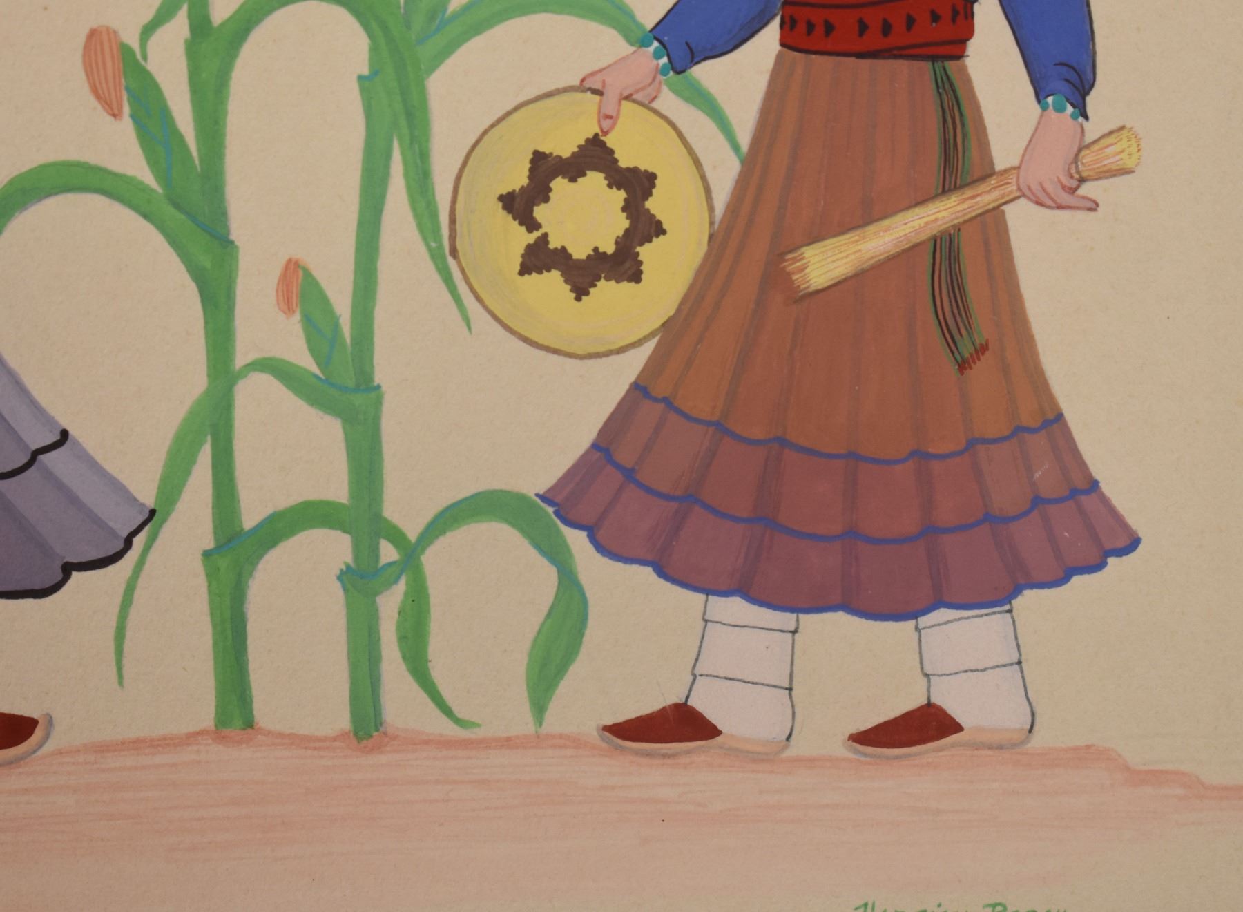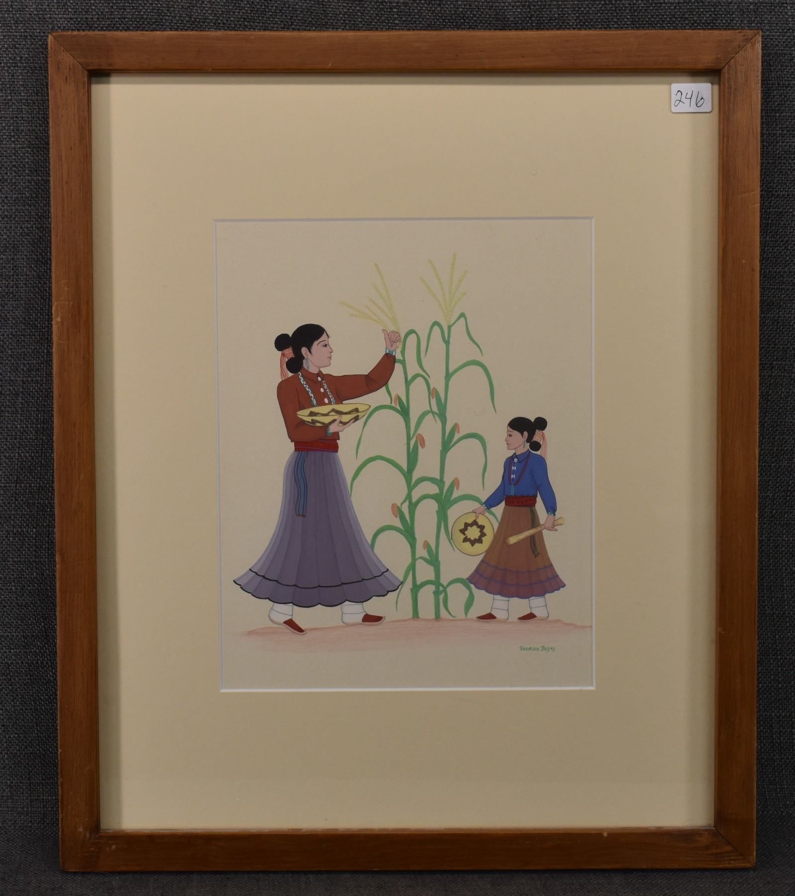 1970's Navajo, original hand painted watercolor on paper of Navajo woman and daughter with cornstalks by Harrison Begay. 10.25" x 8.25" framed to 18.25" x 15.25"