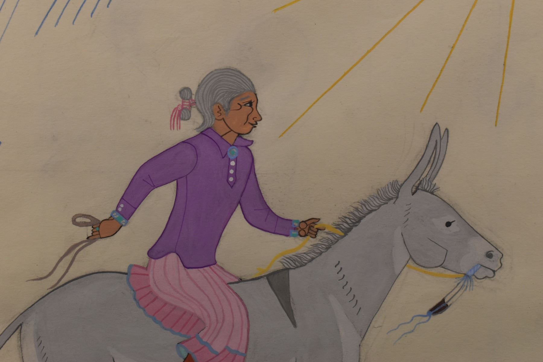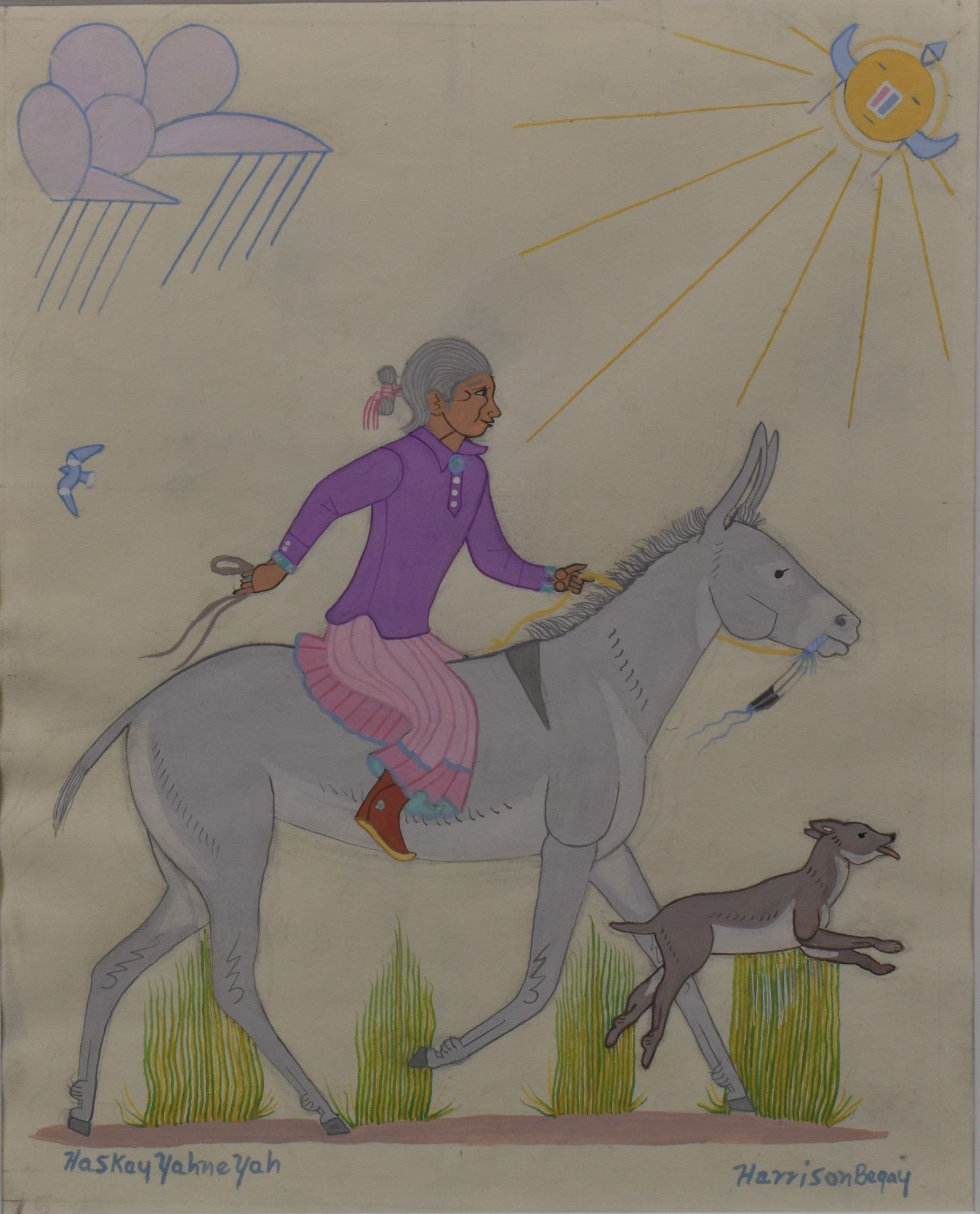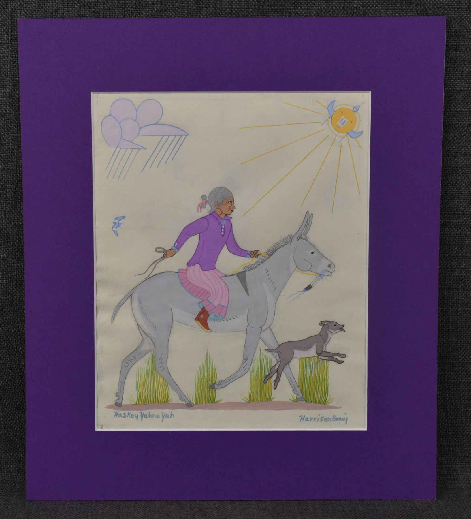 1980-90's Navajo, original hand painted on paper depicting Navajo Lady on mule signed Harrison Begay 10.5" x 8.25" matted to 15" x 13"