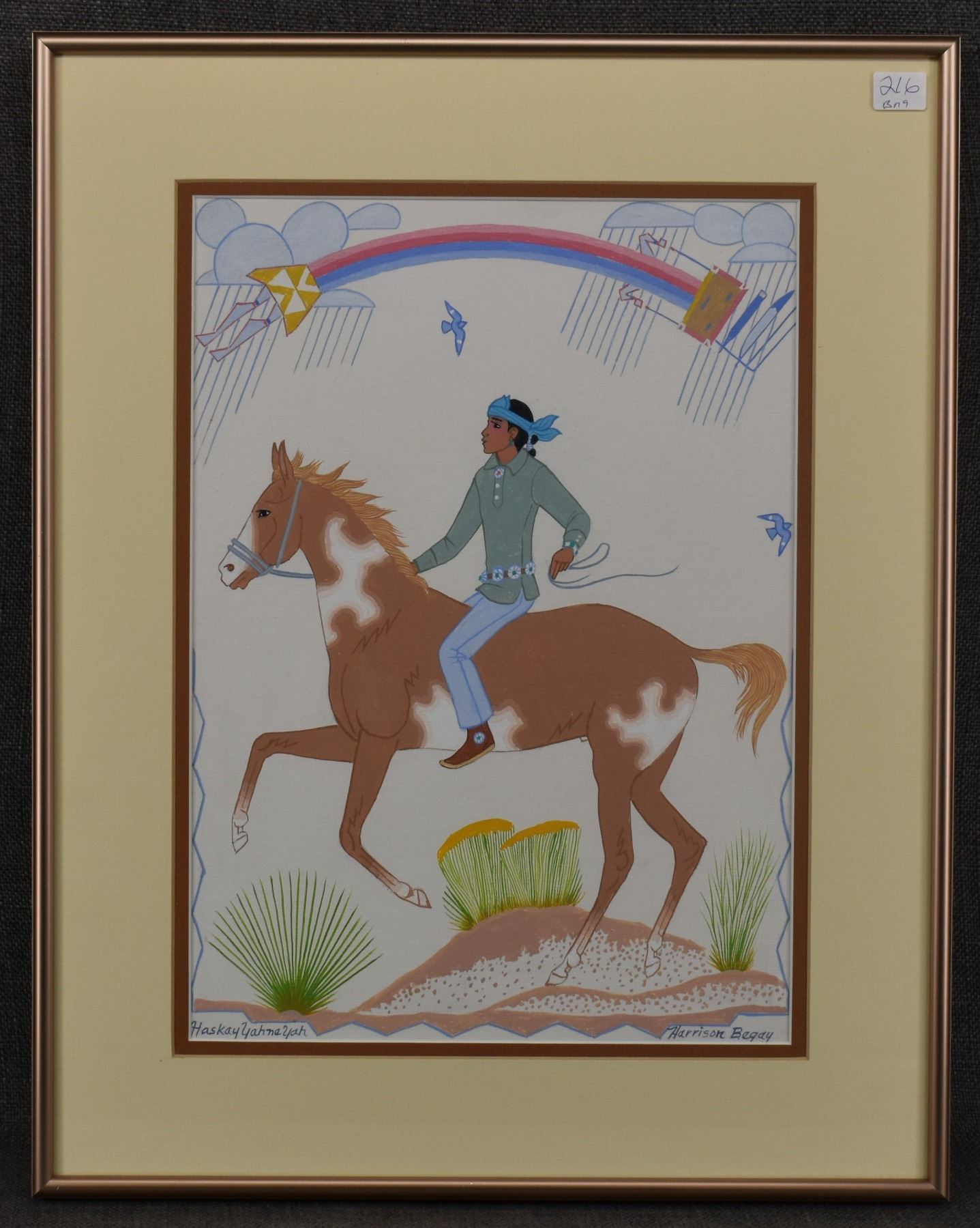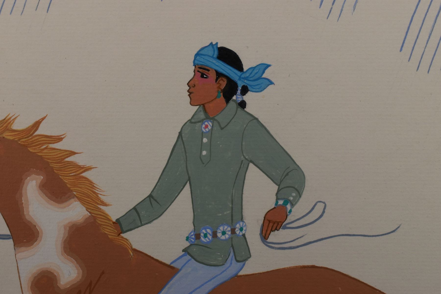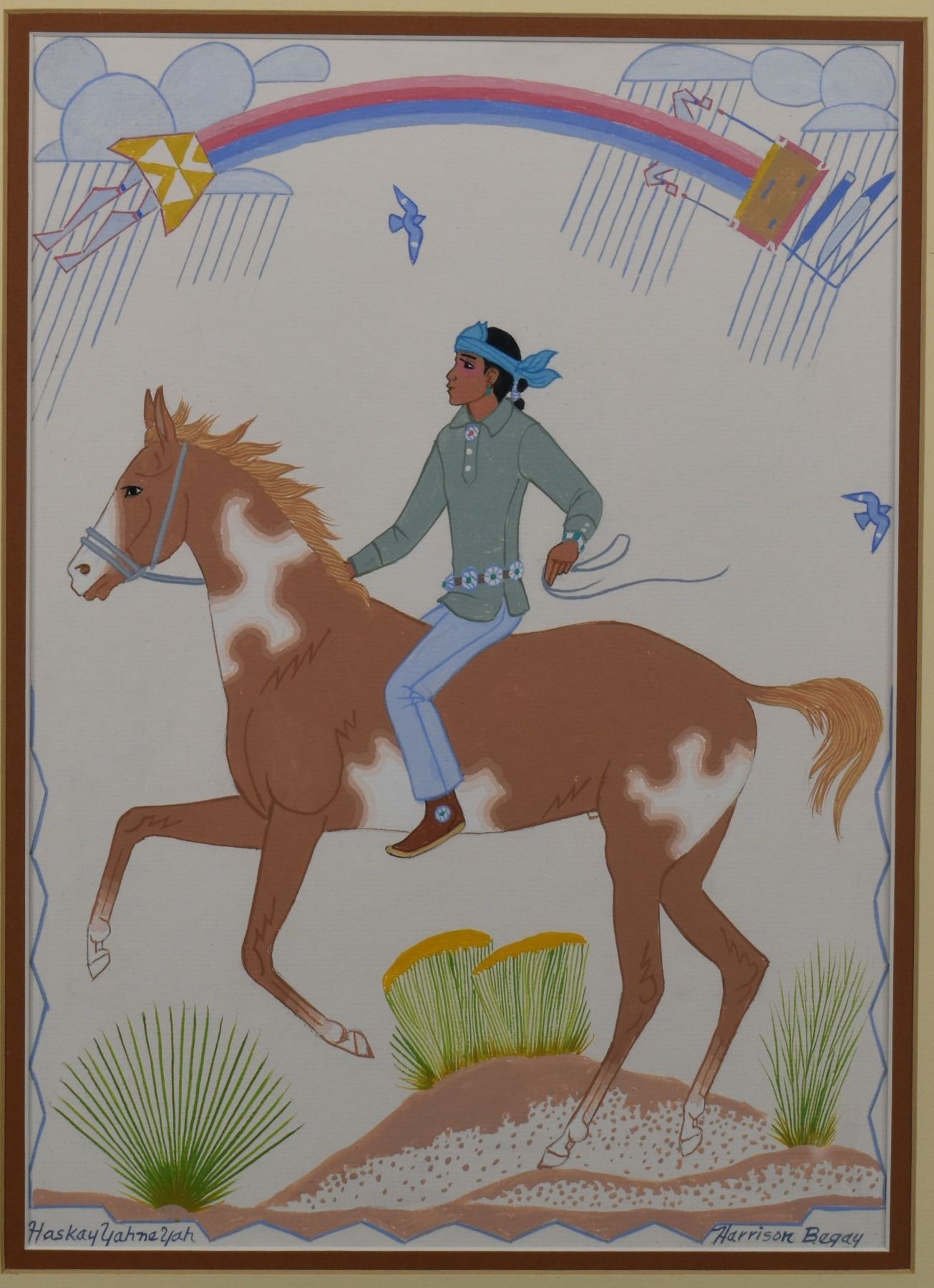 1970's Navajo. Original on paper depicting native boy on horse back. Signed Harrison Begay, 14'' x 10'' frame size 19'' x 15''