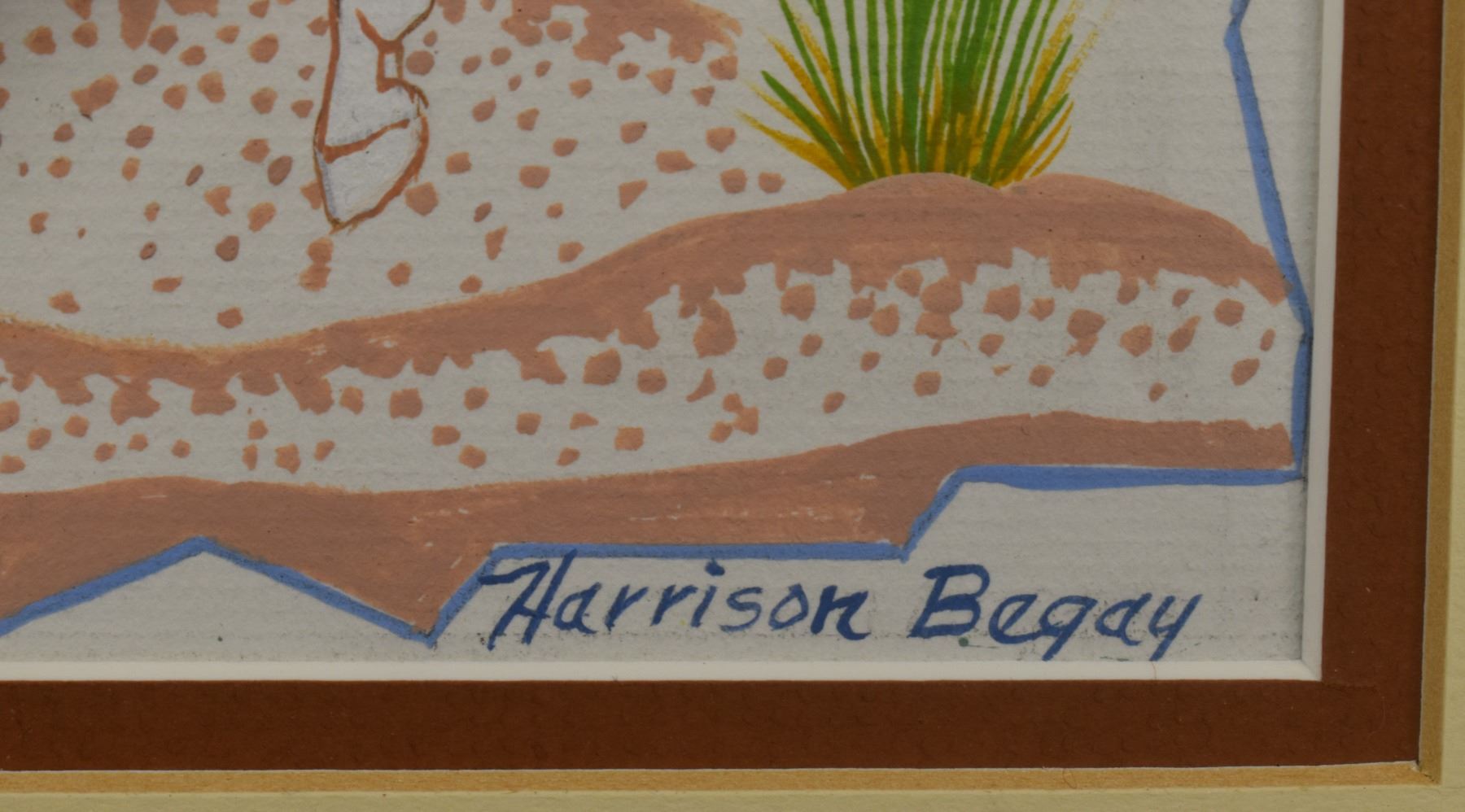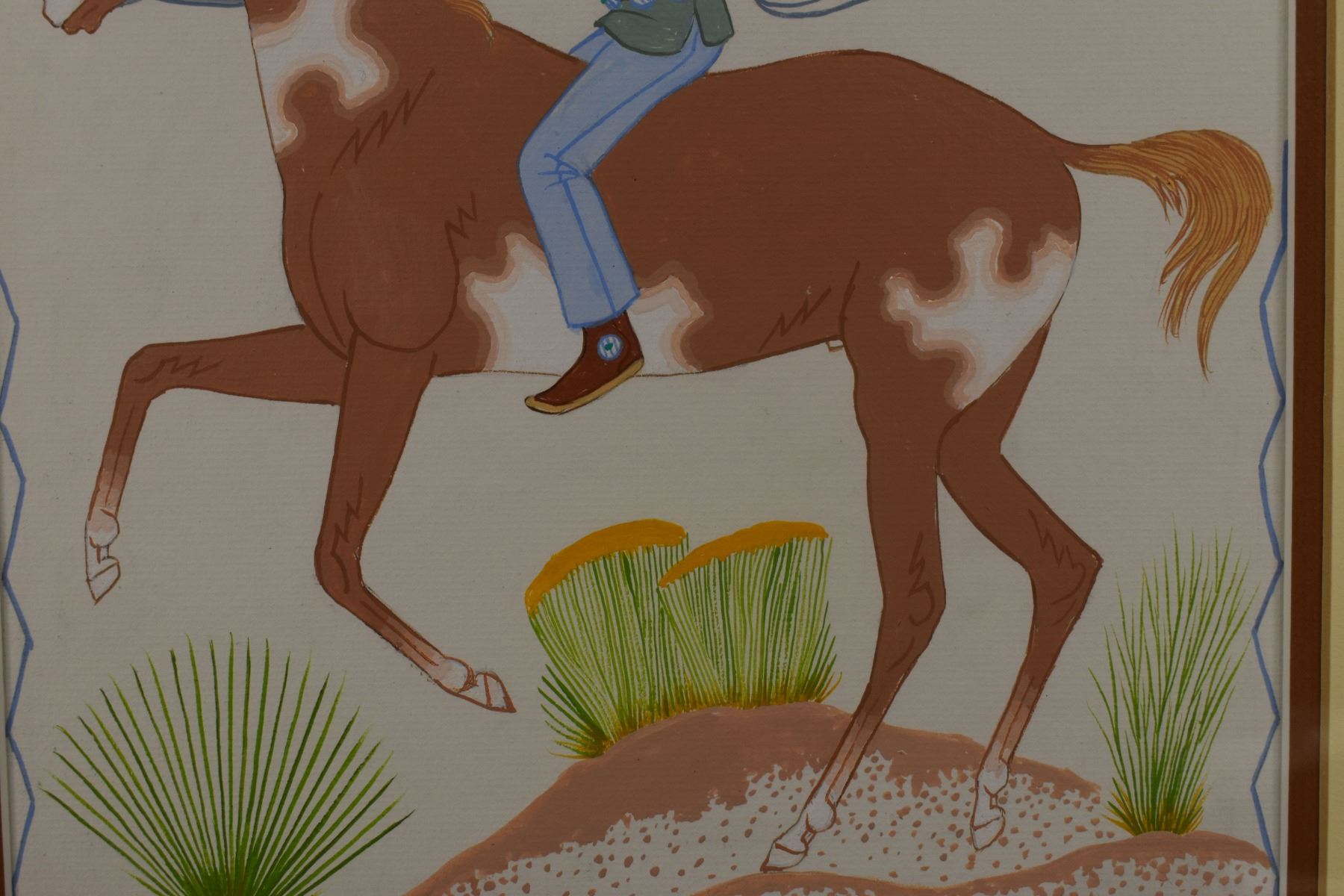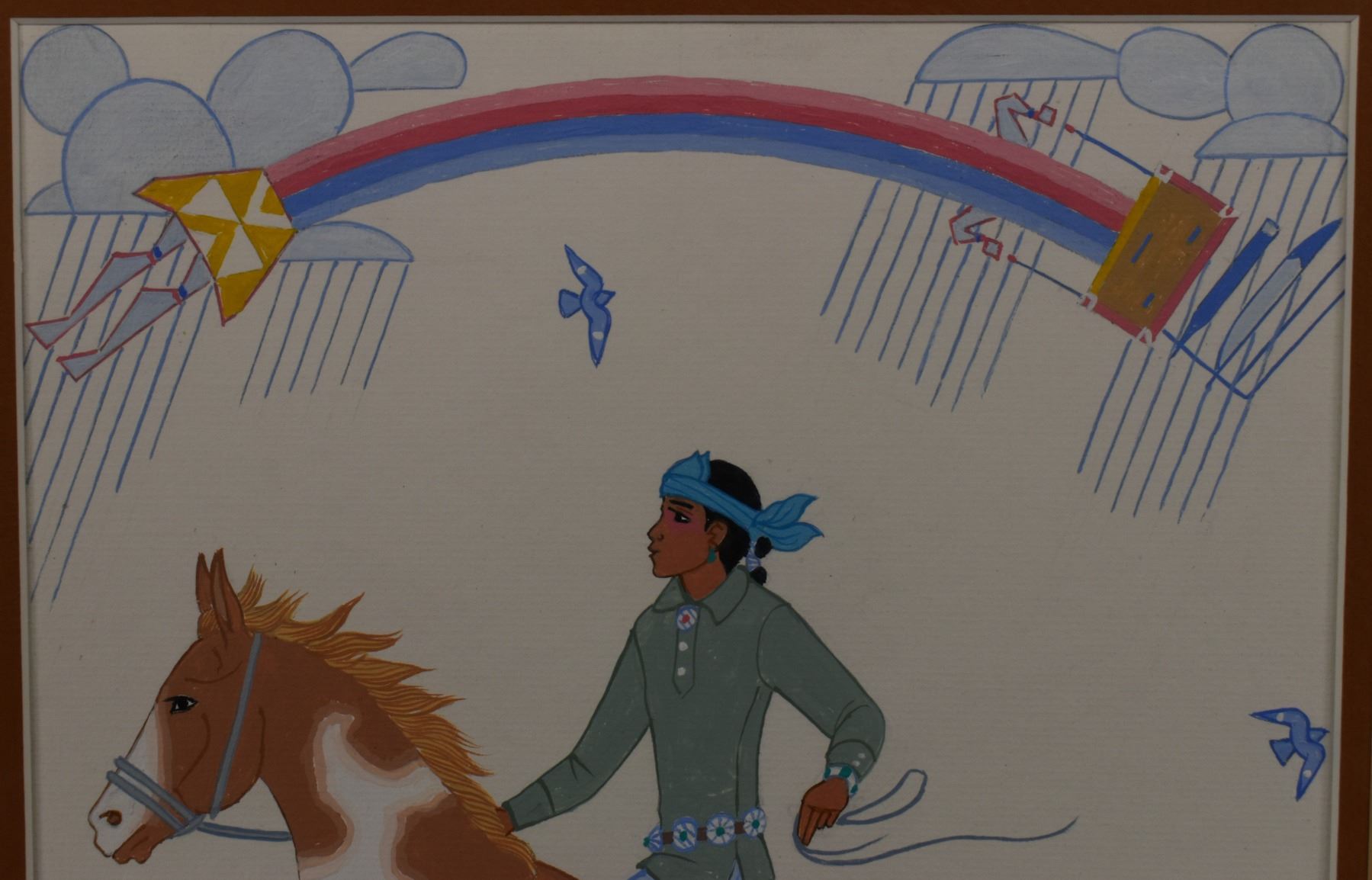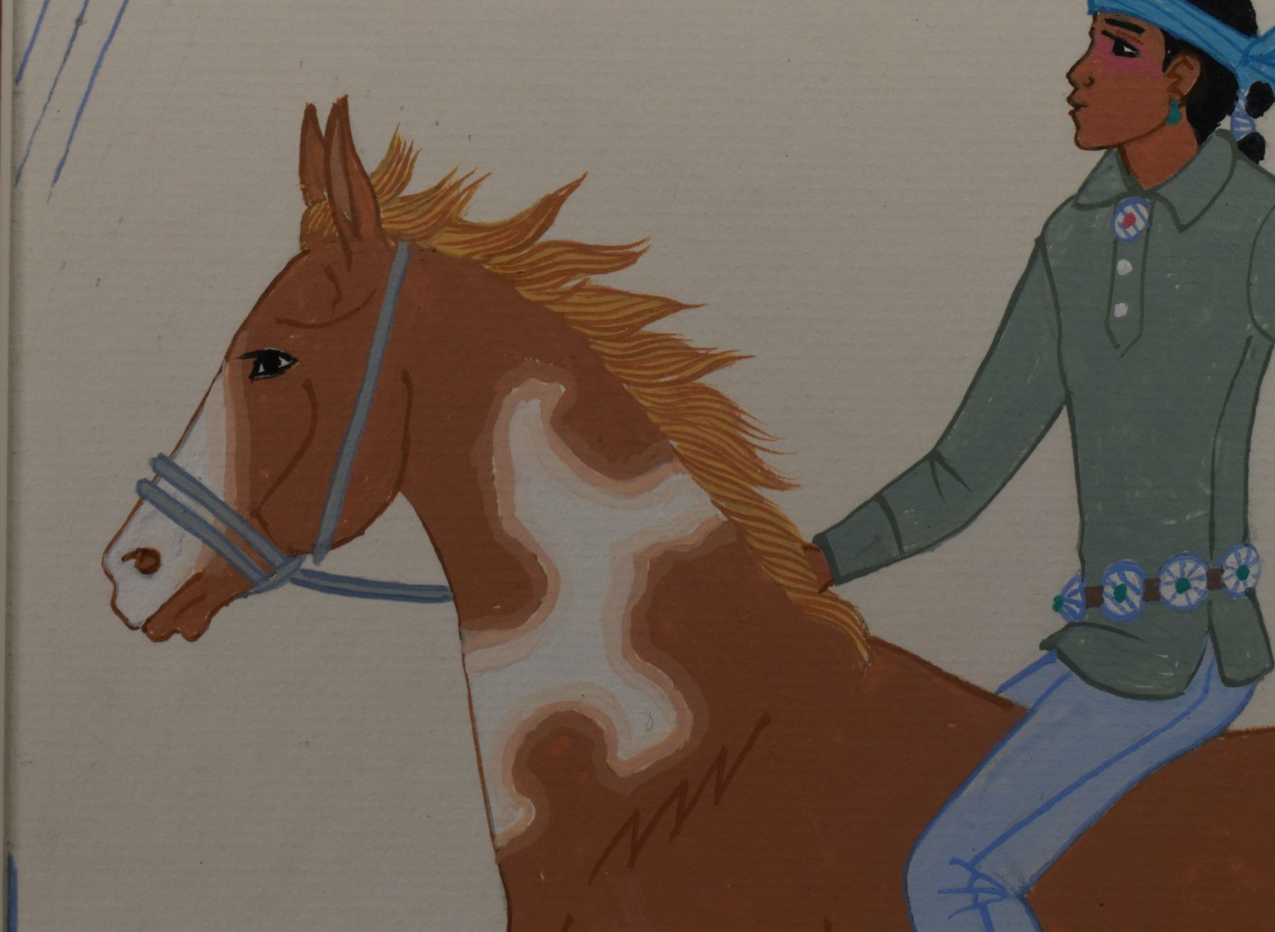 1970's Navajo. Original on paper depicting native boy on horse back. Signed Harrison Begay, 14'' x 10'' frame size 19'' x 15''