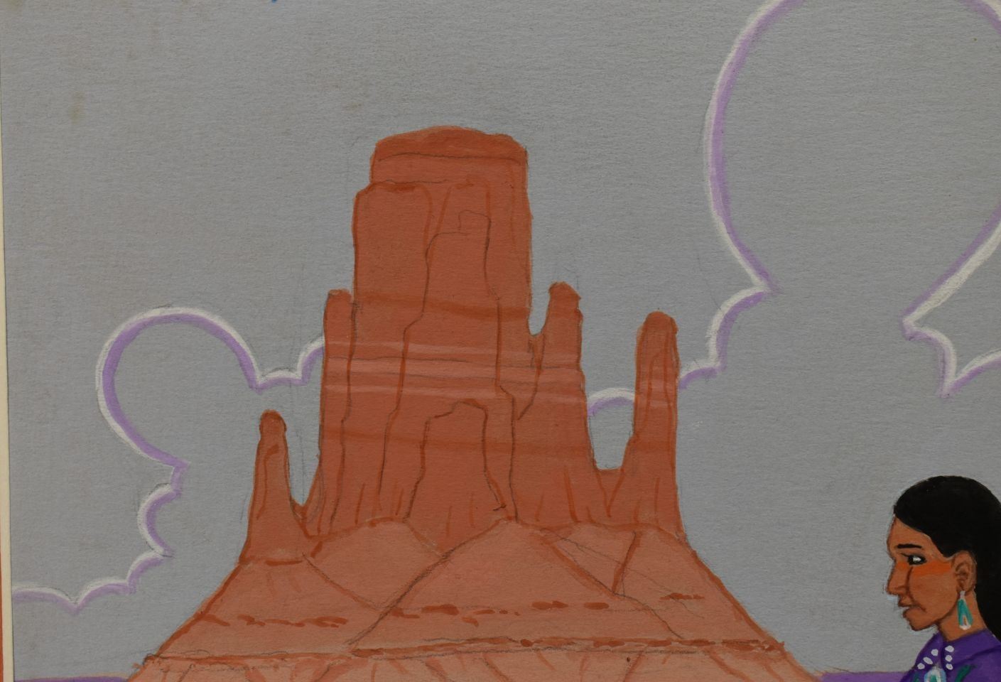1970's Navajo, original hand painted on paper depicting Navajo woman braiding girls hair with animals 13.25" x 15.5" matted to 17.5" x 19.5"