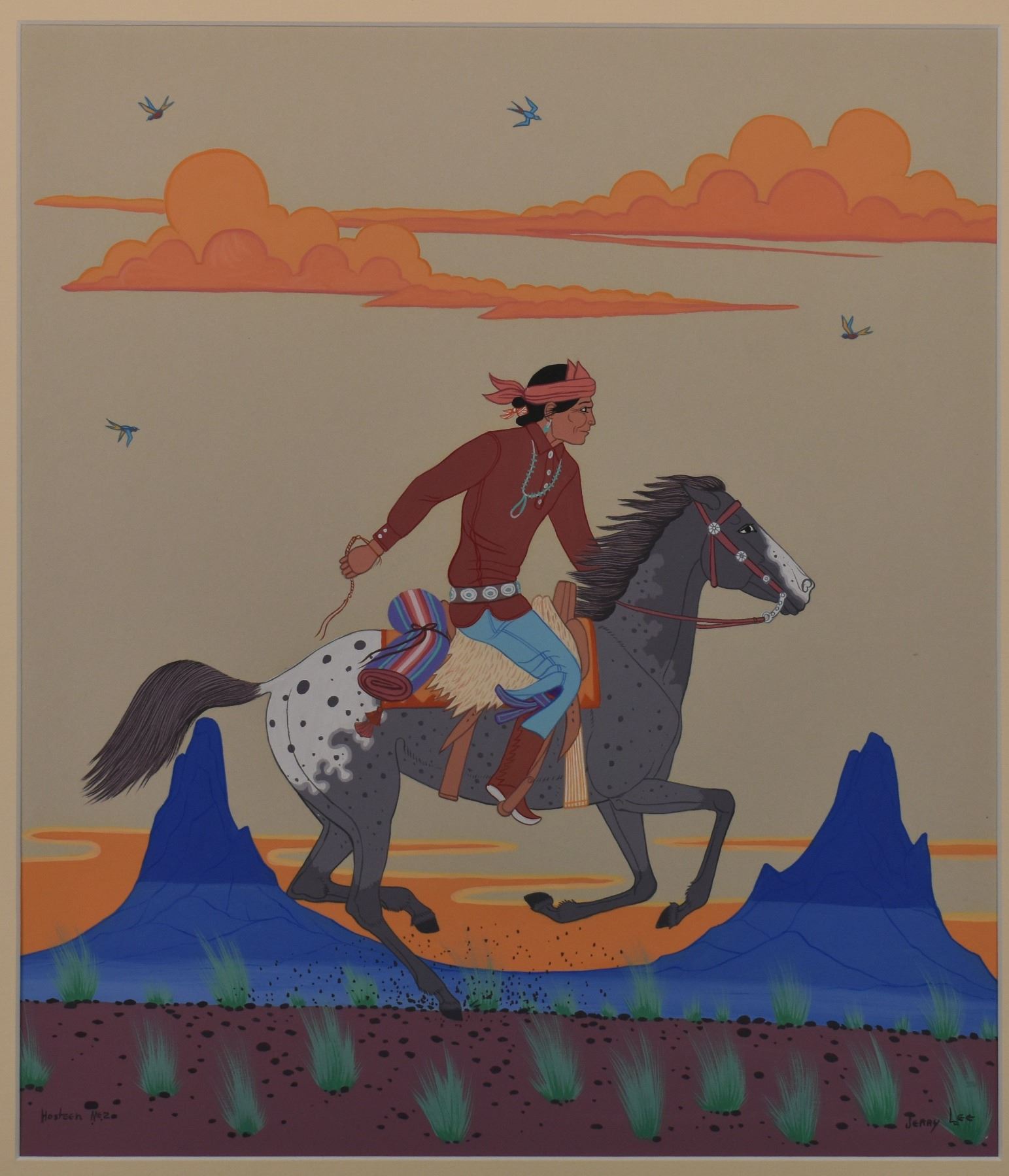 1970-80's Navajo, original on paper, hand painted titled "Goinging to the squaw dance" by Jerry Lee "Hosteen Nez" 18" x 15" matted and framed to 22" x 20"