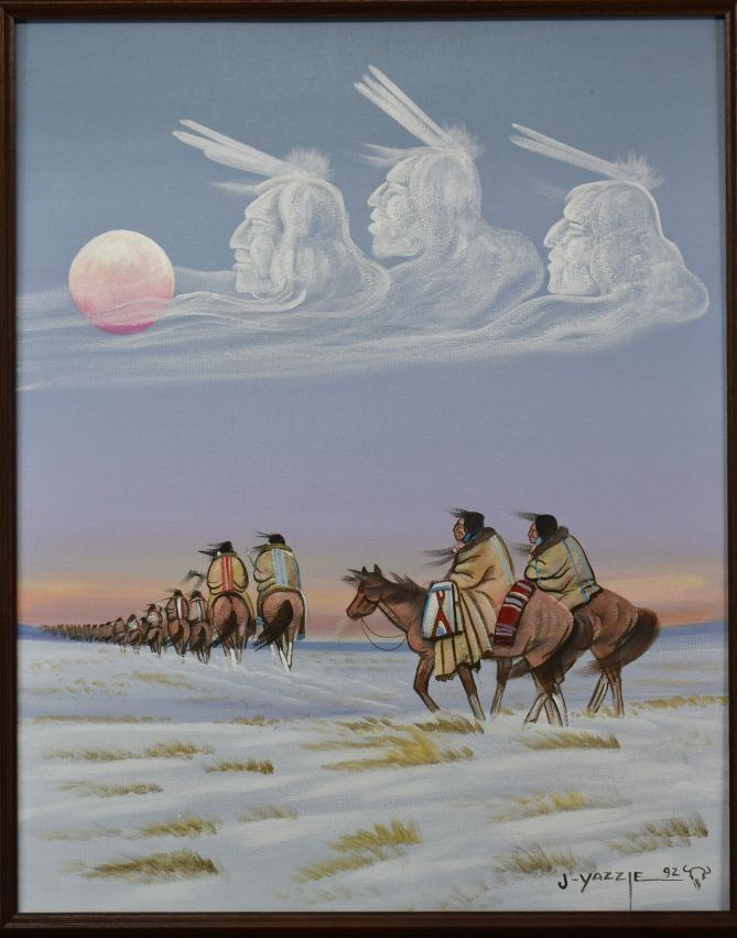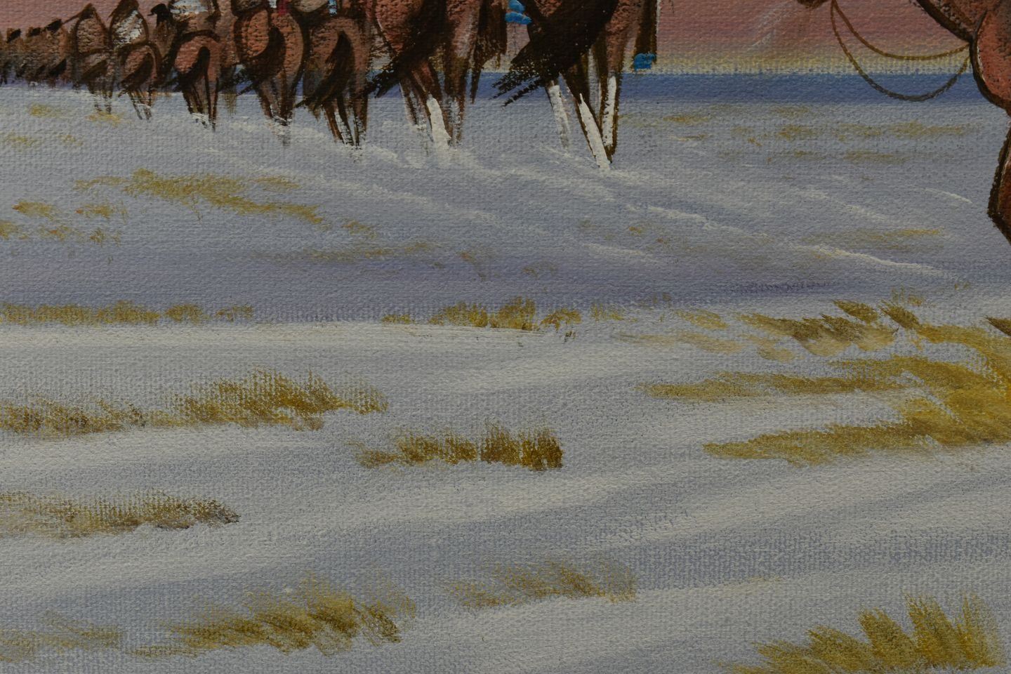 1992 Navajo, original hand painted oil on canvas depicting Natives on horseback in the snow by Johnny Yazzie 16" x 20" framed to 19.5" x 23.5"