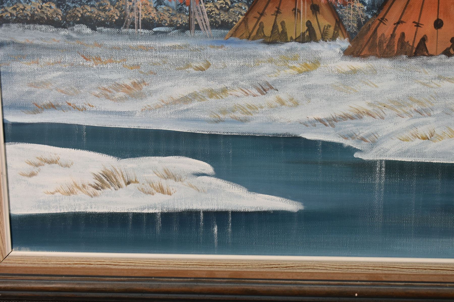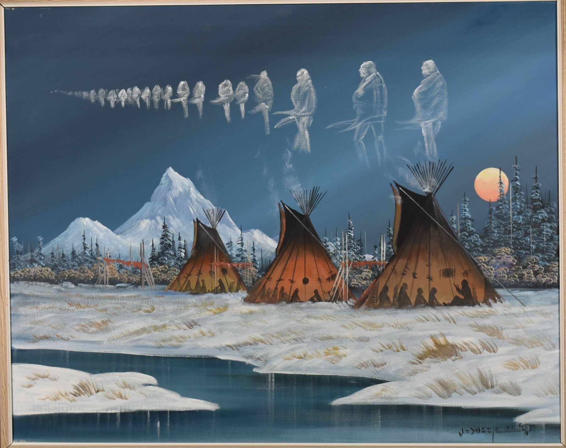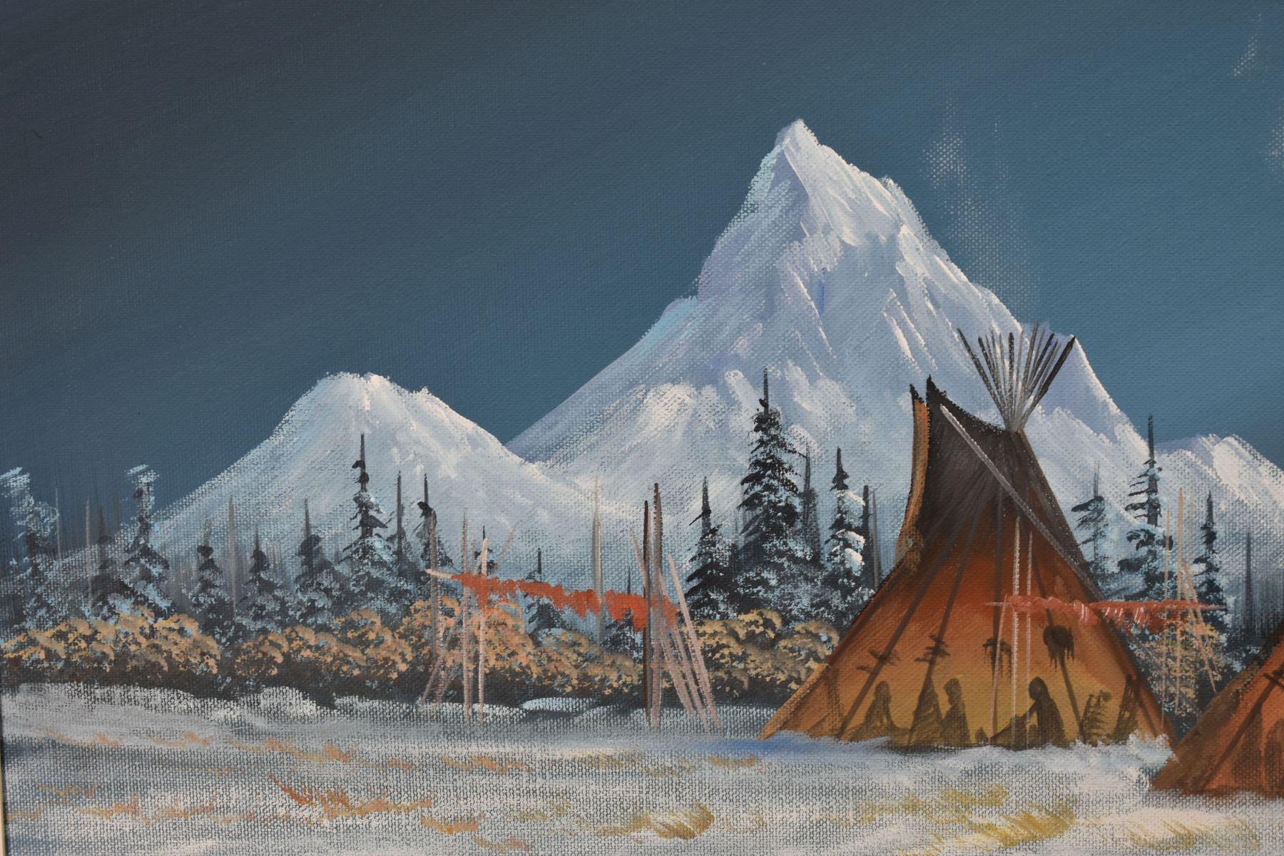1987 Navajo, original hand painted on canvas depicting Natives in Tipis by Johnny Yazzie, 23.5" x 29.5" framed to 27.75" x 33.75"