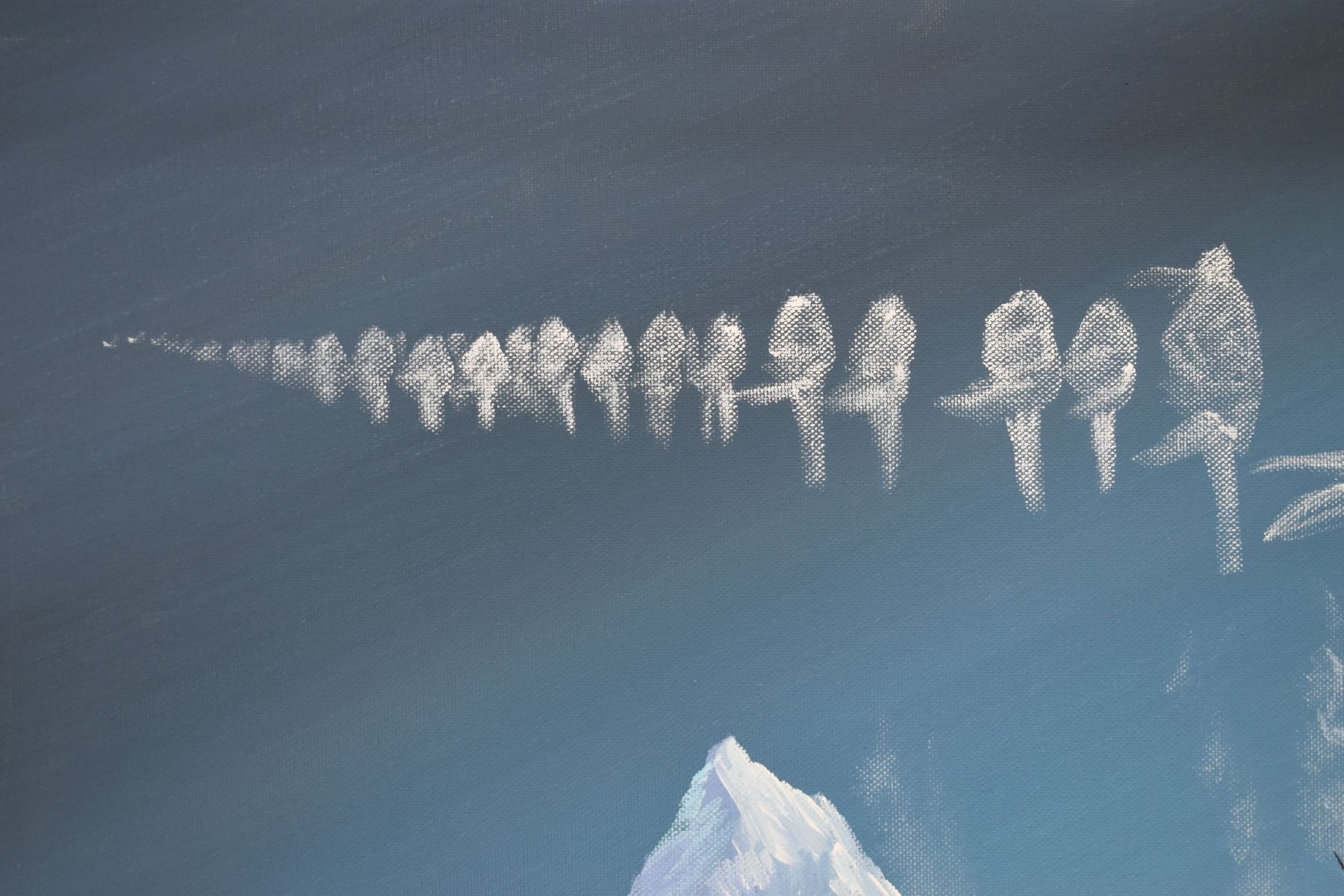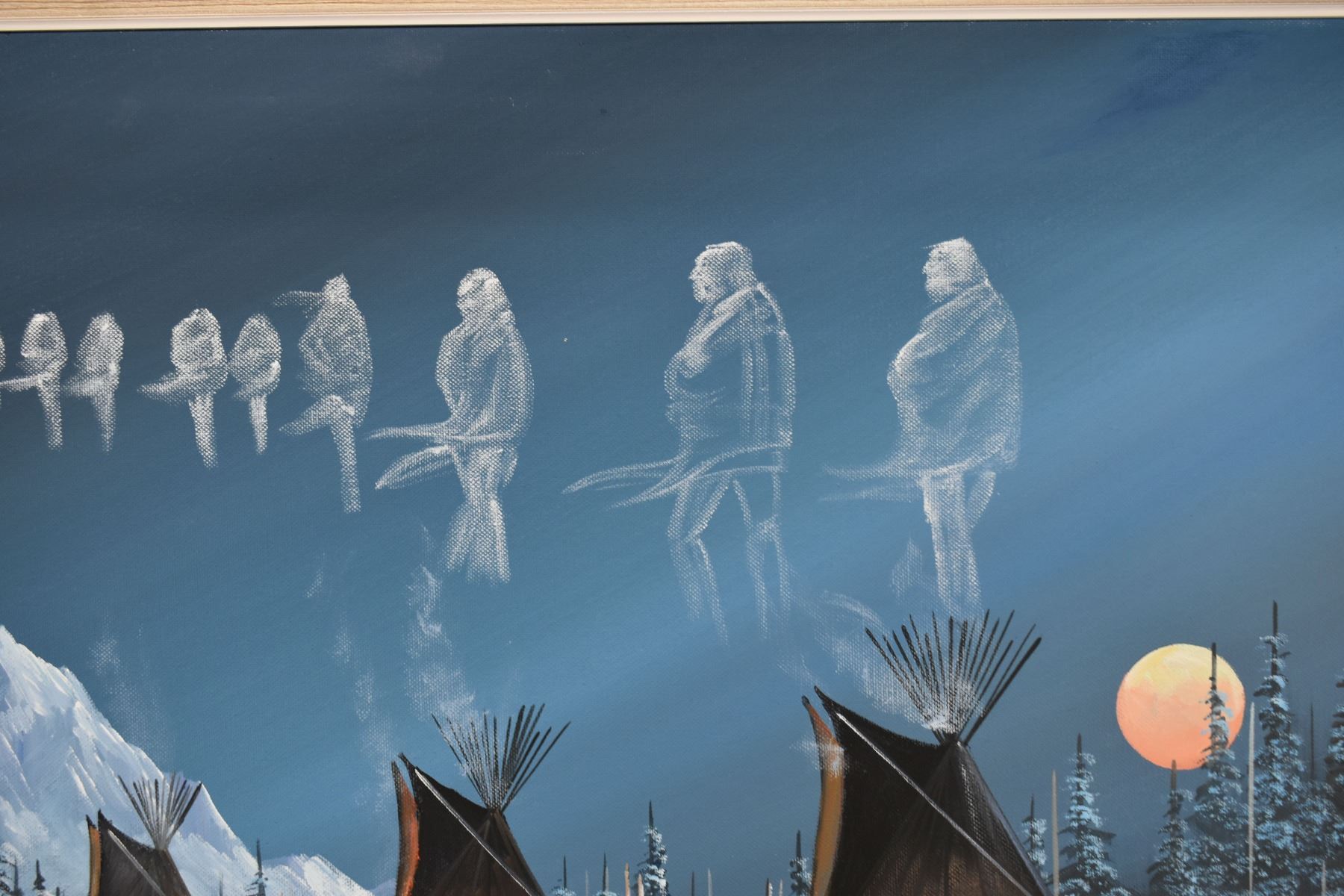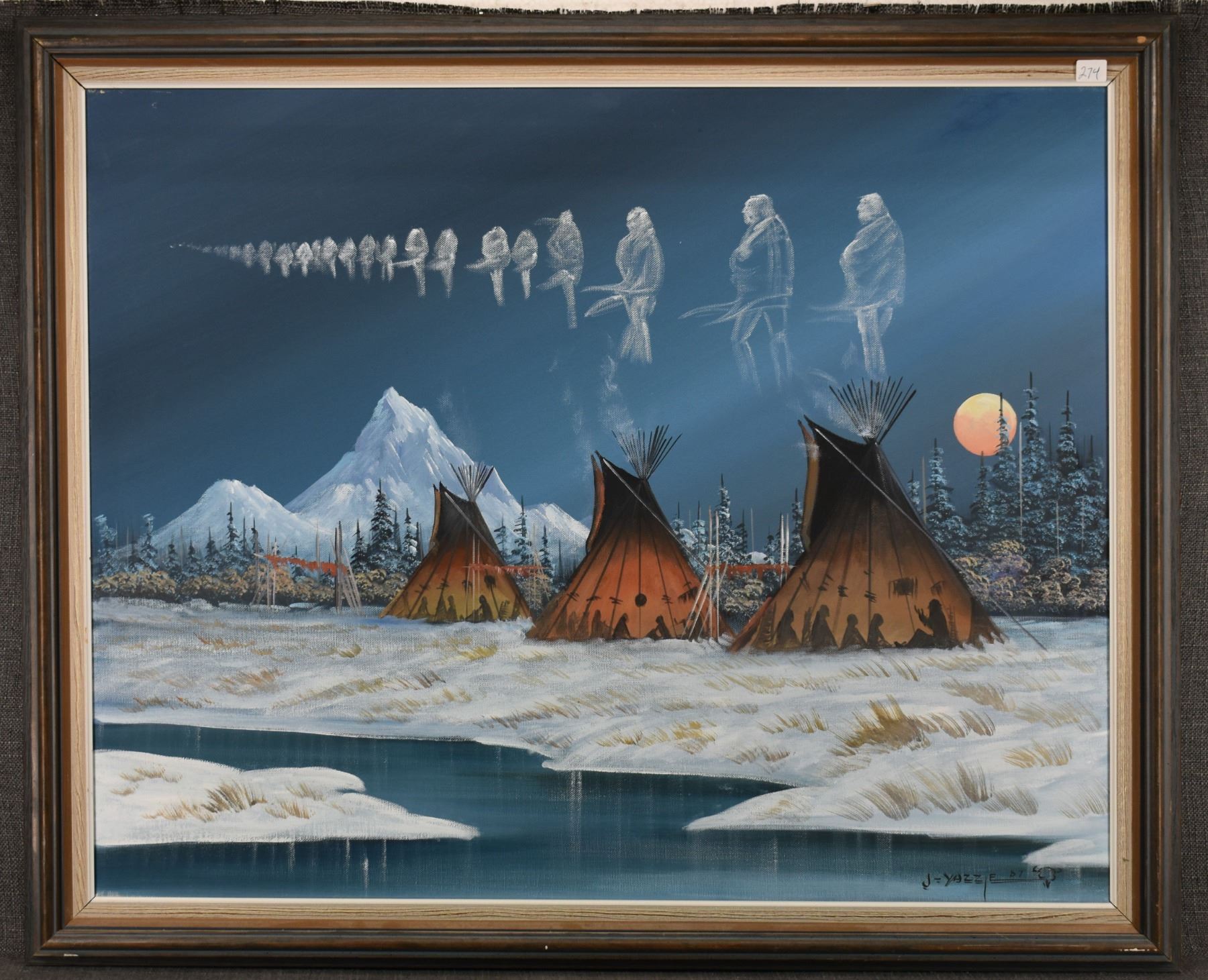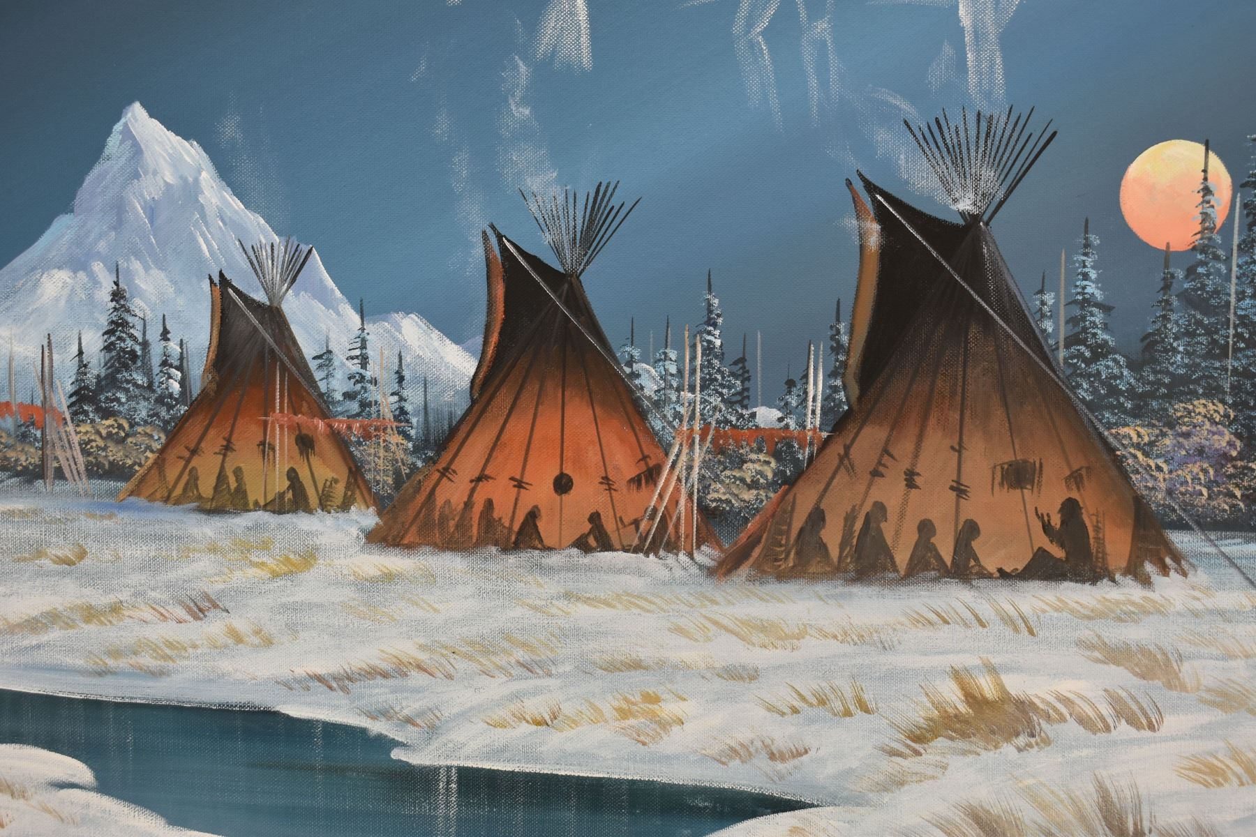 1987 Navajo, original hand painted on canvas depicting Natives in Tipis by Johnny Yazzie, 23.5" x 29.5" framed to 27.75" x 33.75"