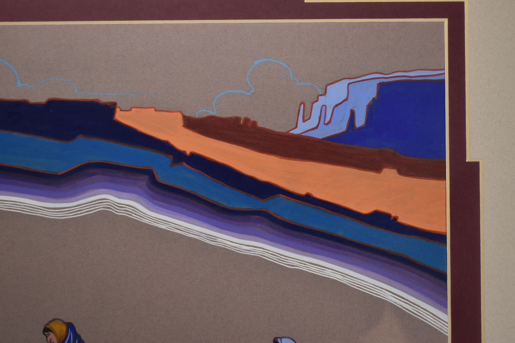 1980-90's Navajo, original hand painted depicting Navajo women on horseback by Justin Tso 14" x 20" matted and framed to 25" x 31"