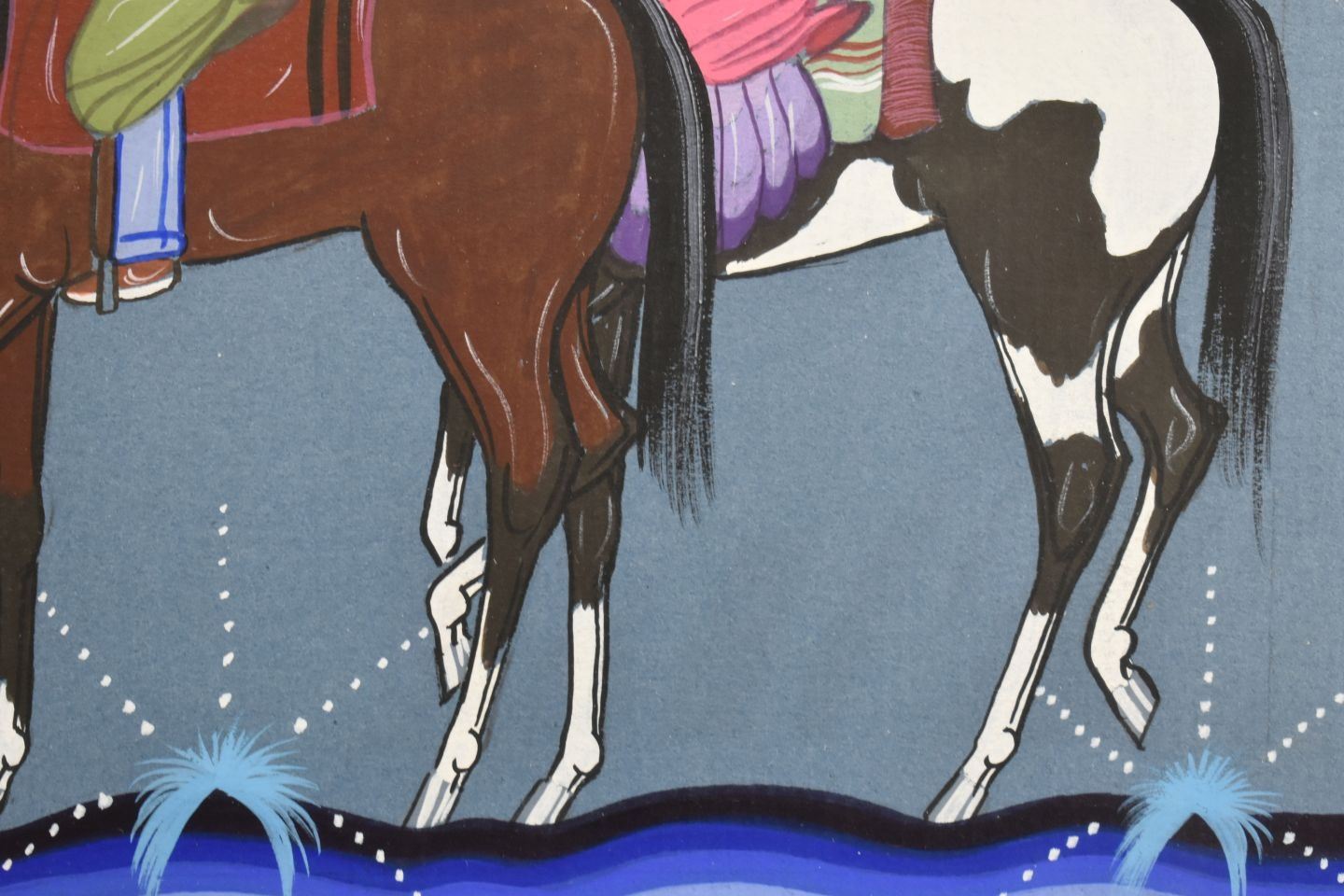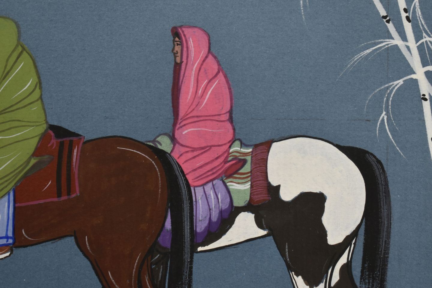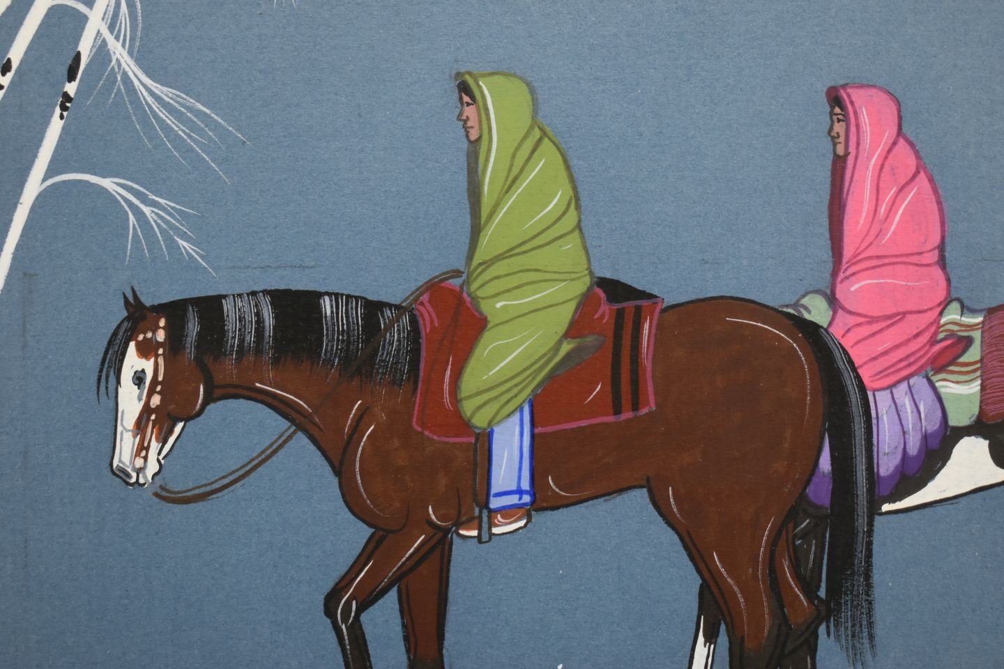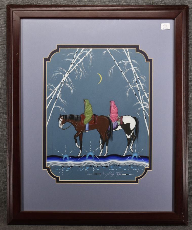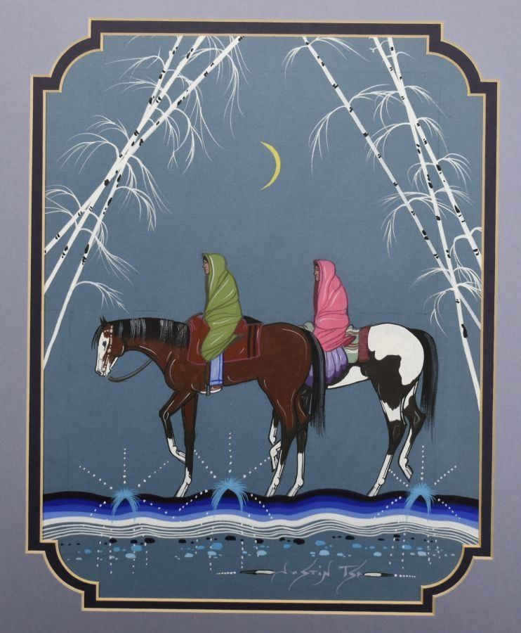 1980-90's Navajo, original hand painted depicting Navajo women on horseback by Justin Tso 13" x 10" matted and framed to 23" x 19"