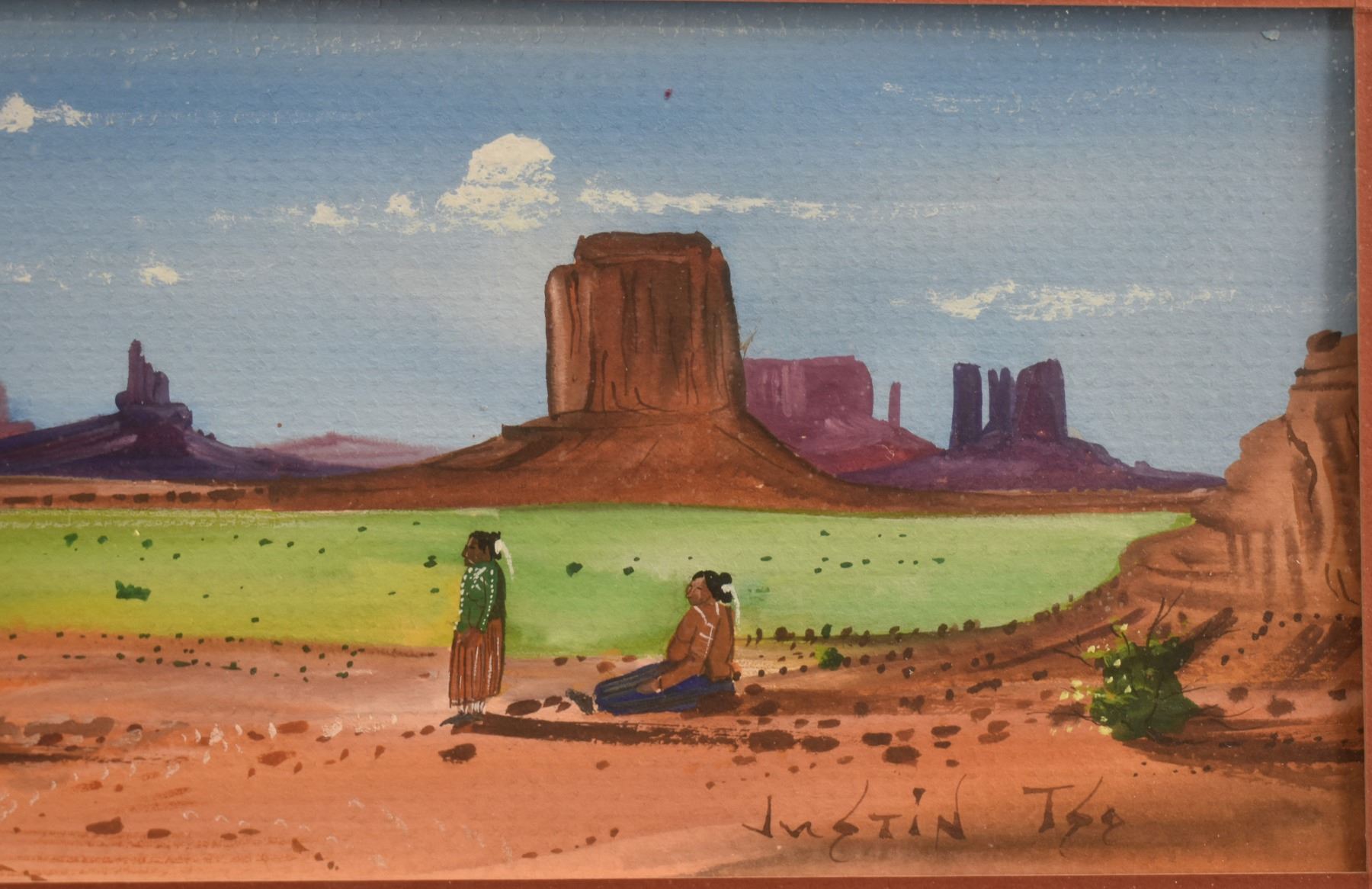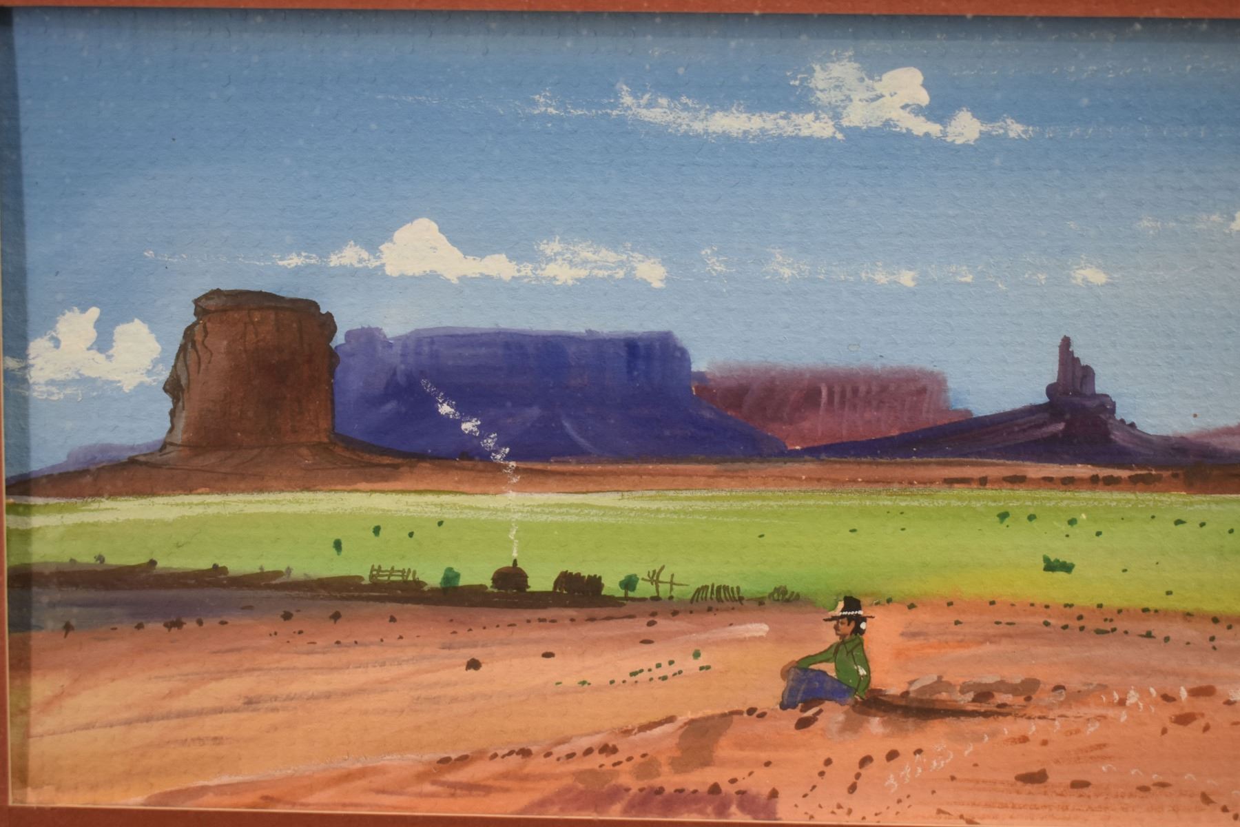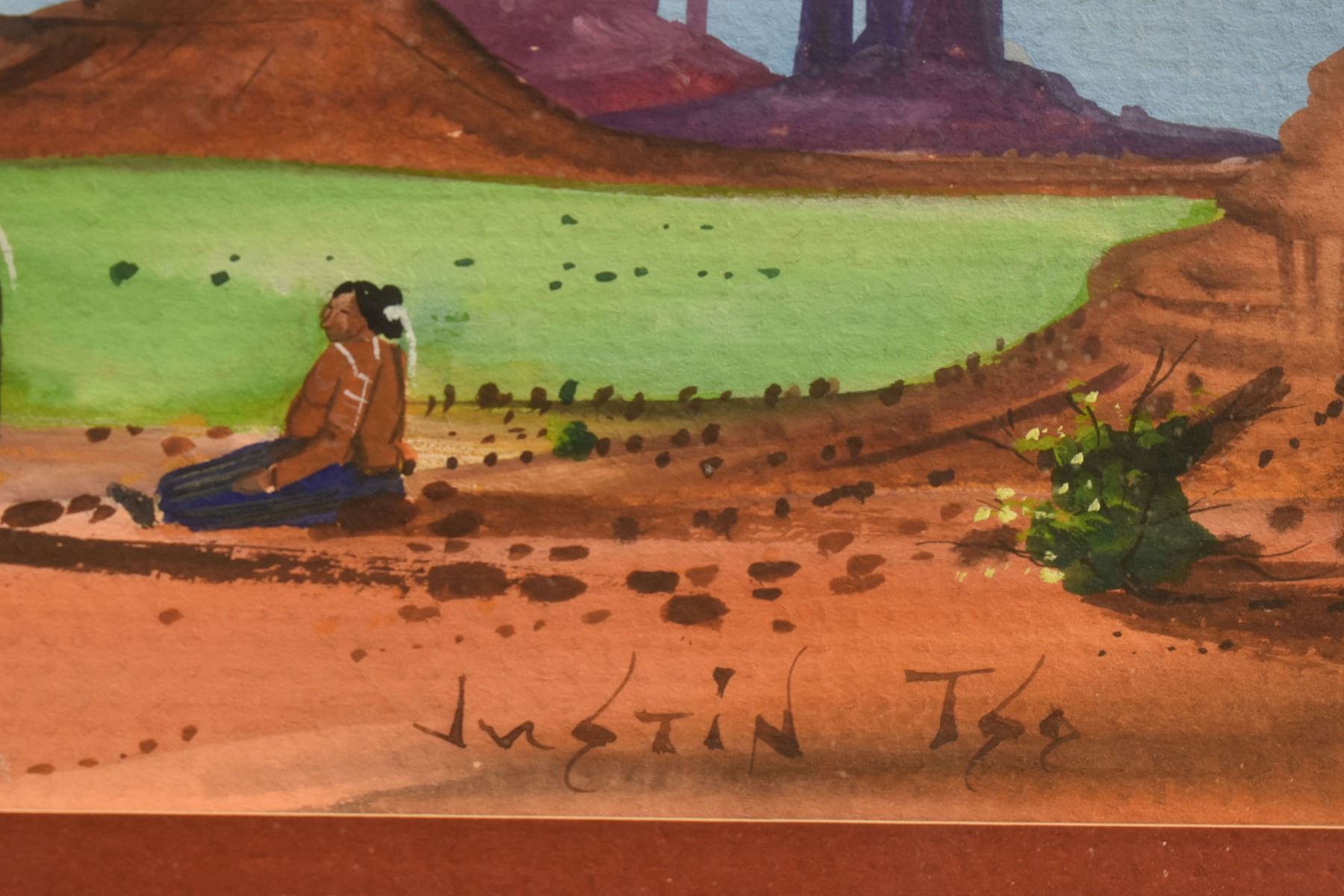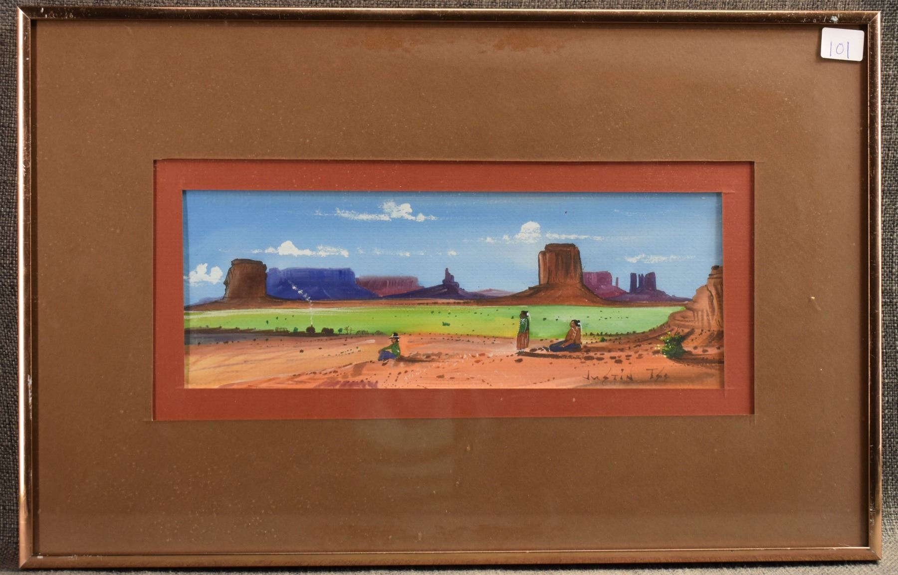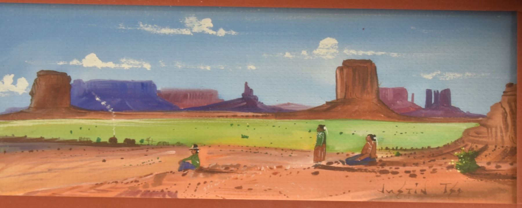 1980's Navajo. Original on paper depicting Monument Valley. Signed Justin Tso. 4'' x 11'' frame size 11'' x 17''