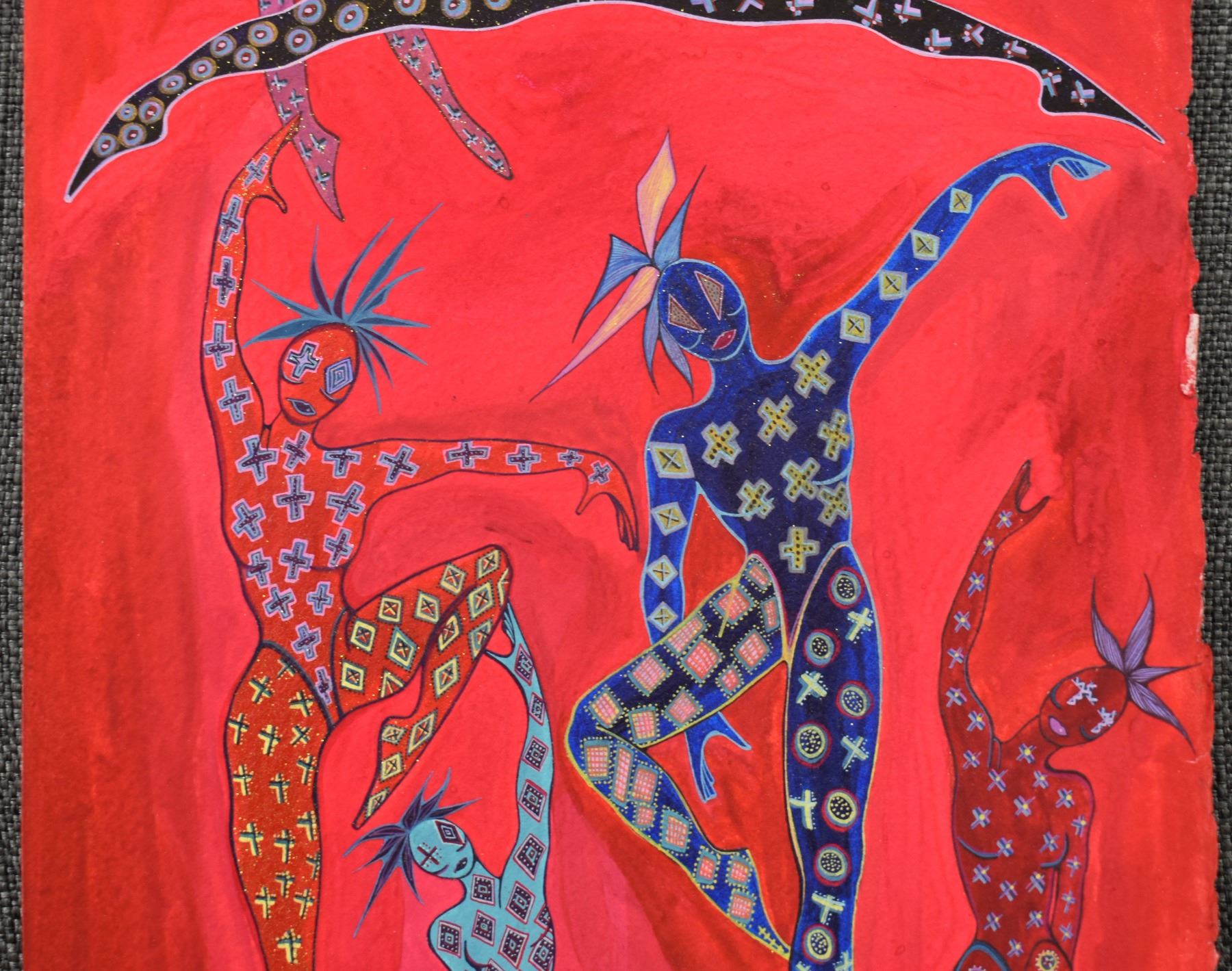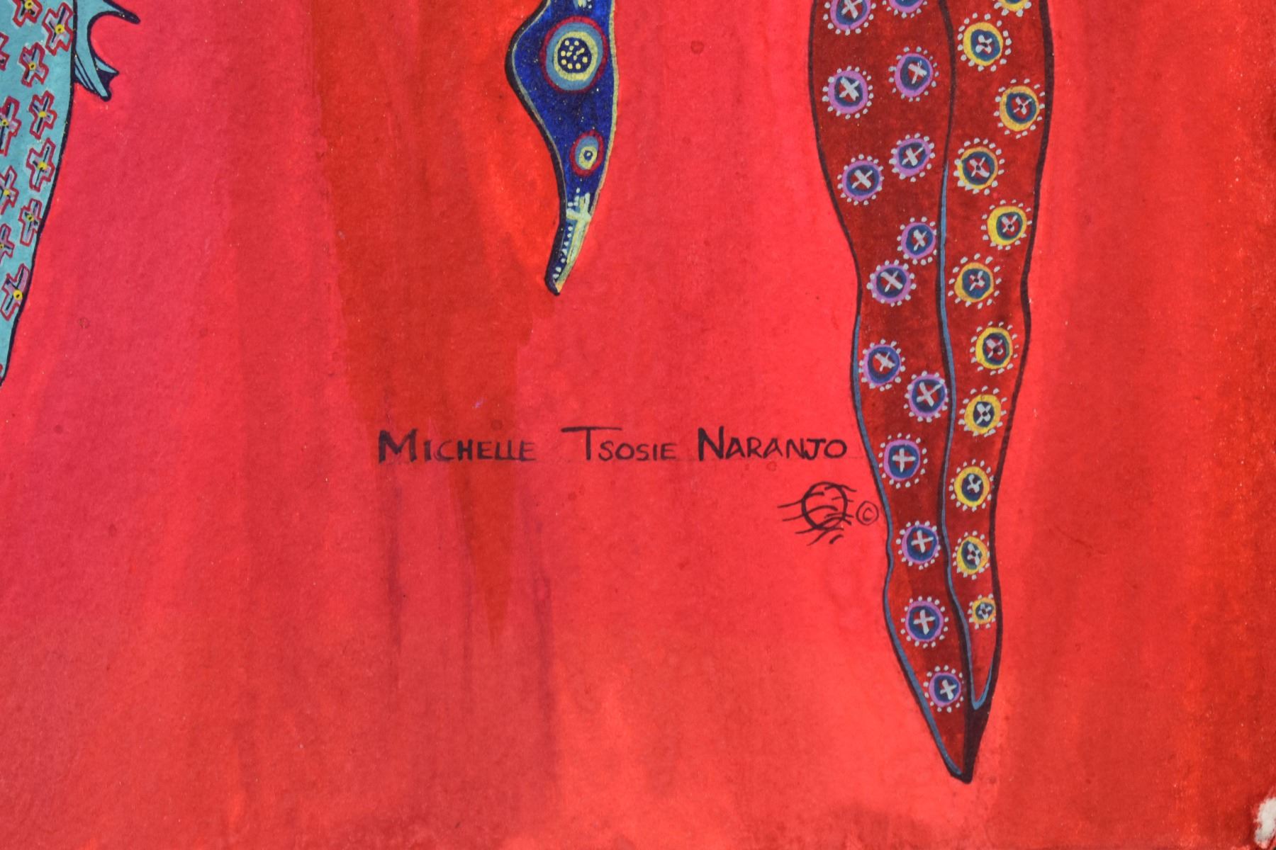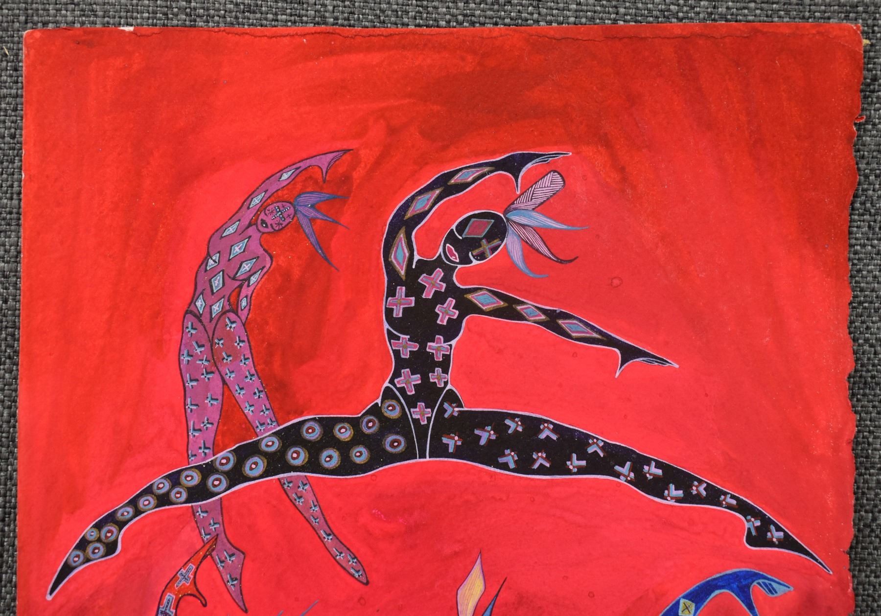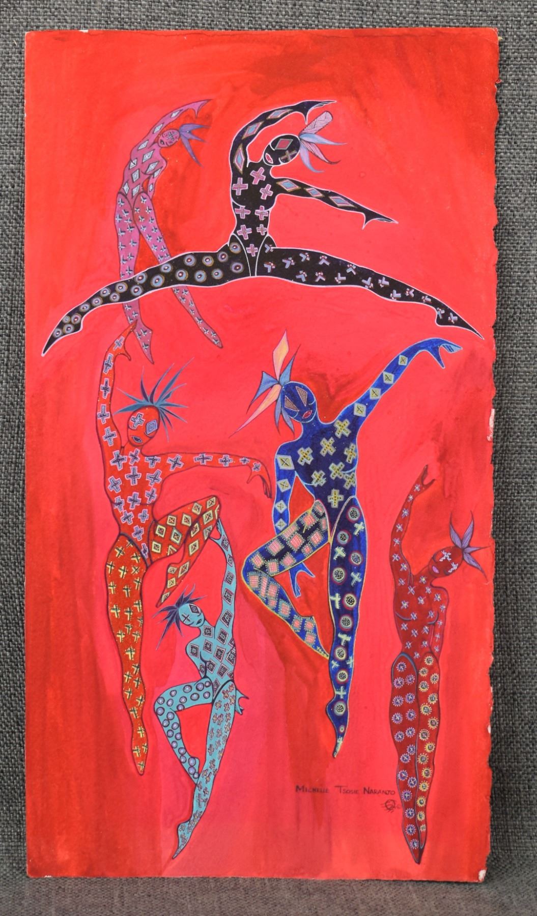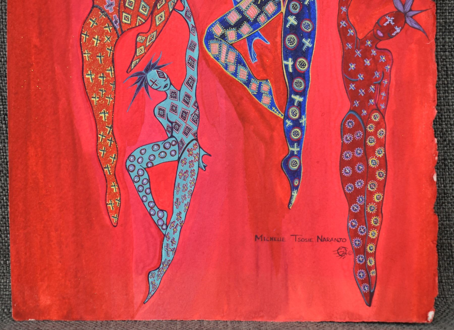 1980's Navajo. Original on paper depicting Dancers, signed Michell Tsosie Naranjo. 15'' x 8''