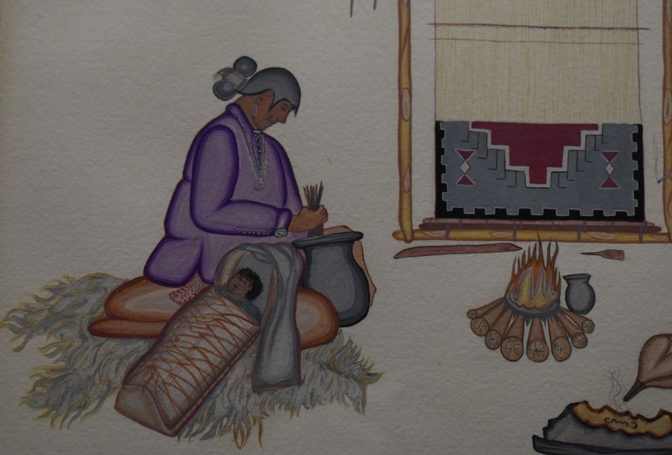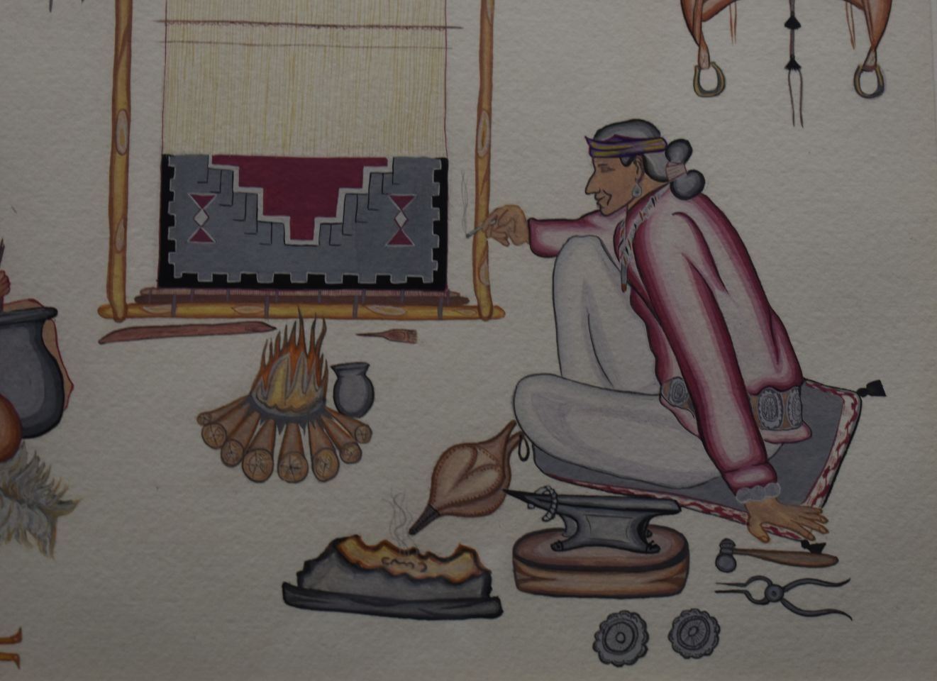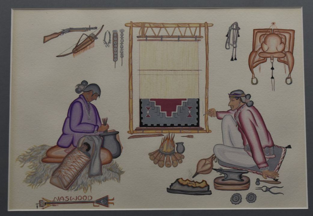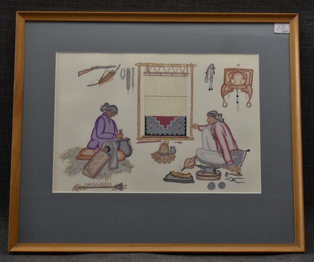 1950-60's Navajo, original hand painted on paper by Naswood 8" x 11.5" matted and framed to 13.5" x 16"